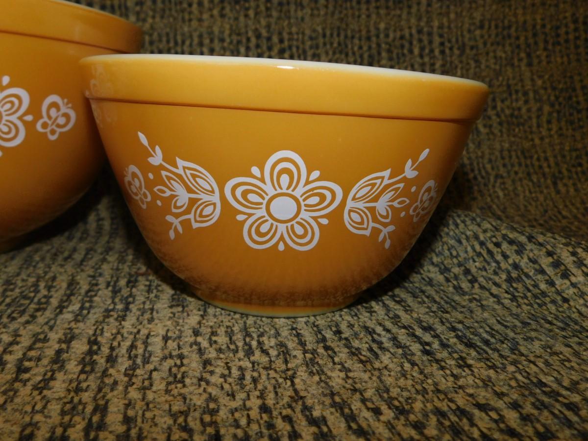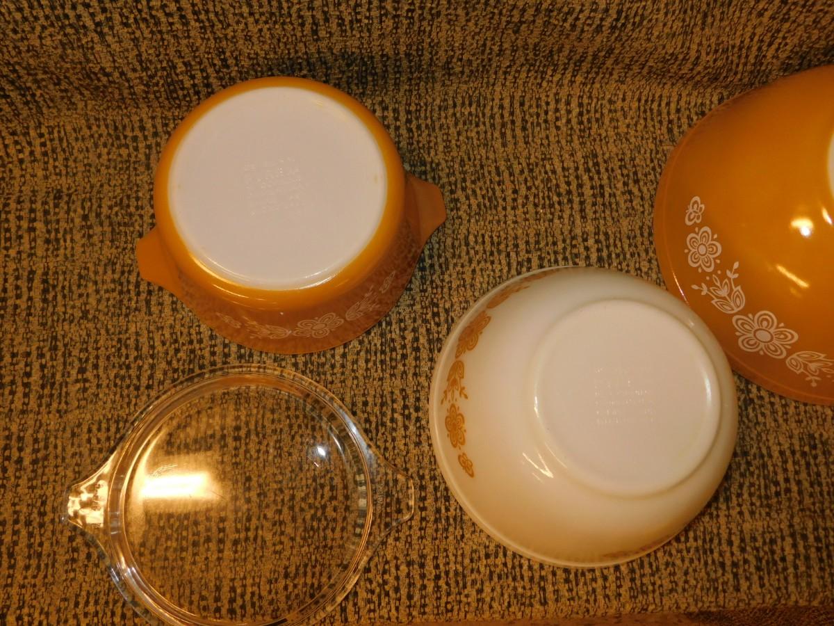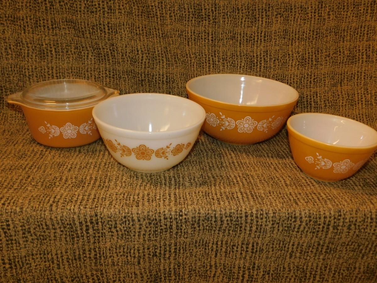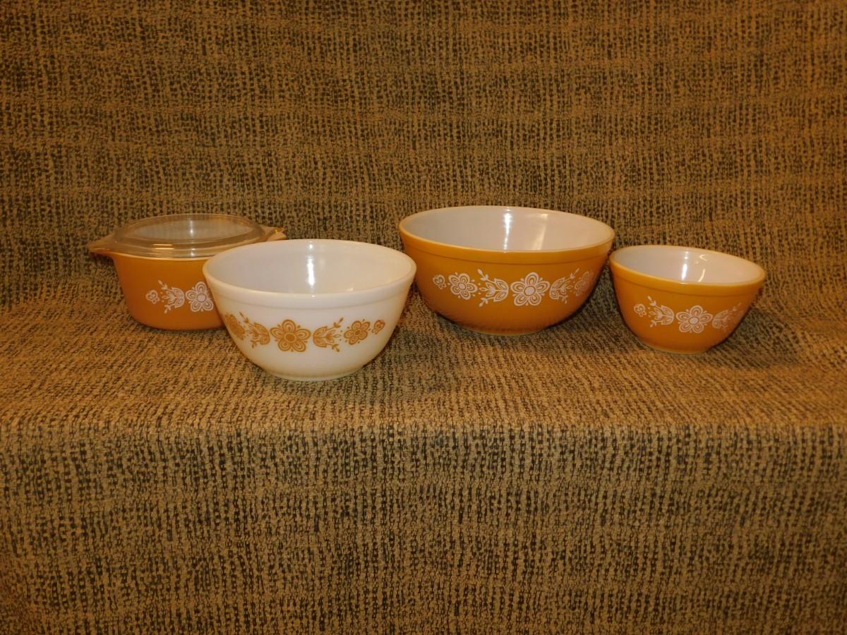 Vintage PYREX “Butterfly Gold” Mixing Bowls & Covered Dish w/ Lid