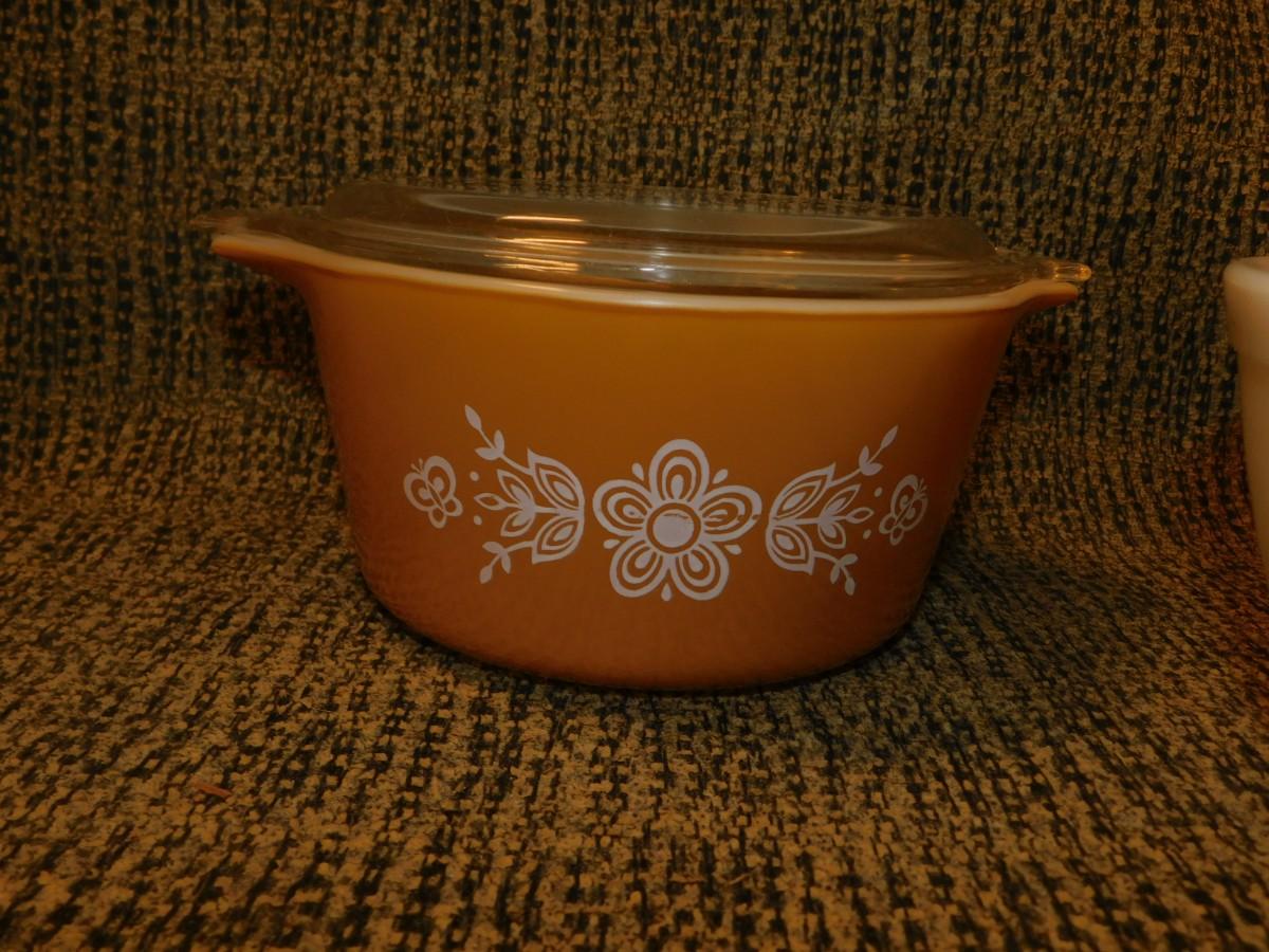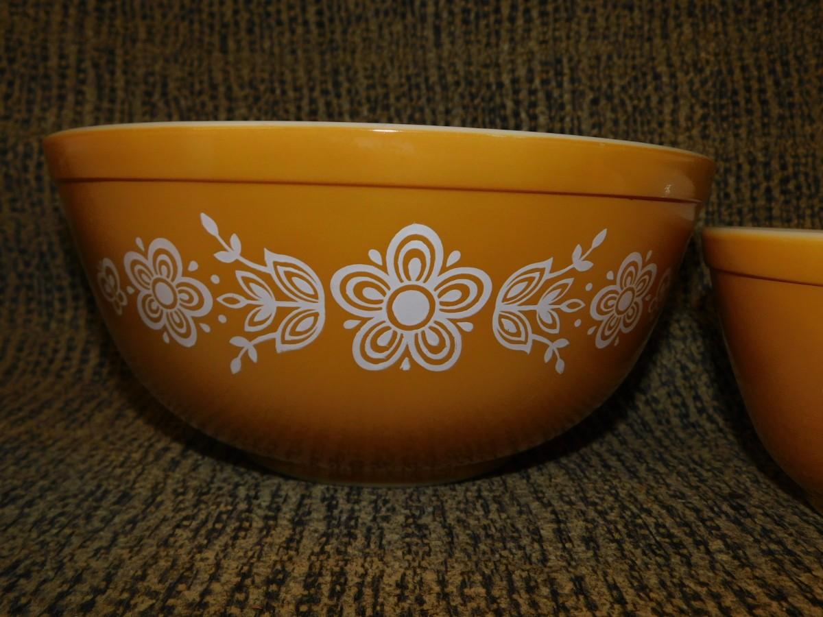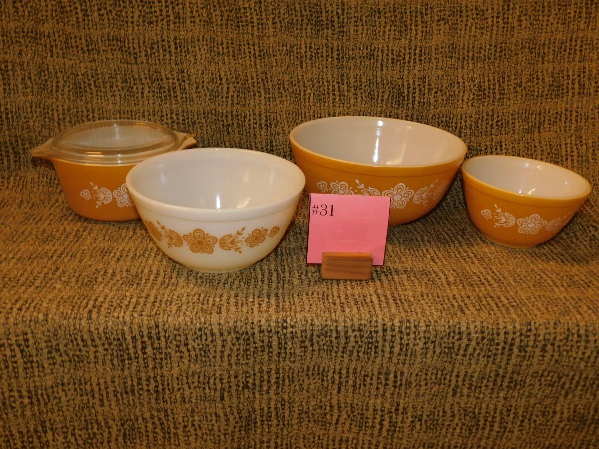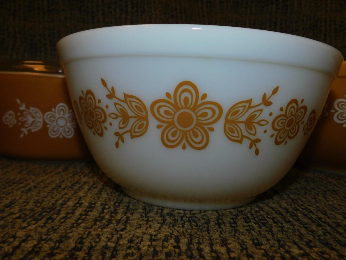 Vintage PYREX “Butterfly Gold” Mixing Bowls & Covered Dish w/ Lid
