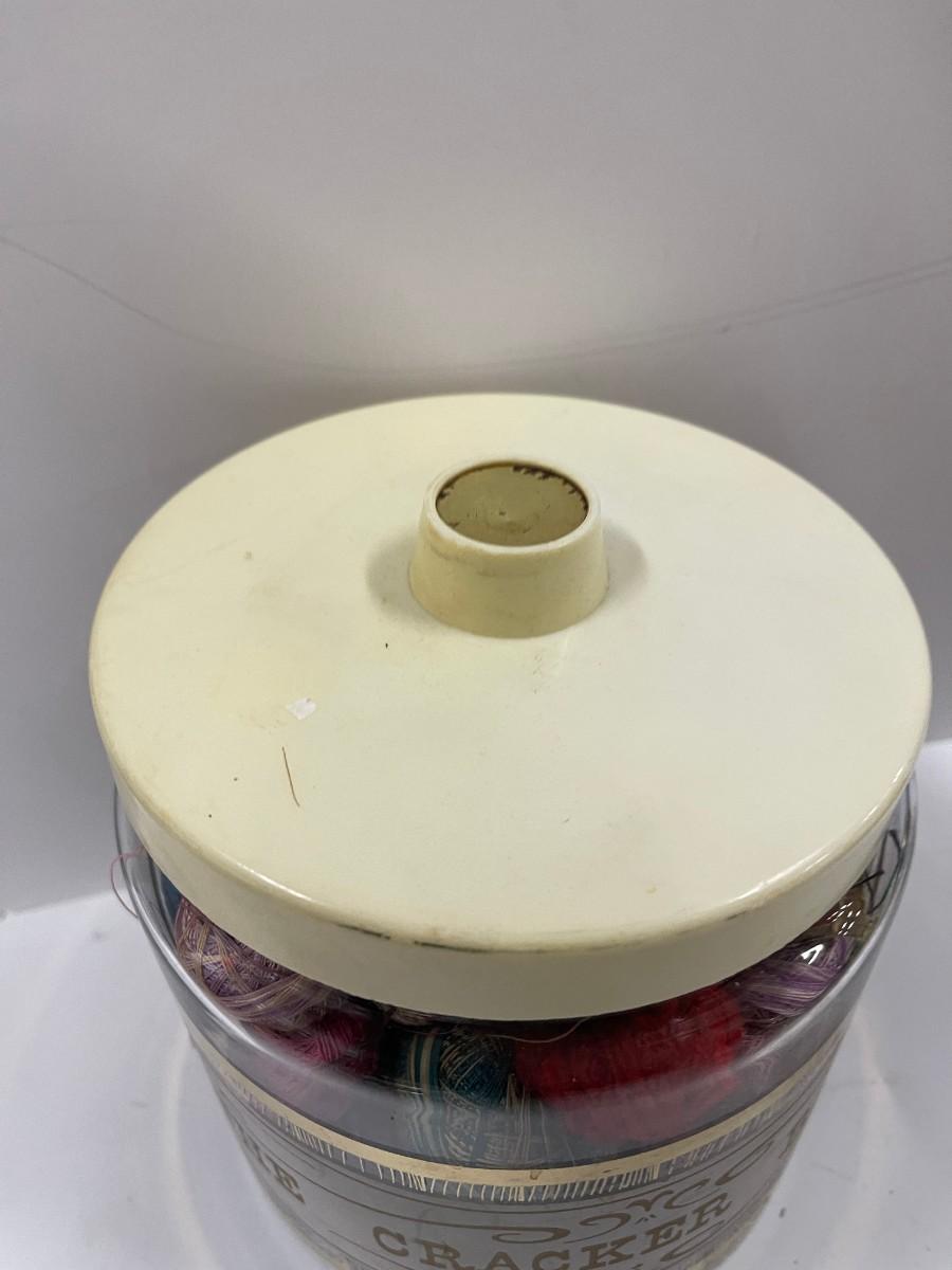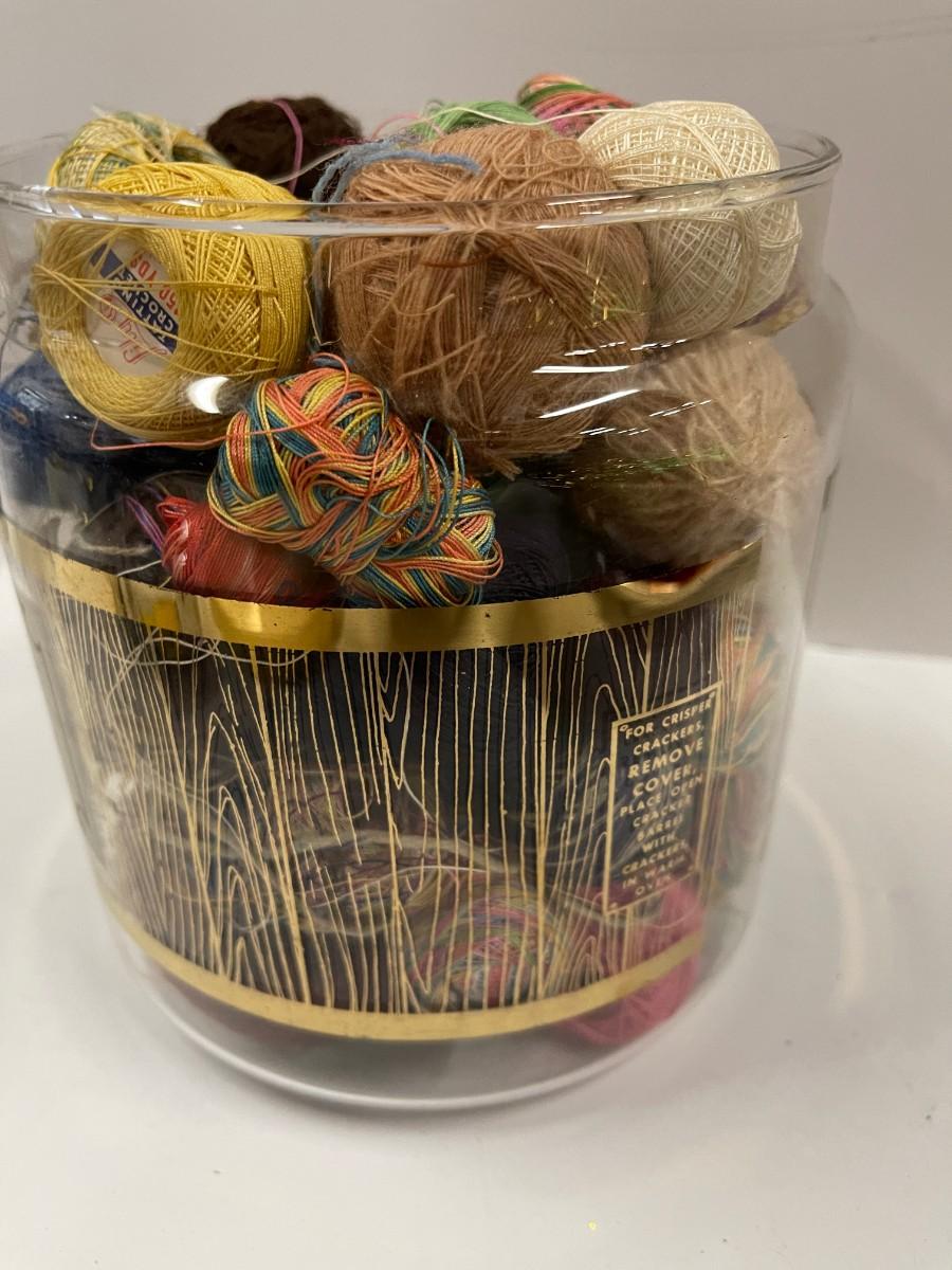 Vintage Pyrex Cracker Barrel Full of Fine Cotton Yarn/Embroidery Floss. Approx 7" to top of lid.