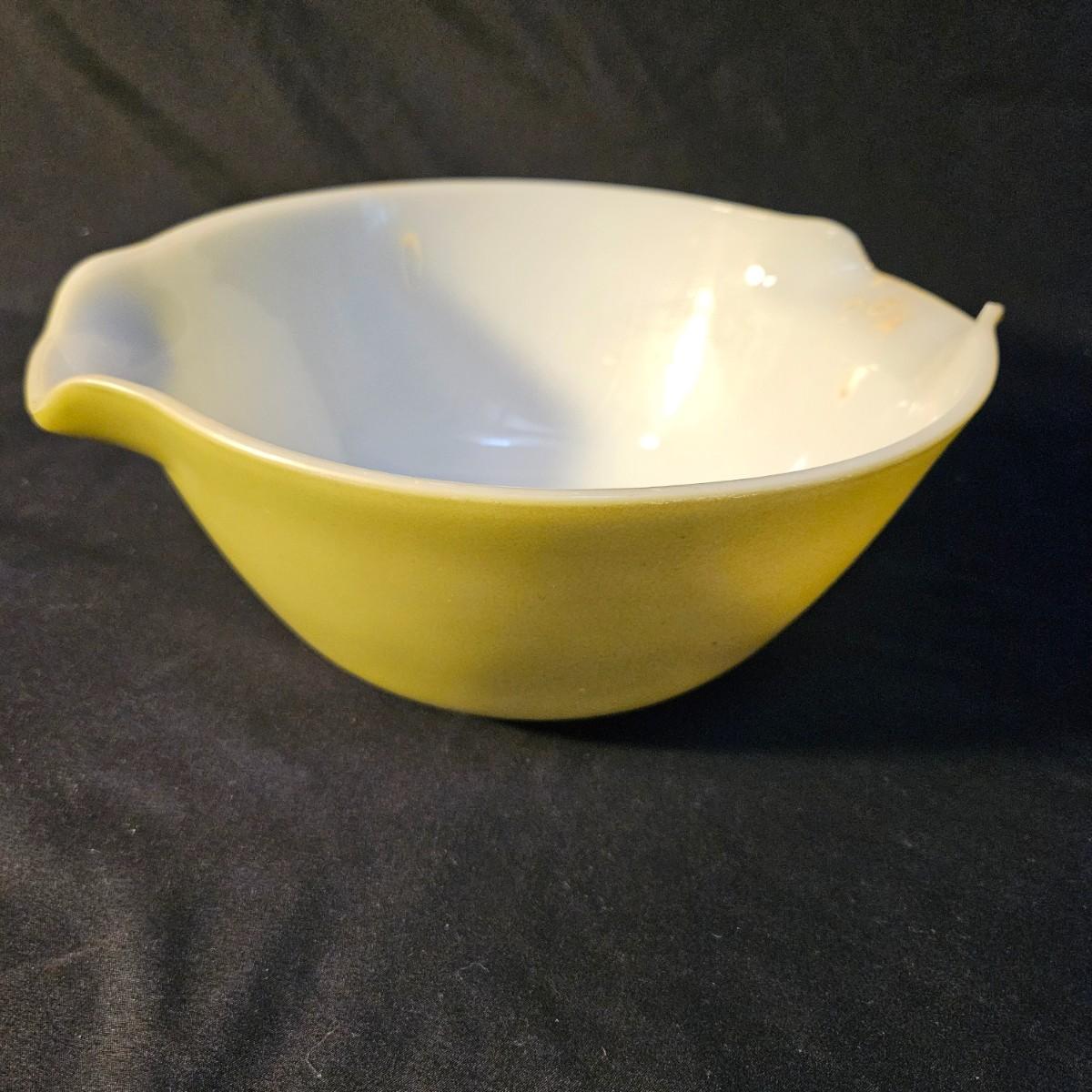 An assortment of five vintage glass bowls by Pyrex, FireKing and GlassBake. The largest yellow bowl measures approximately 10.5" x 4.5"H. Some overall wear. Please see photos for details. Shipping available