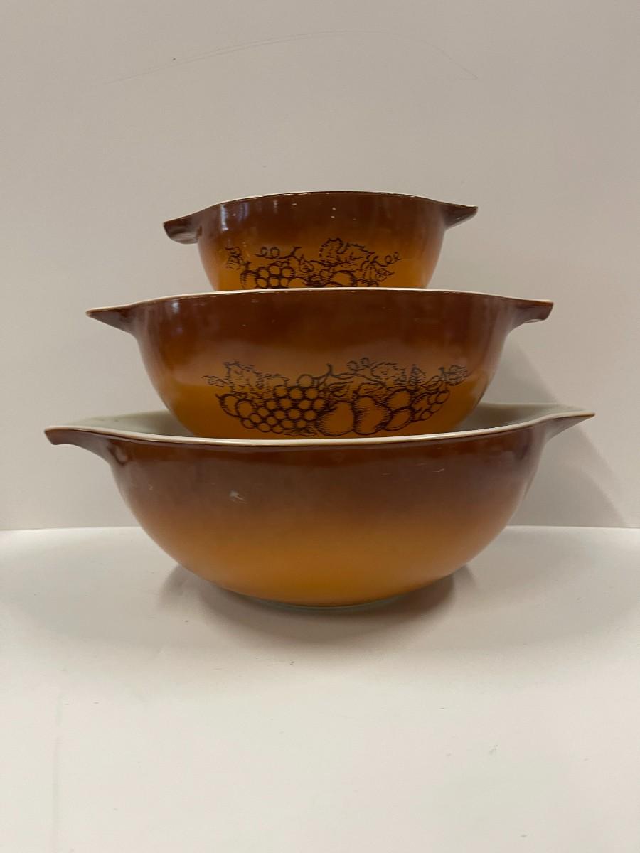 Lot of 3 Vintage Pyrex Old Orchard Fruit nesting bowls. Missing one bowl (the second to smallest bowl is missing). All in very good condition.