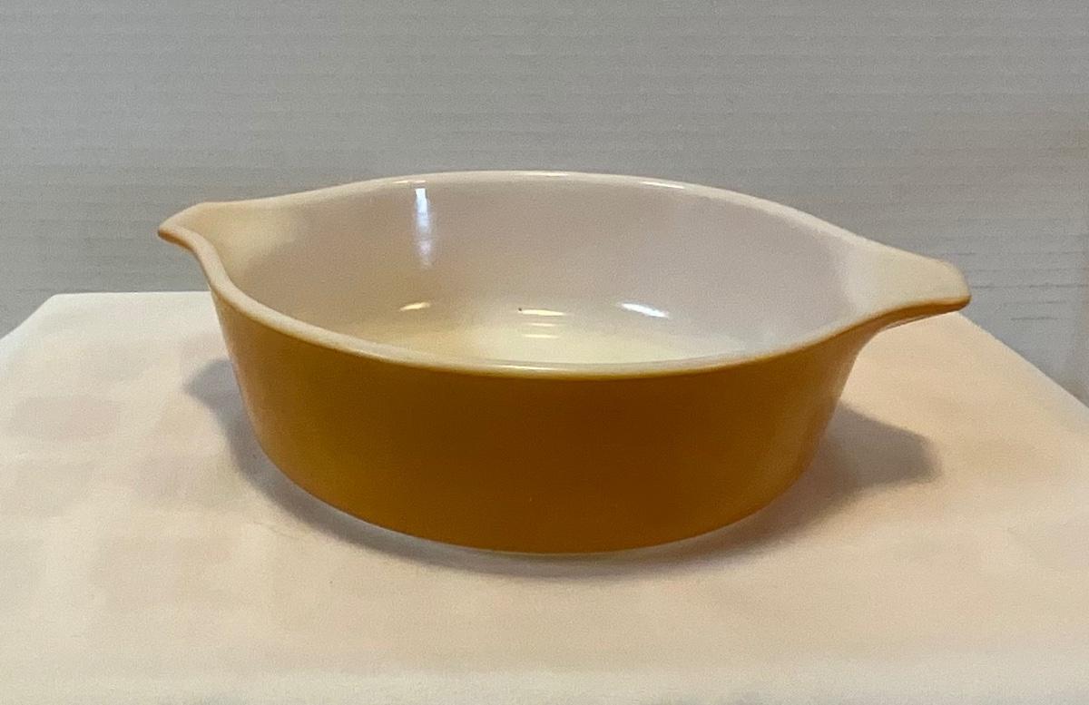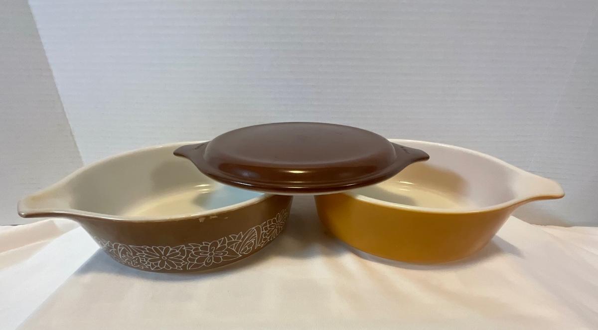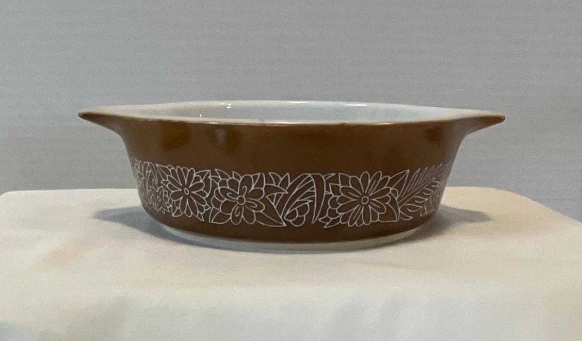 Vintage Pyrex 471 Old Orchard Harvest Brown/Tan, Woodland Round Casserole dishes. Cover fits both