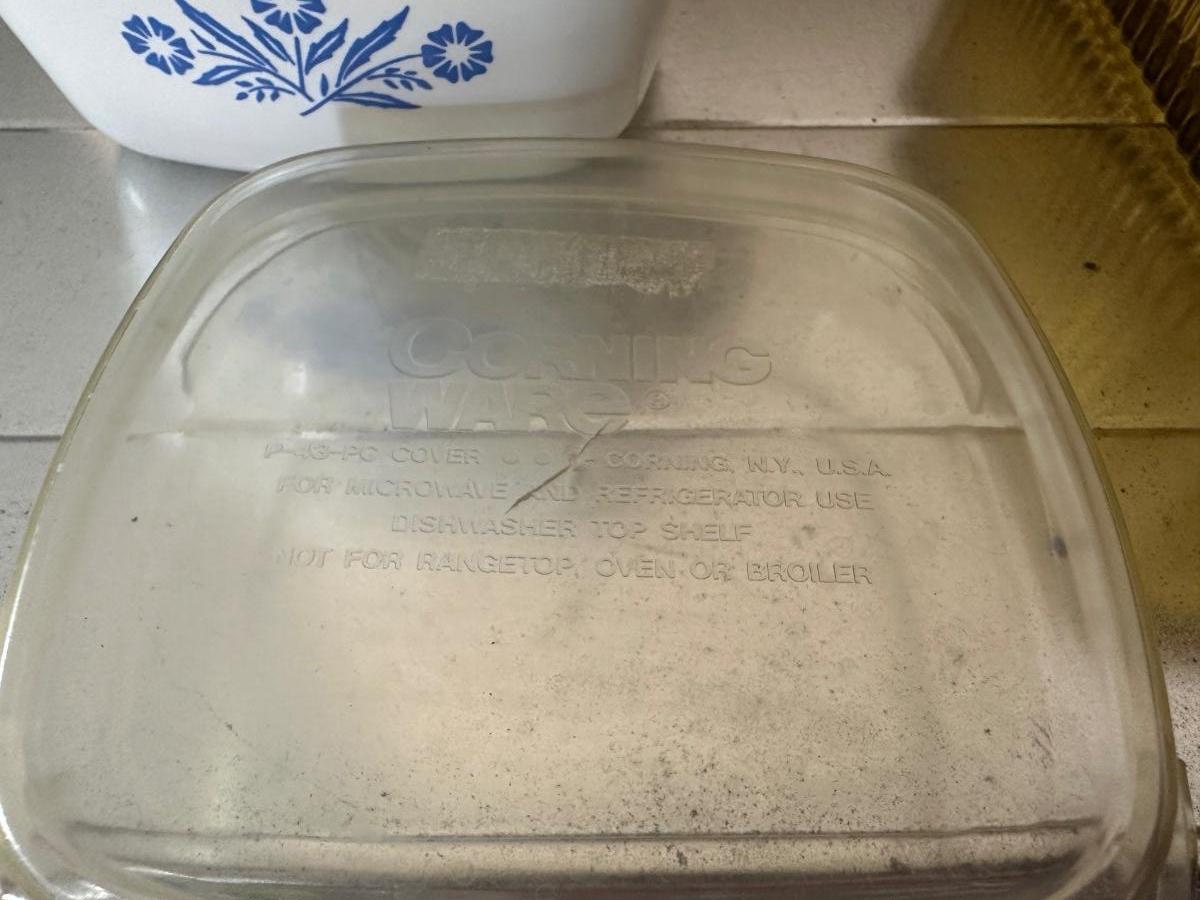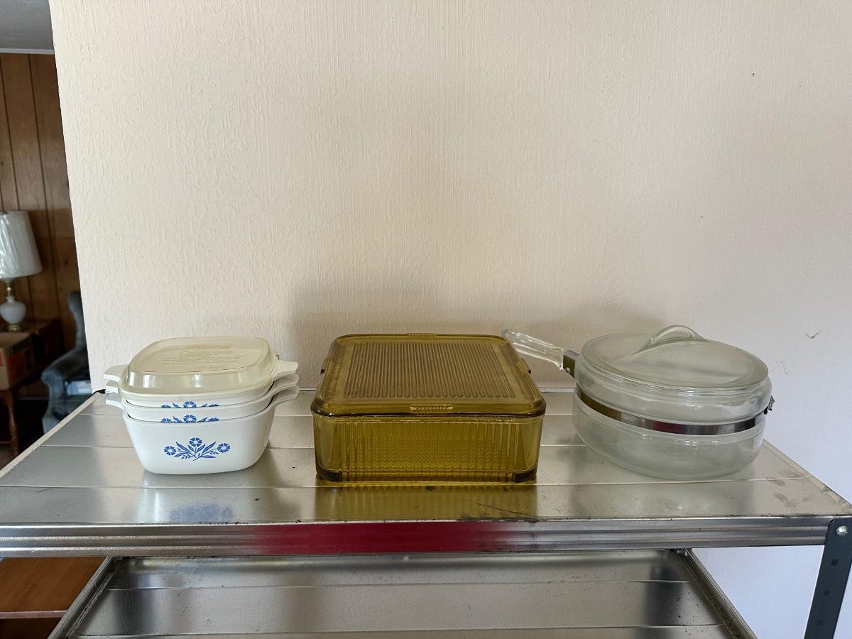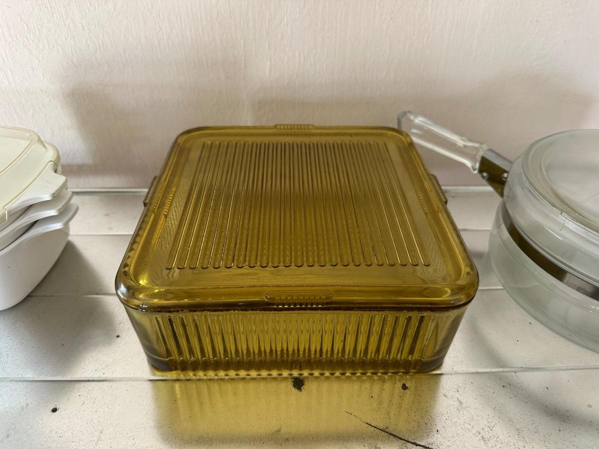 VINTAGE PYREX POT, CORNING WARE CONTAINERS AND VINTAGE FEDERAL AMBER GLASS REFRIGERATOR BOX