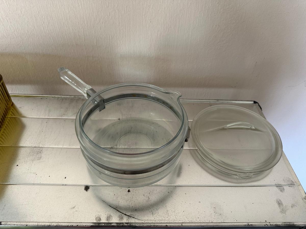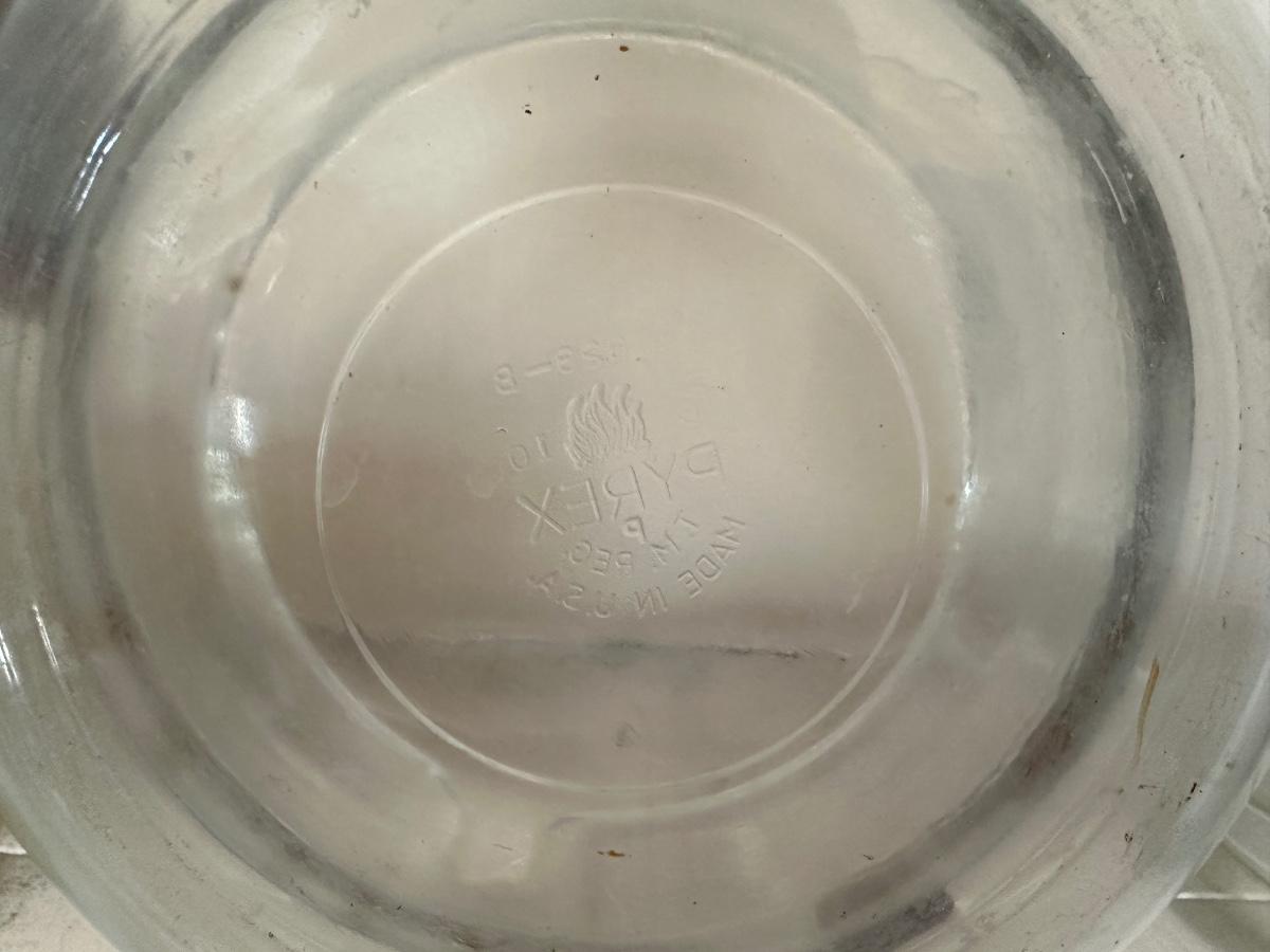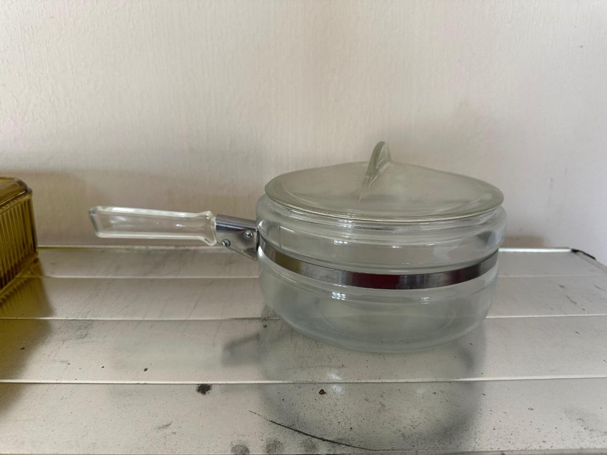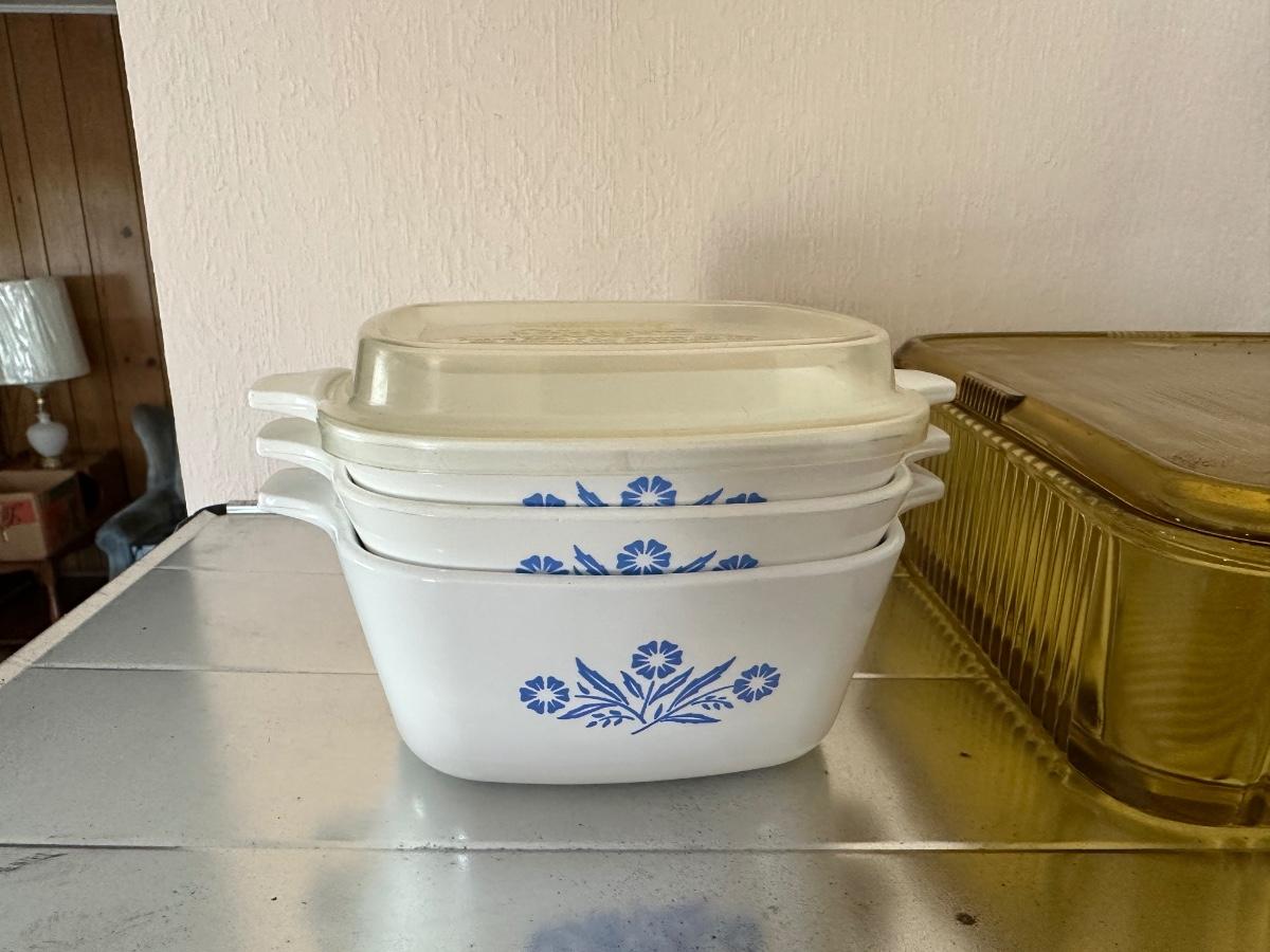 VINTAGE PYREX POT, CORNING WARE CONTAINERS AND VINTAGE FEDERAL AMBER GLASS REFRIGERATOR BOX