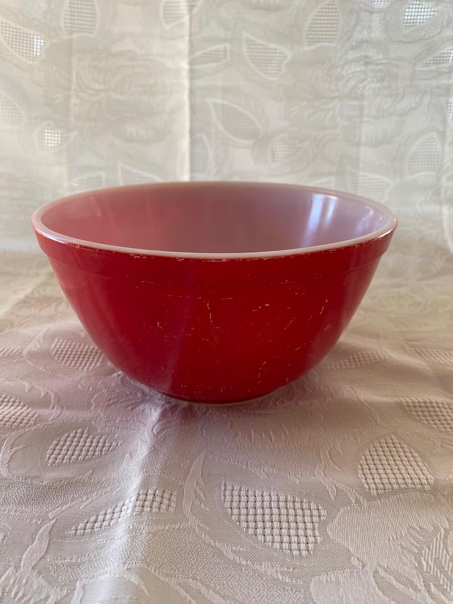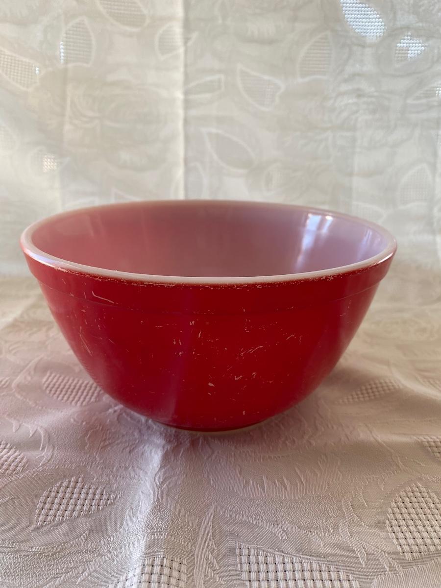 Vintage Pyrex red bowl. Has a few scratches. 7”dia