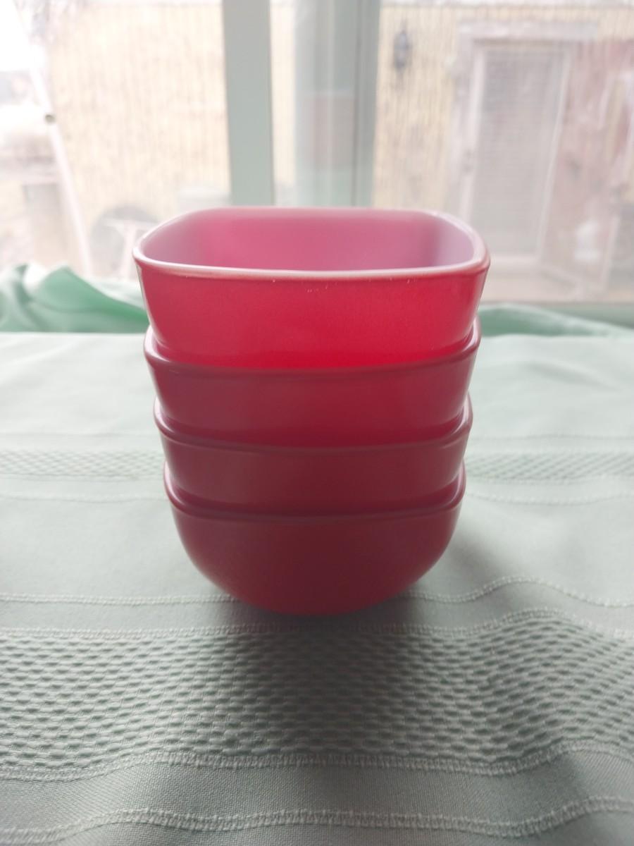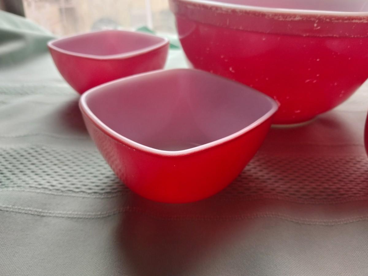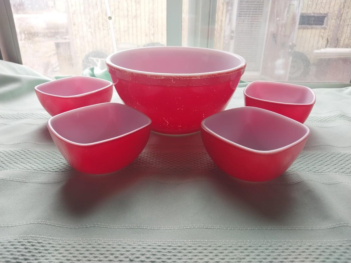 VINTAGE PYREX SERVING BOWL AND FOUR MATCHING RECTANGLER BOWLS