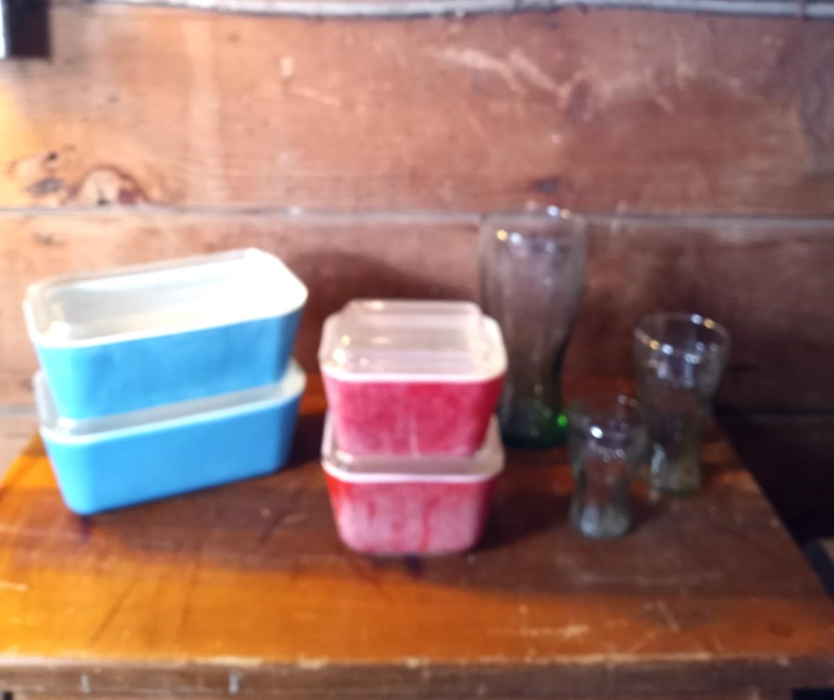 VINTAGE PYREX WITH LIDS AND COKE DRINKING GLASSES