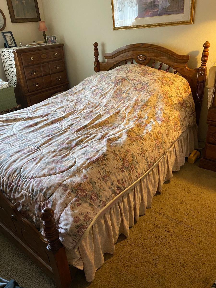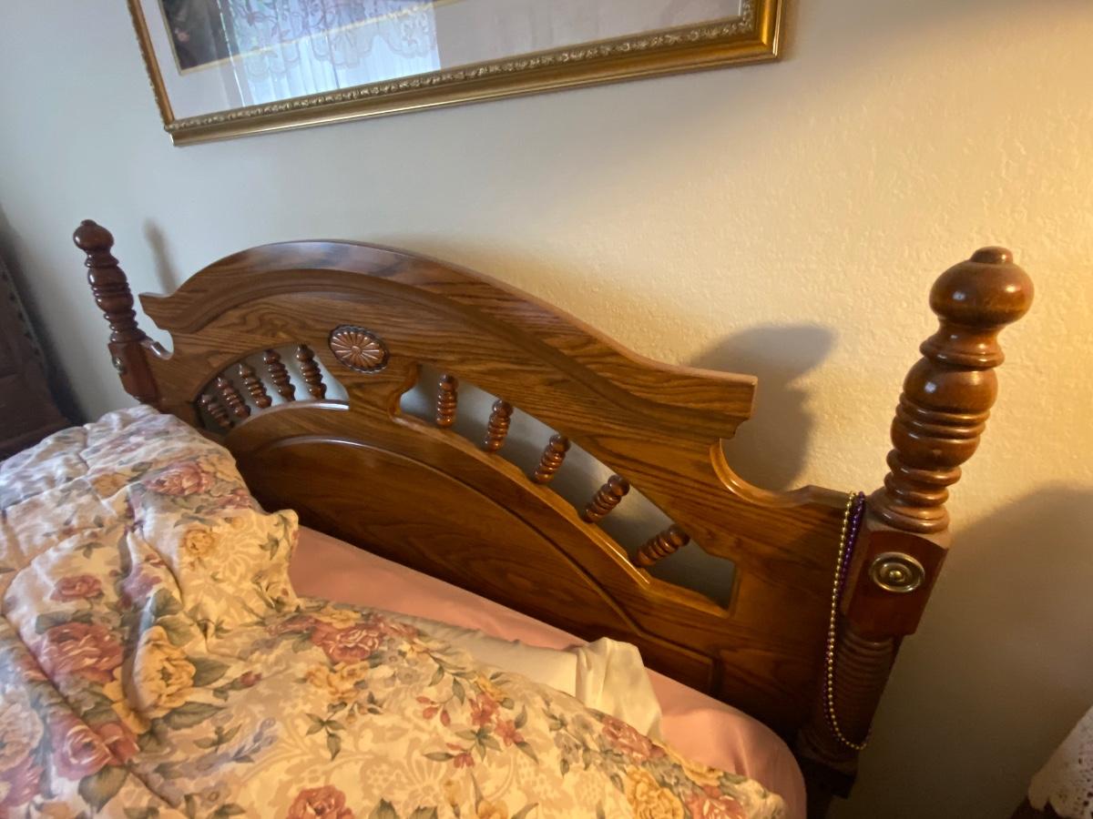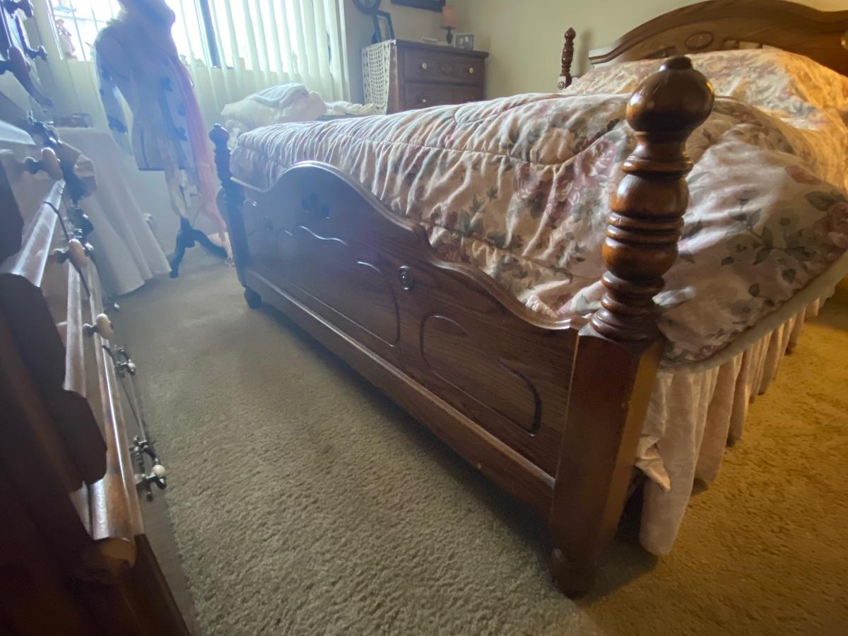 Vintage Queen Size Bed Headboard Footboard Mattress. Bedding not included. Mattress is 5 years old according to owner. In good condition. Bed has metal rails connecting headboard and footboard. **Off site in Brea, owner downsizing. Pick up will be after July 14th, we will schedule with winning bidders after that date.**