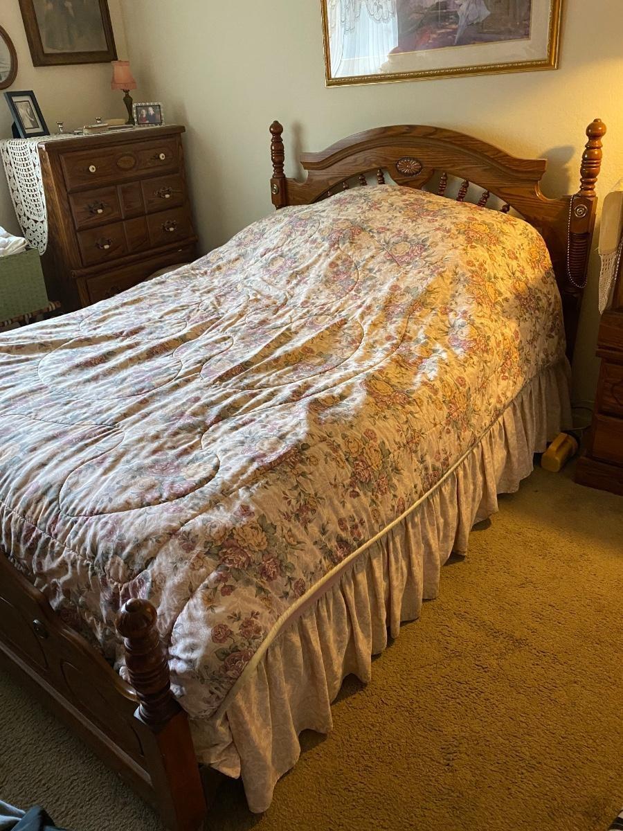 Vintage Queen Size Bed Headboard Footboard Mattress. Bedding not included. Mattress is 5 years old according to owner. In good condition. Bed has metal rails connecting headboard and footboard. **Off site in Brea, owner downsizing. Pick up will be as early as July 22nd at 2pm, must be scheduled before the 29th.**