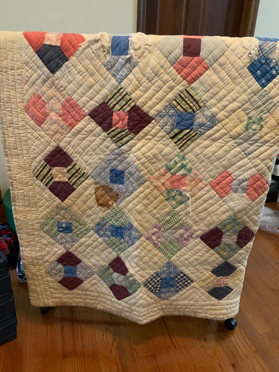 Vintage quilt 68” x 60”. Black pattern. Would make a good cutters quilt as there are many rips, tears and visible stains.