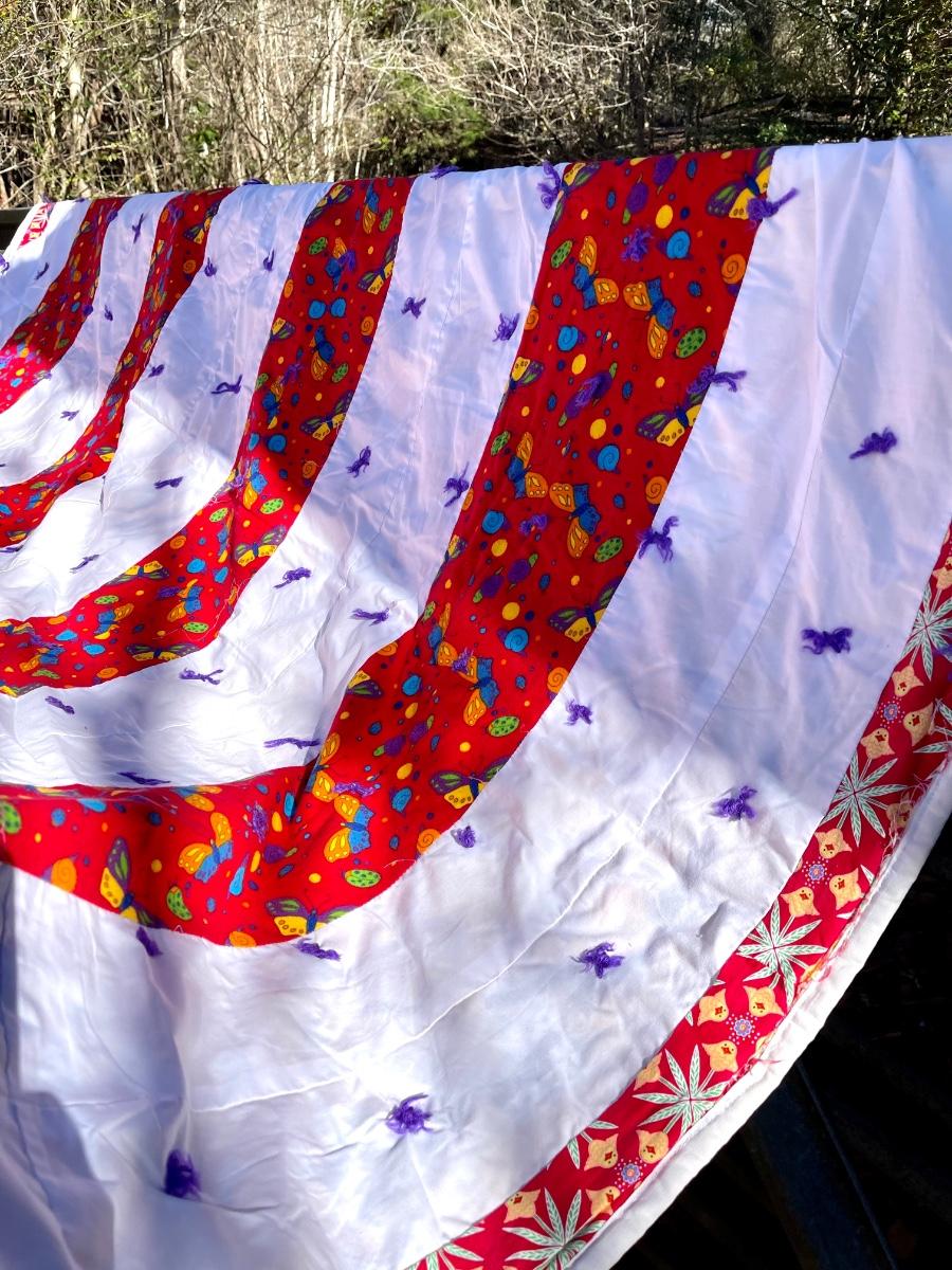 This is so wonderful! Butterflies are the best!! Such a sweet quilt. Measurements in photos. Vintage conditions show some lose threads and a few minor stains. This has not been laundered. I’ll leave that to the buyer. Still, a wonderful find! This one has a little weight to it.