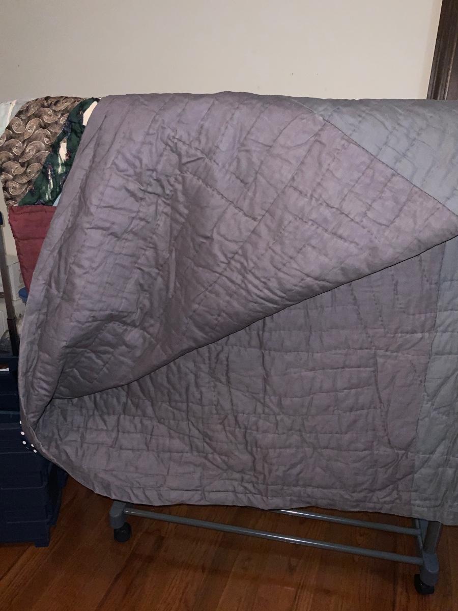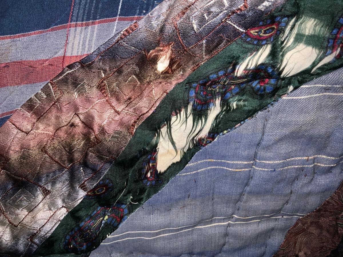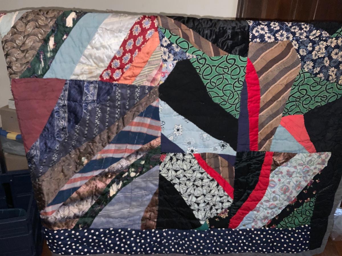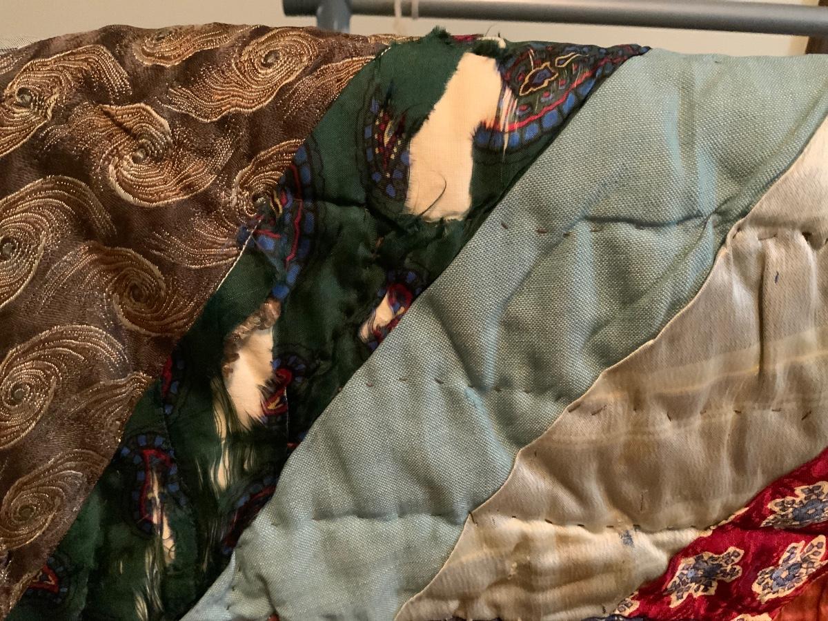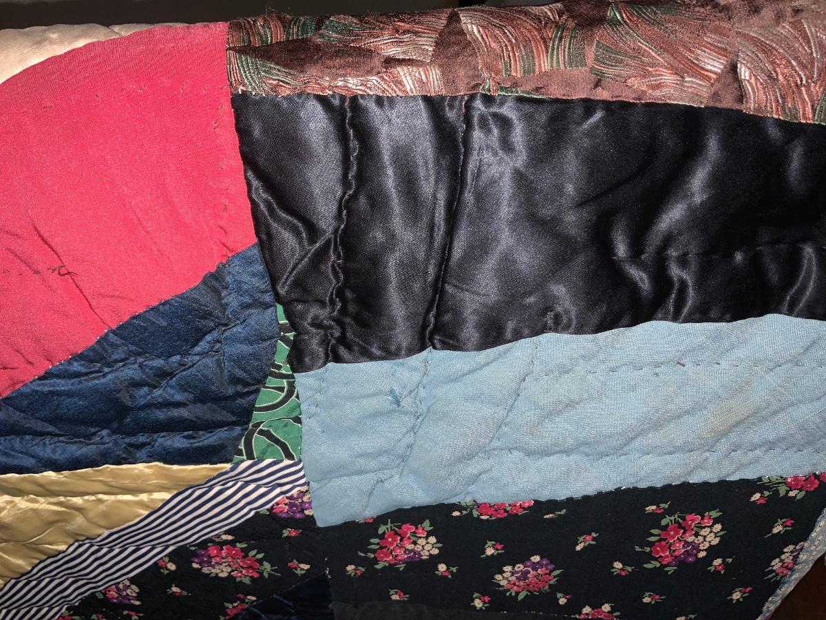 Vintage quilt approximately 52” x 84”. Would make a good cutters quilt as there are several tears in the fabric. Some material is silky Fabric.
