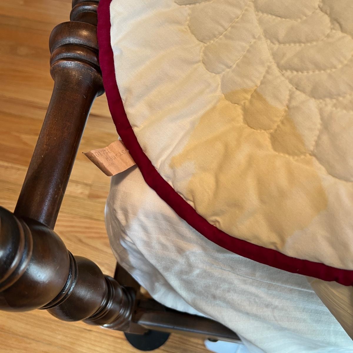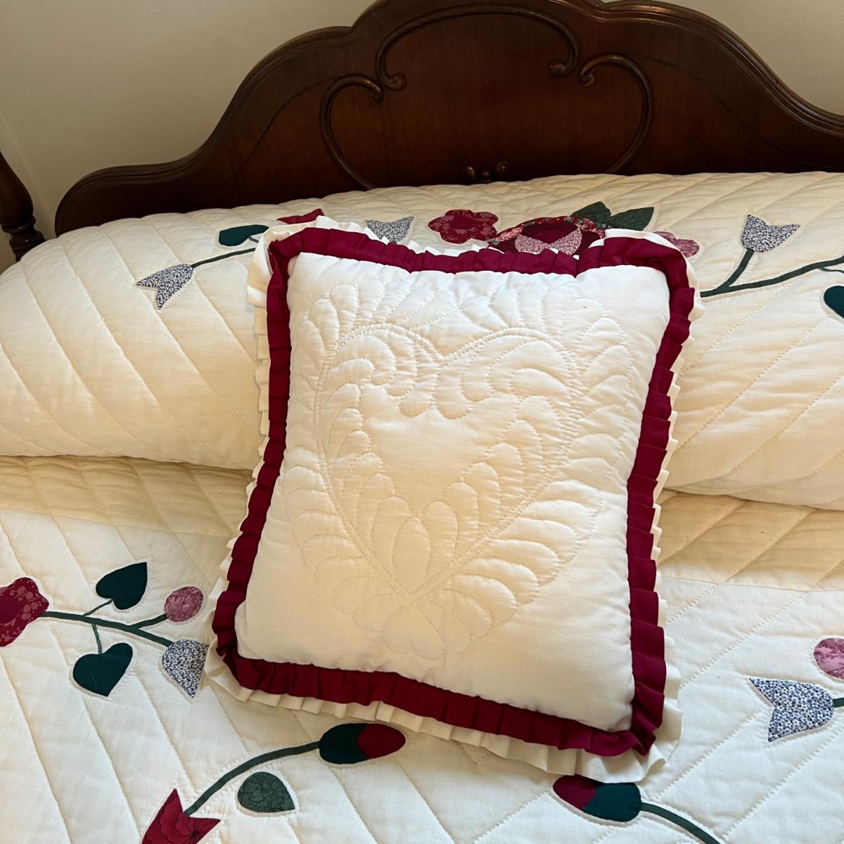 This auction is for the quilt and pillow only. The antique bedframe is for sale in lot 610. See all pics. There is a stain on the edge as shown in the second to last pic.