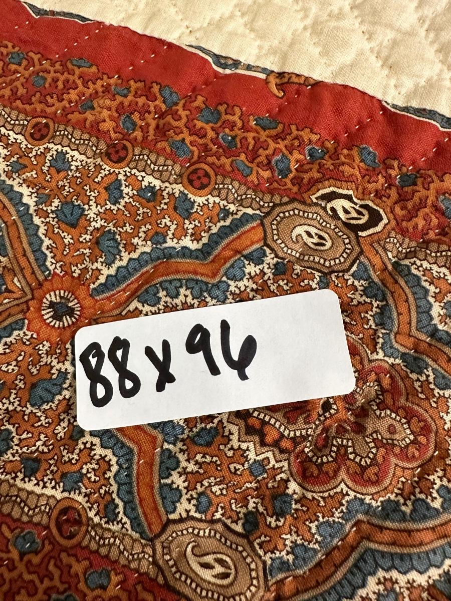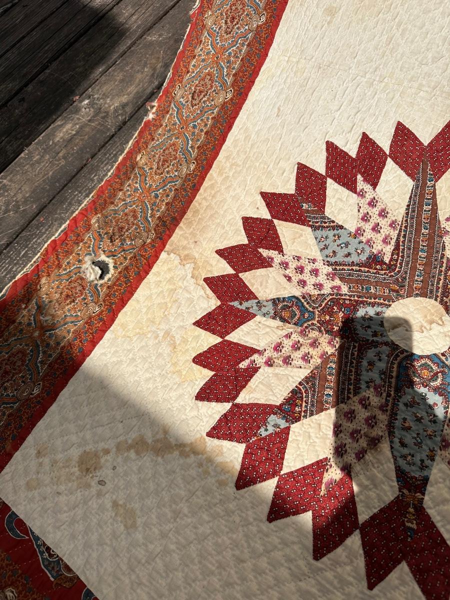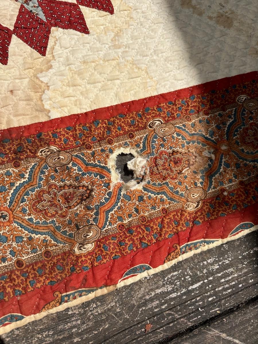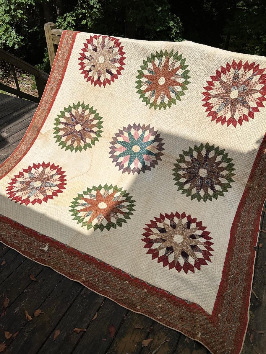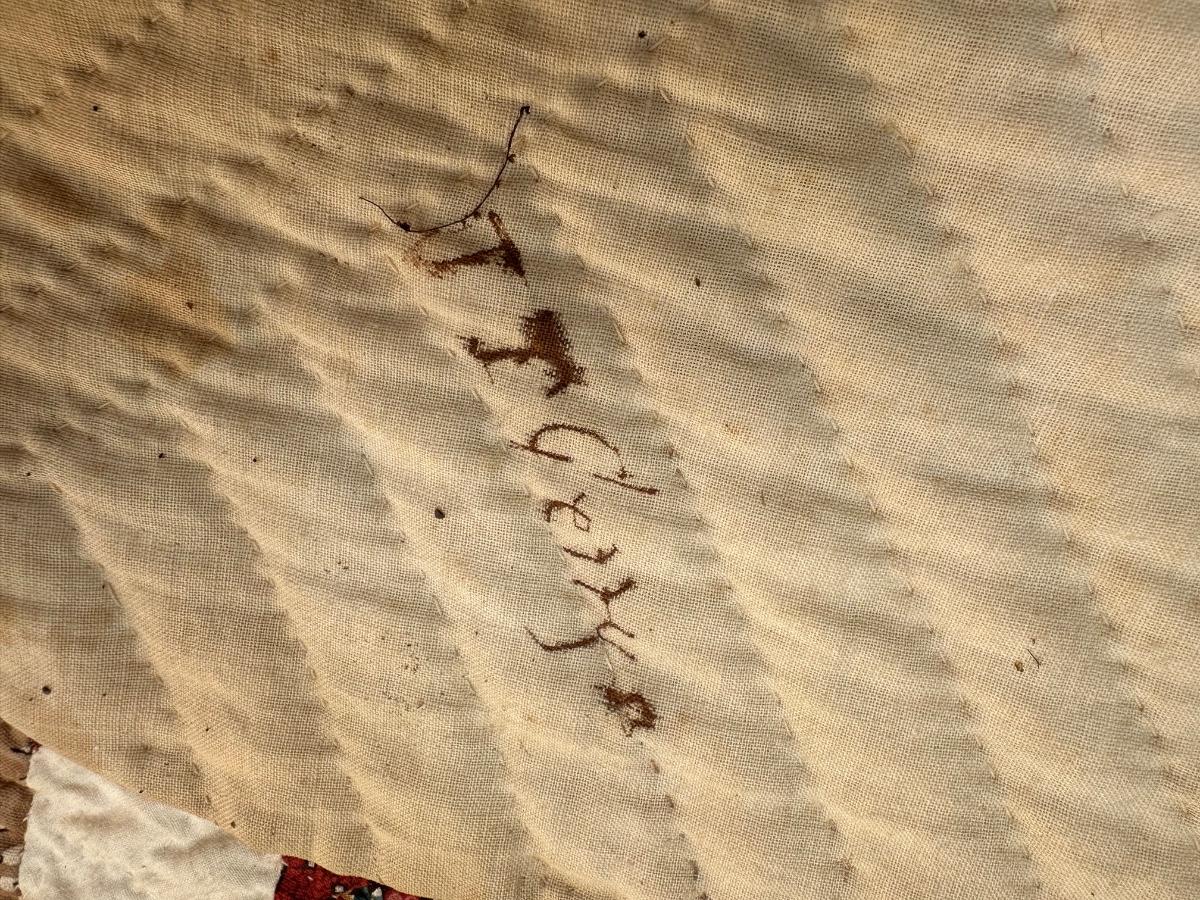 VINTAGE QUILT, TATTERED AND STAINED SIGNED TJ GETTYS 88X96