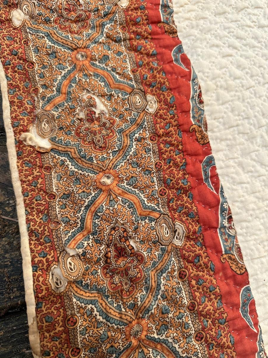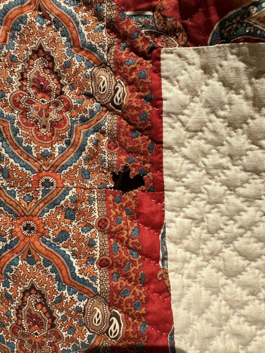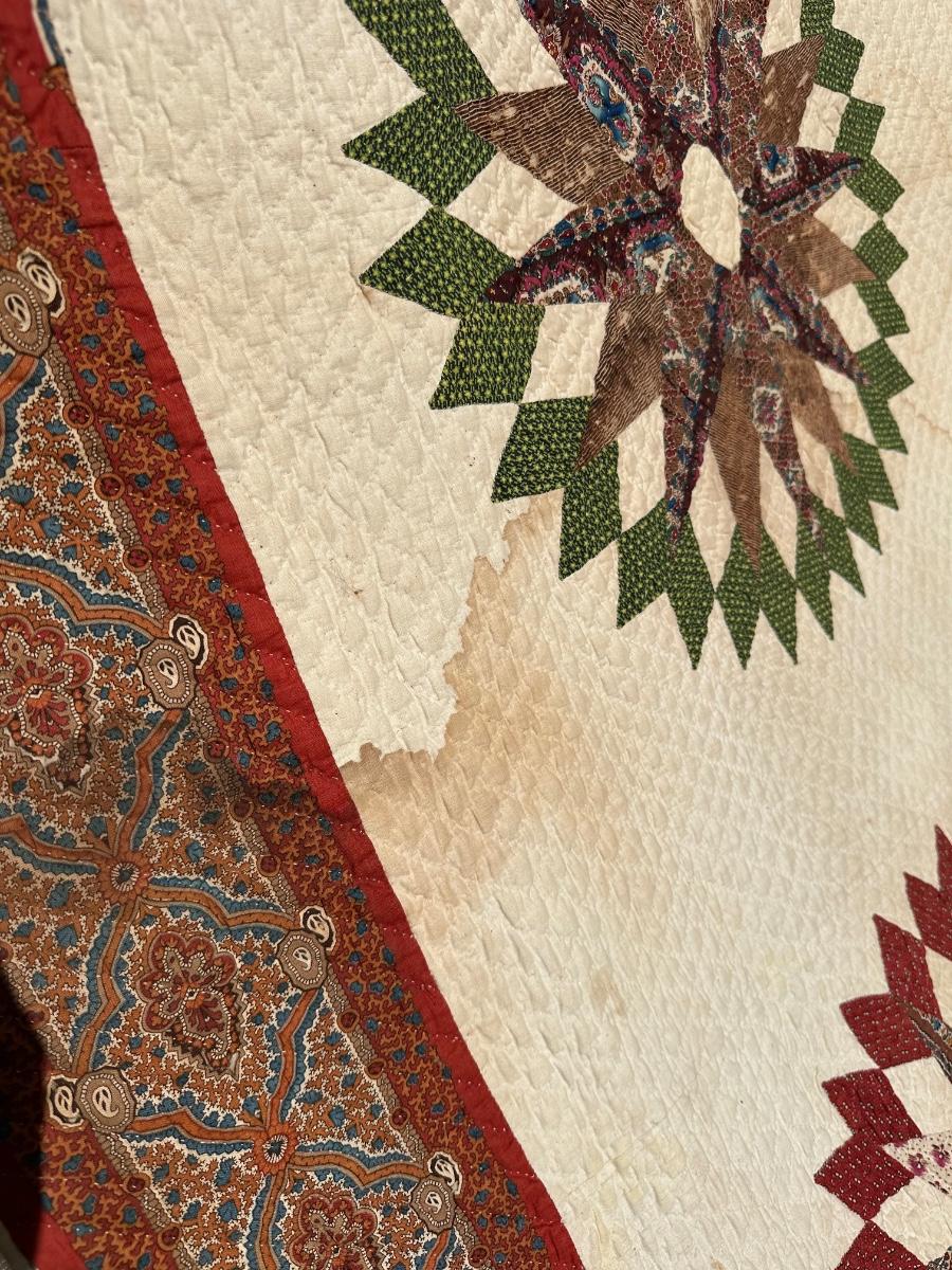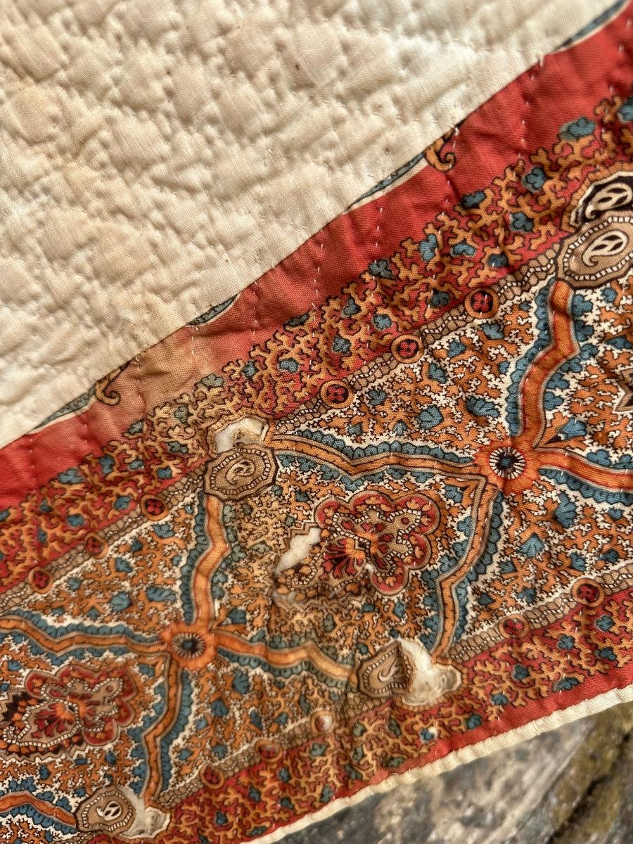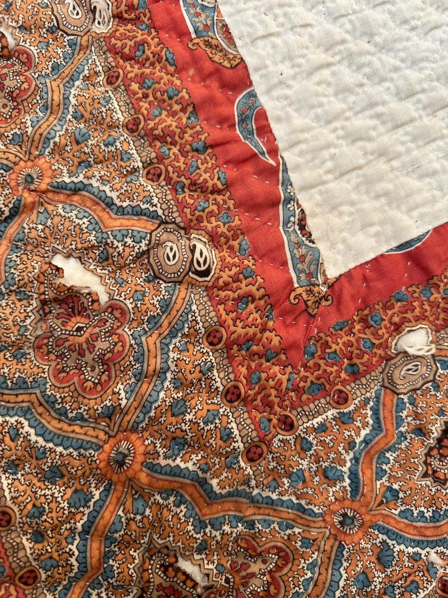 VINTAGE QUILT, TATTERED AND STAINED SIGNED TJ GETTYS 88X96