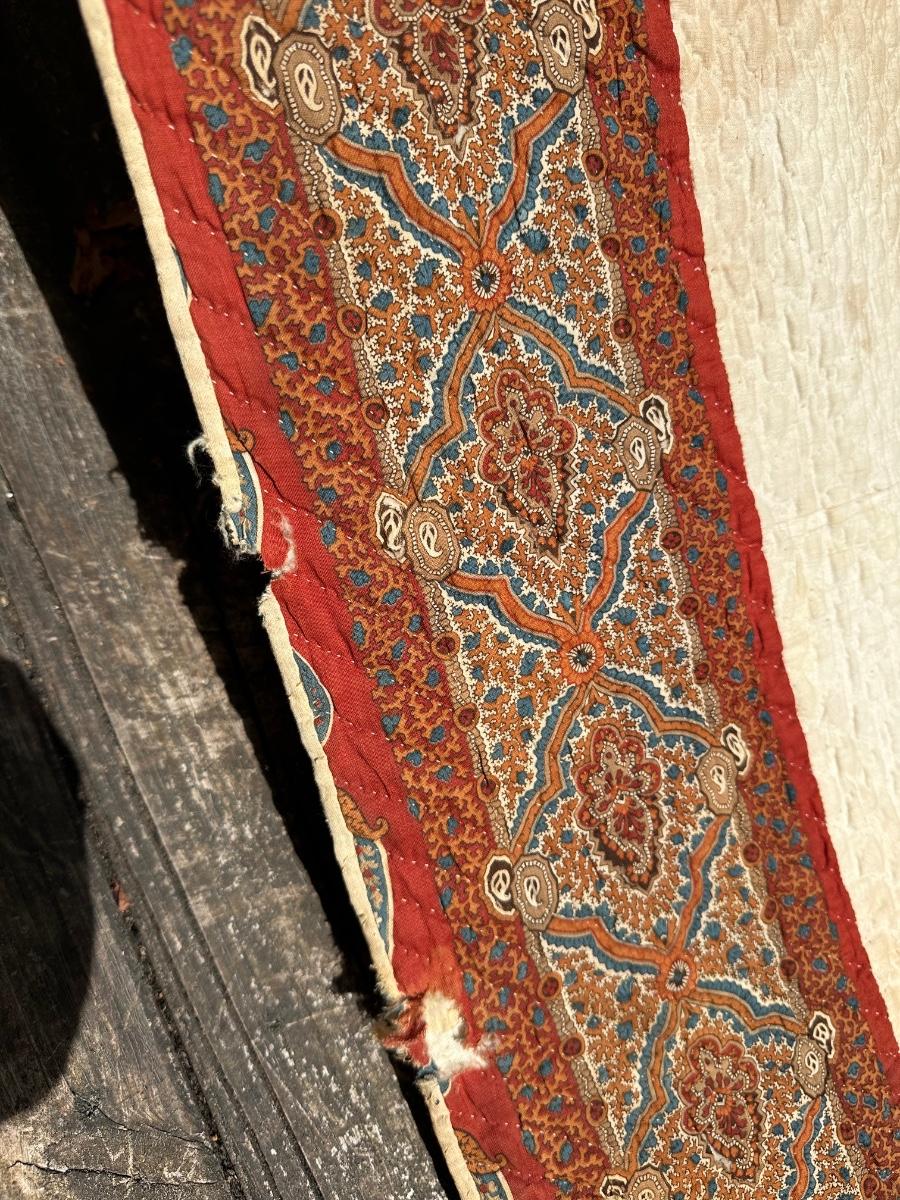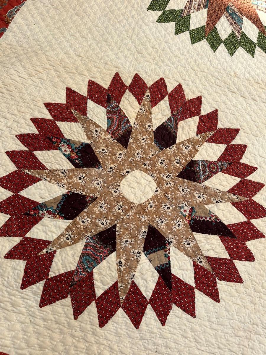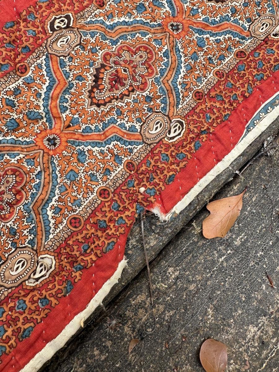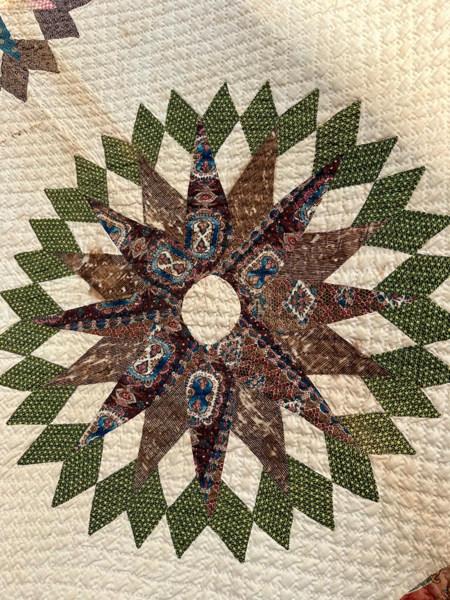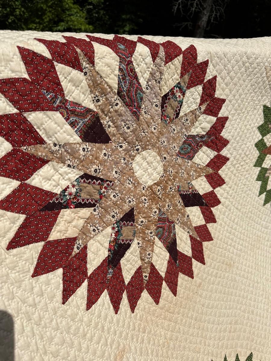 VINTAGE QUILT, TATTERED AND STAINED SIGNED TJ GETTYS 88X96