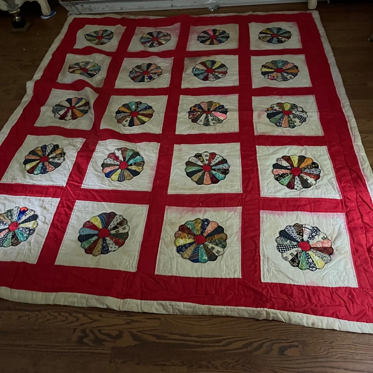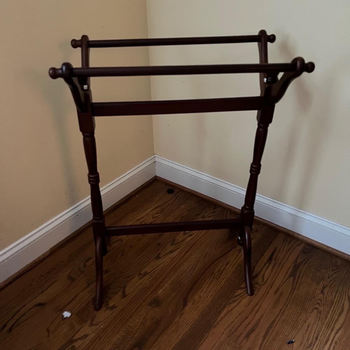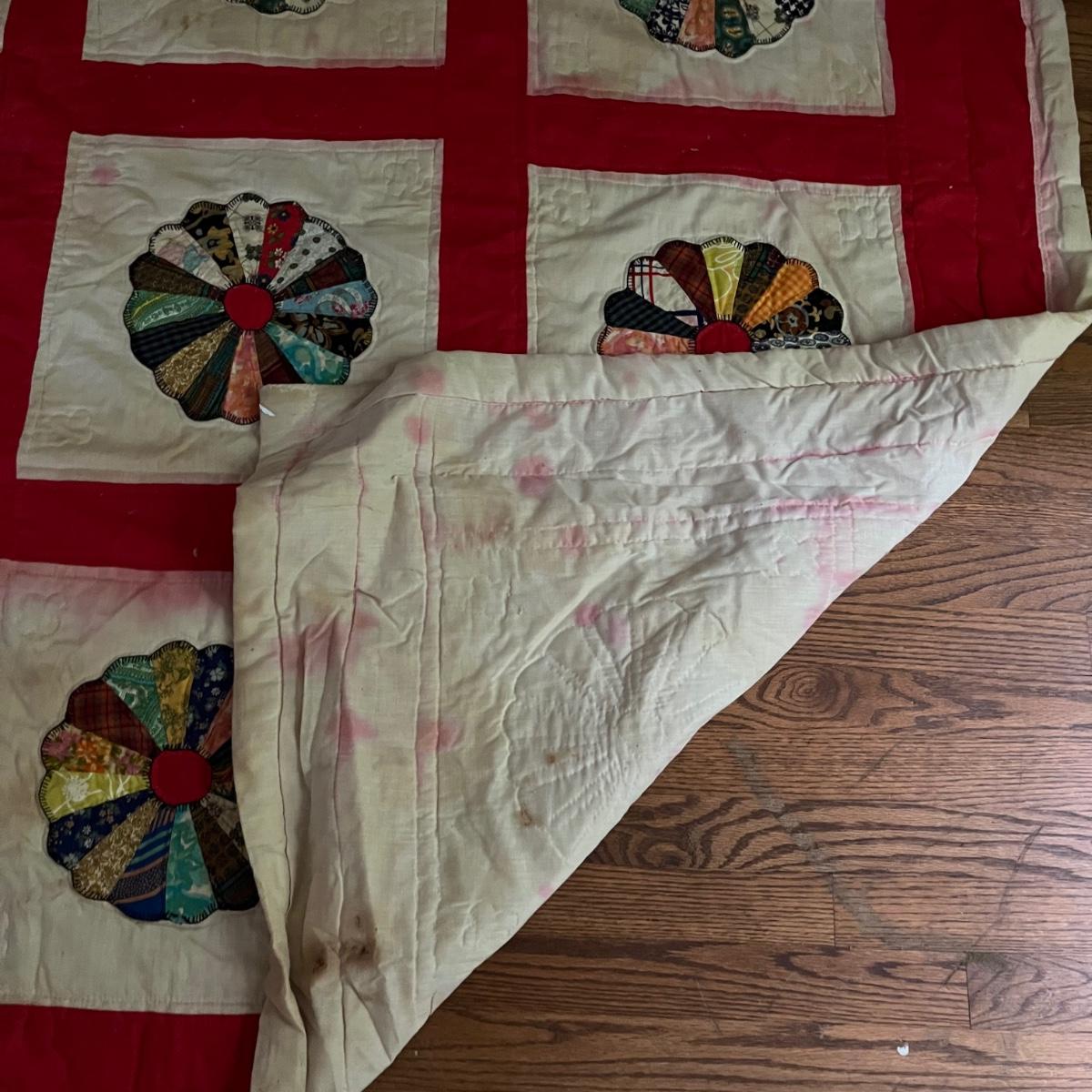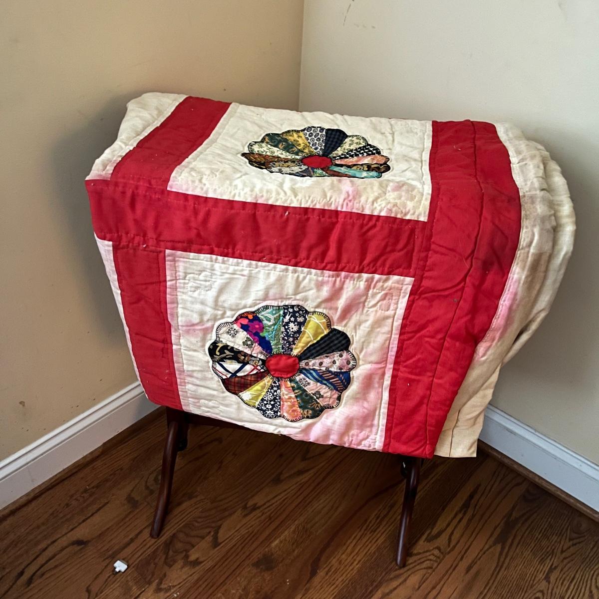 Lot includes a vintage quilt that measures 78” x 96” and a wooden quilt rack that measures 14” x 25” x 32”. Quilt has stains, see pictures.