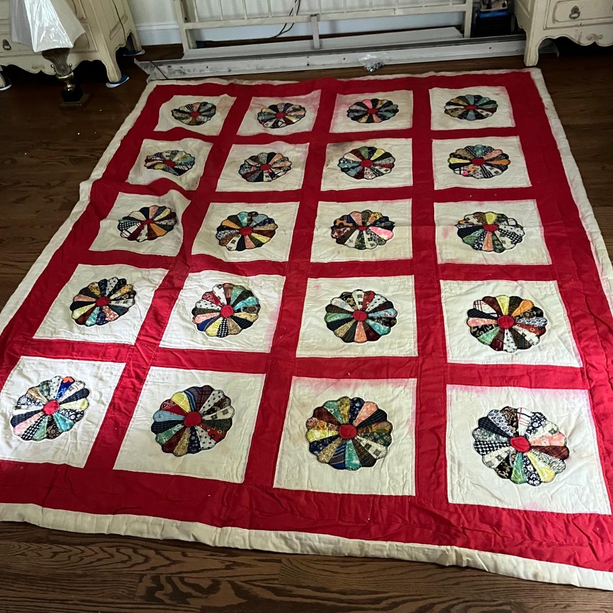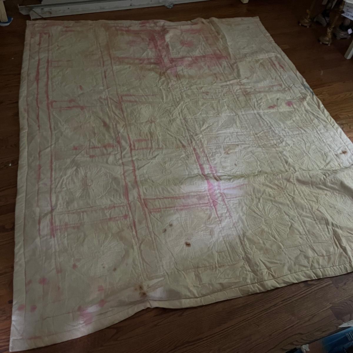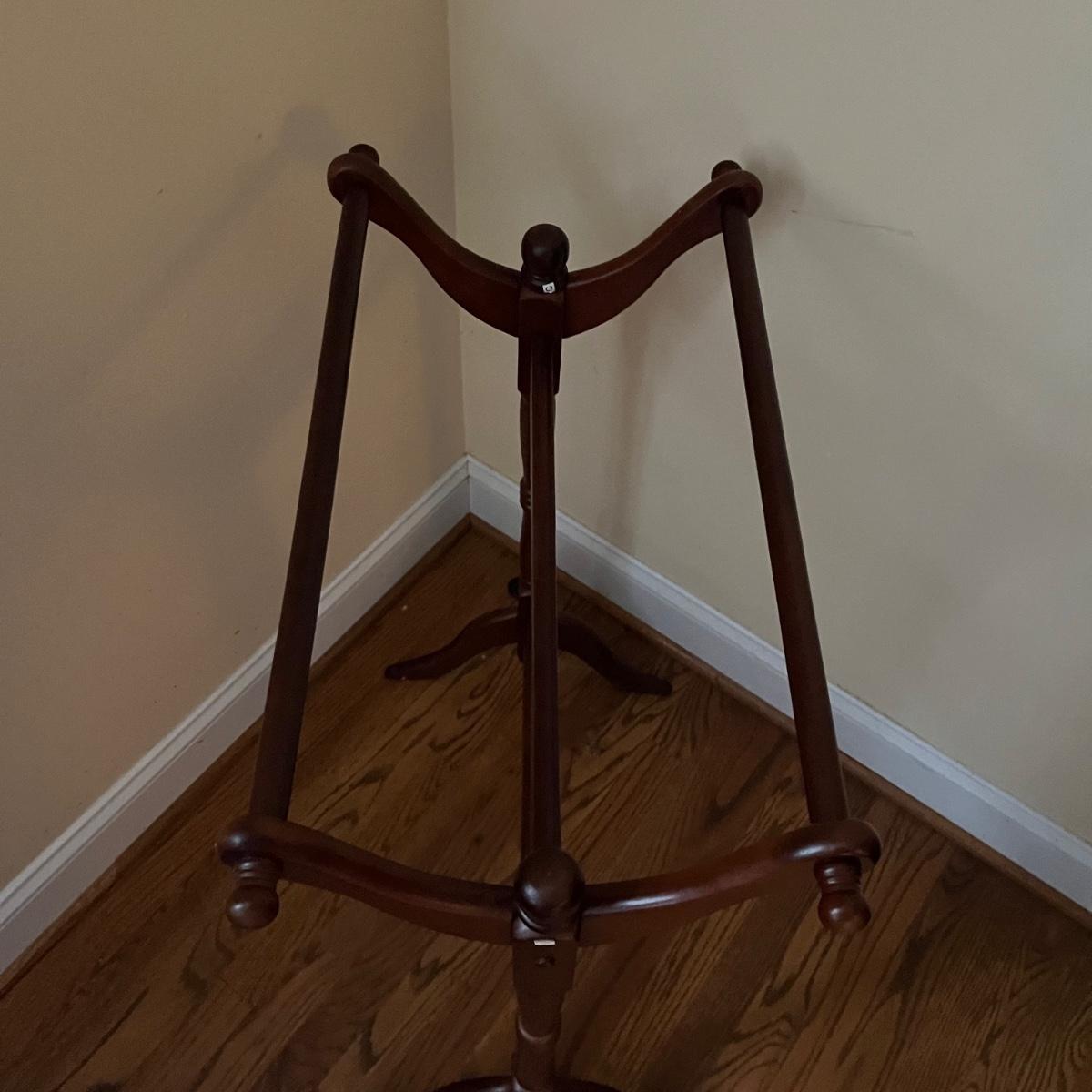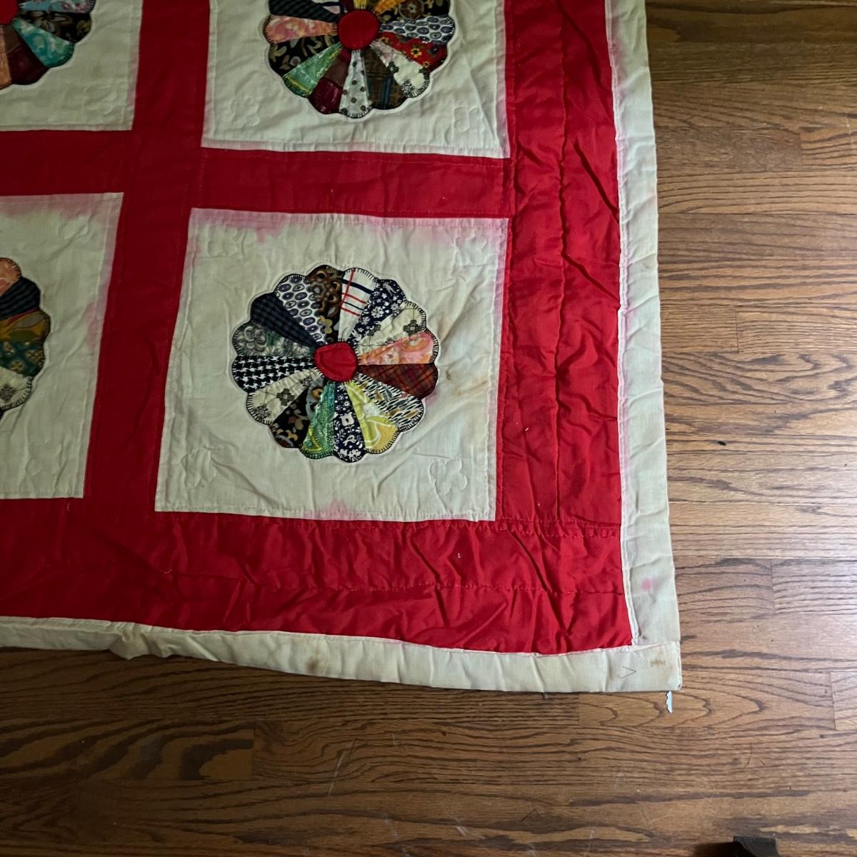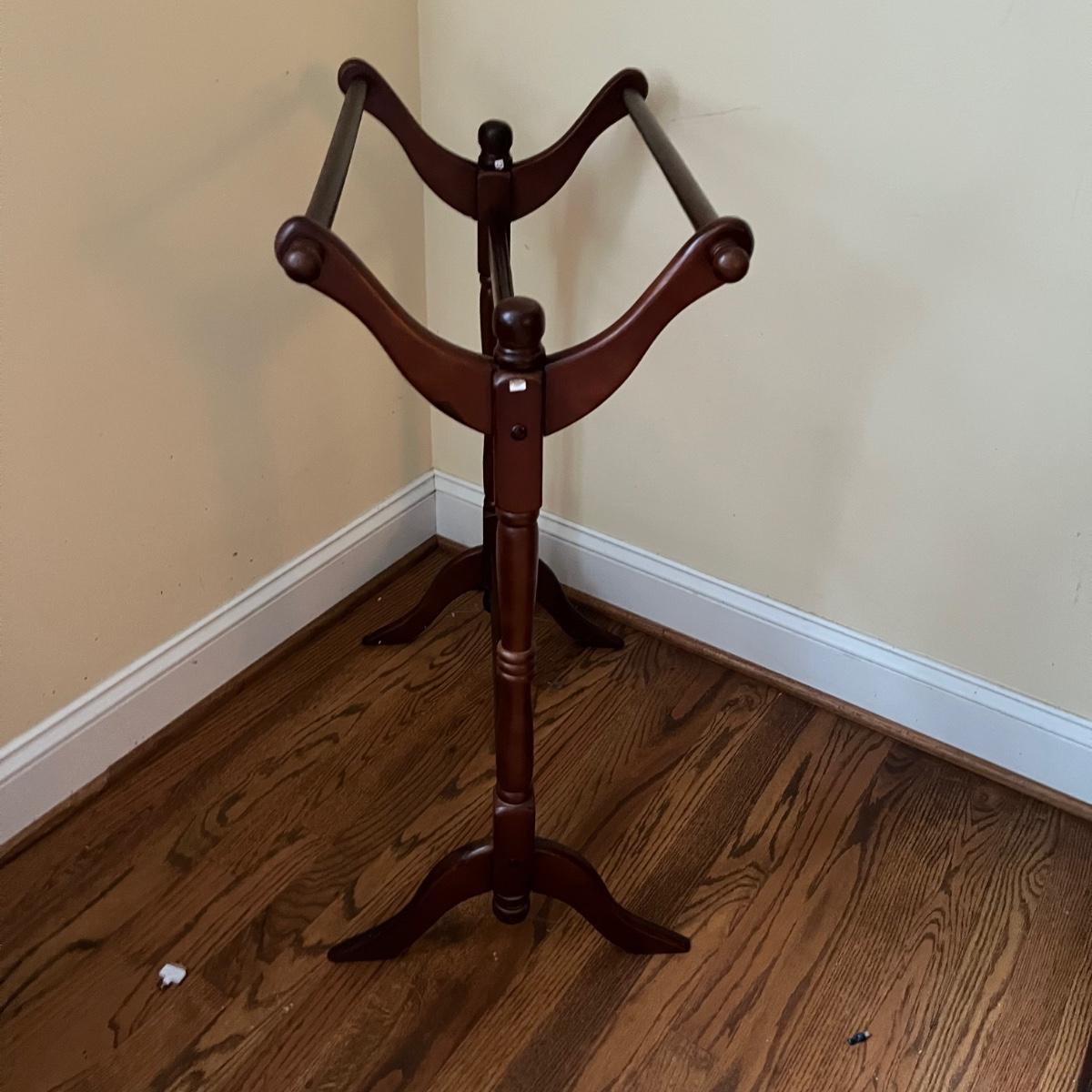 Lot includes a vintage quilt that measures 78” x 96” and a wooden quilt rack that measures 14” x 25” x 32”. Quilt has stains, see pictures.