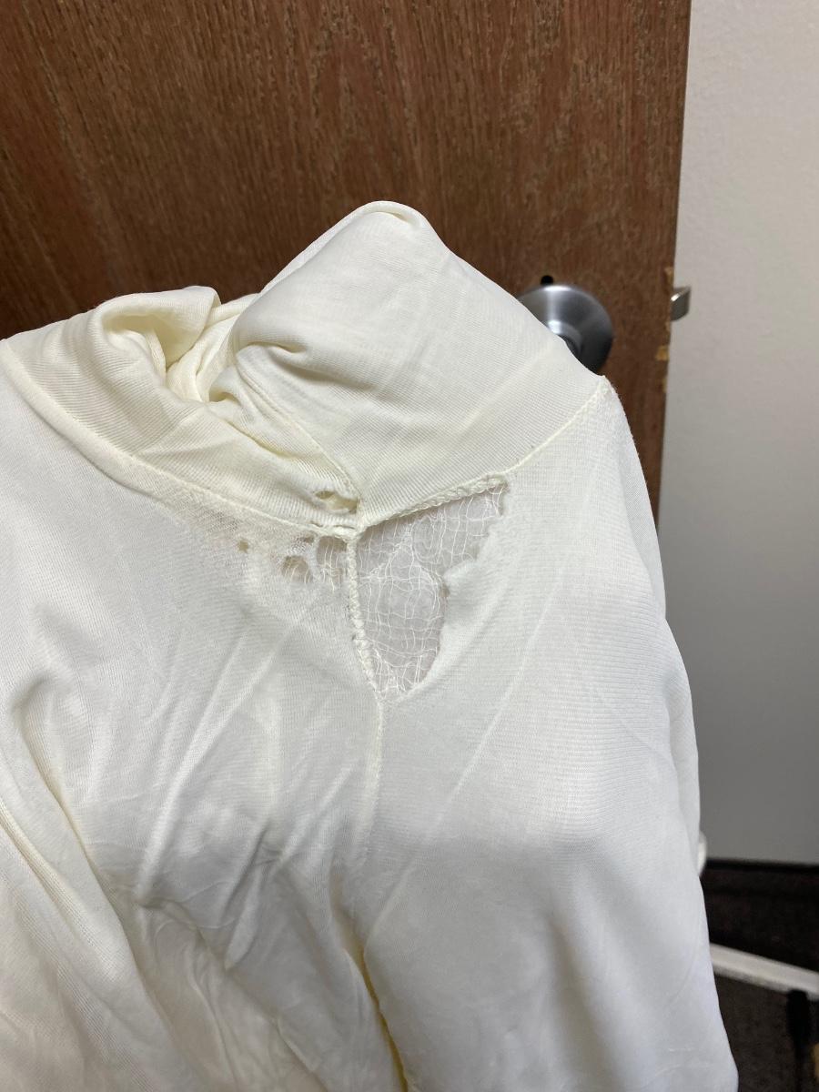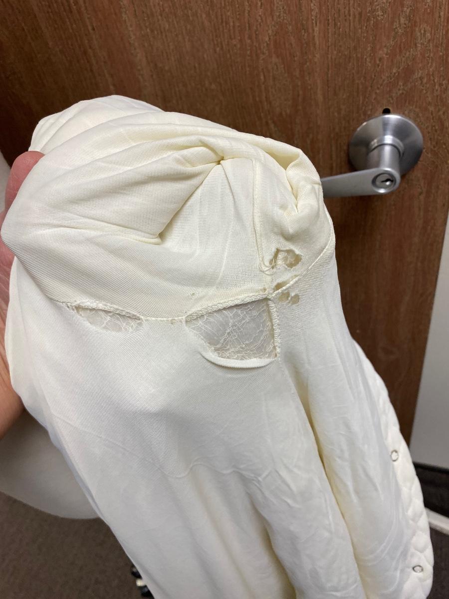 Vintage Junior Loungees dressing gown. White satin feel material, snap closure with embroidered white flowers down the front. Above the knee length. In good vintage condition, no large spots, some discolor, there is wear to the armpits inside of robe. Single pocket on the right-hand side. Size tag says 13.