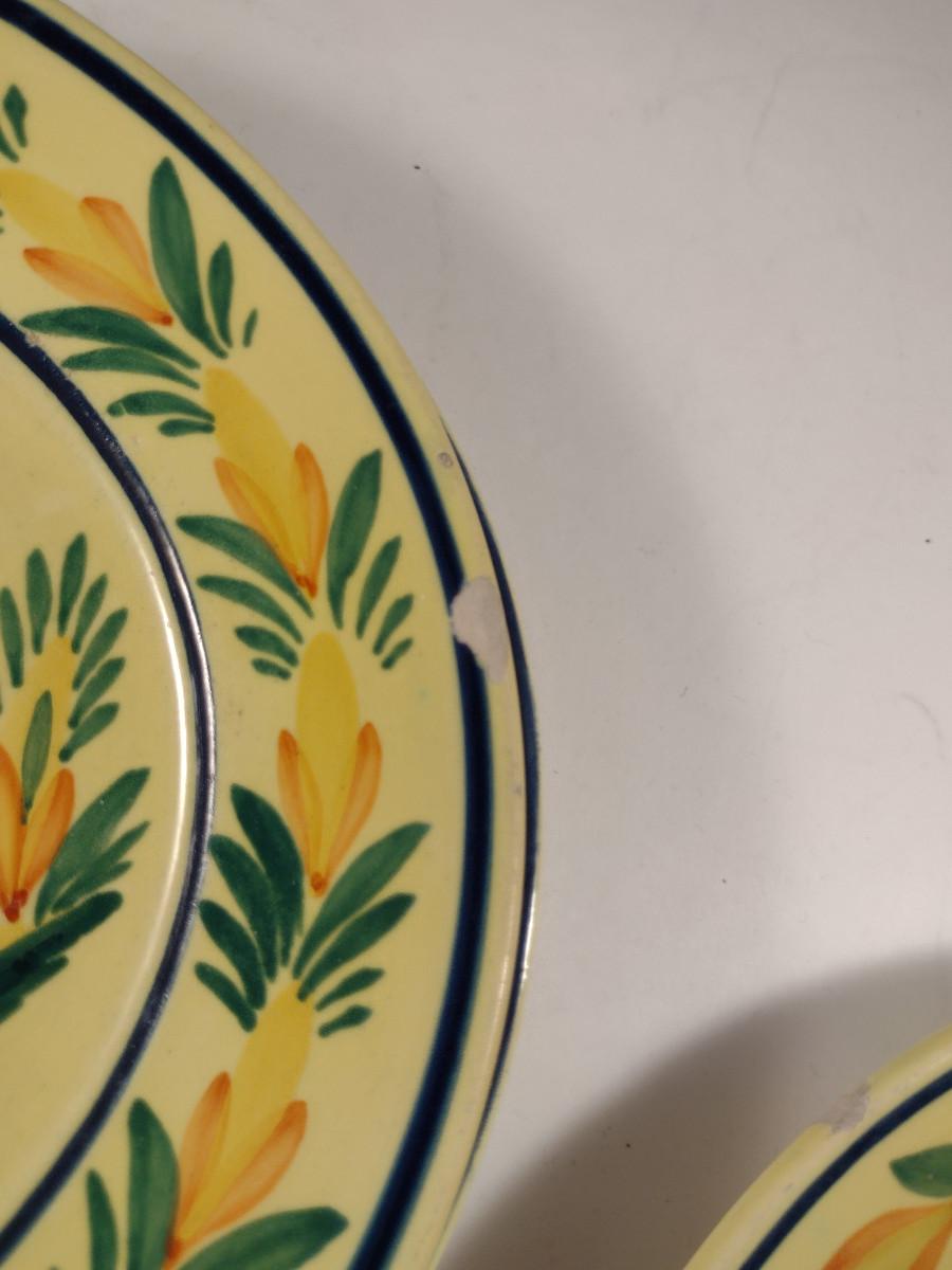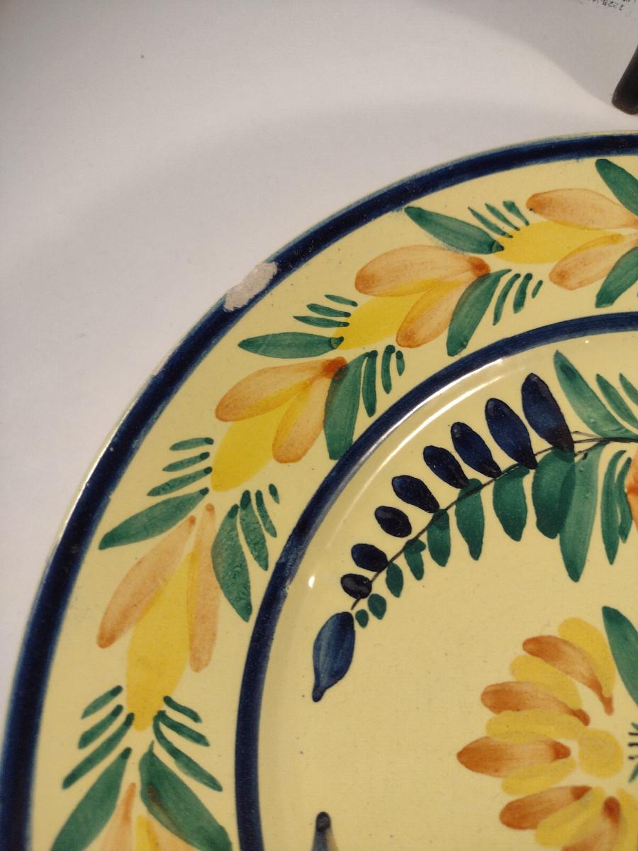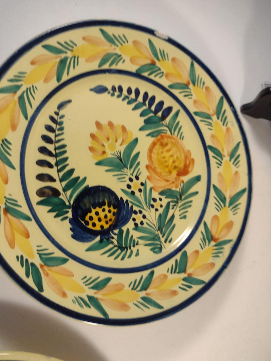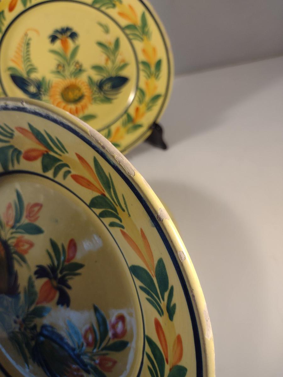 Vintage HB Quimper France Plates- Set of Four- Approx 9 5/8" in Diameter. Four designs. Items have chipping- please see all pictures.