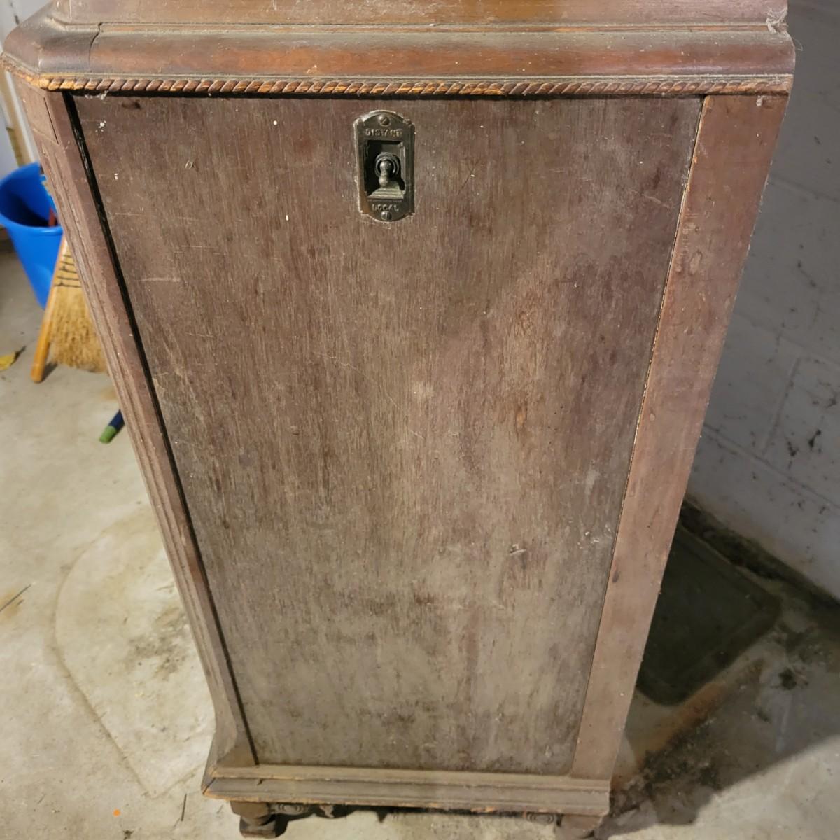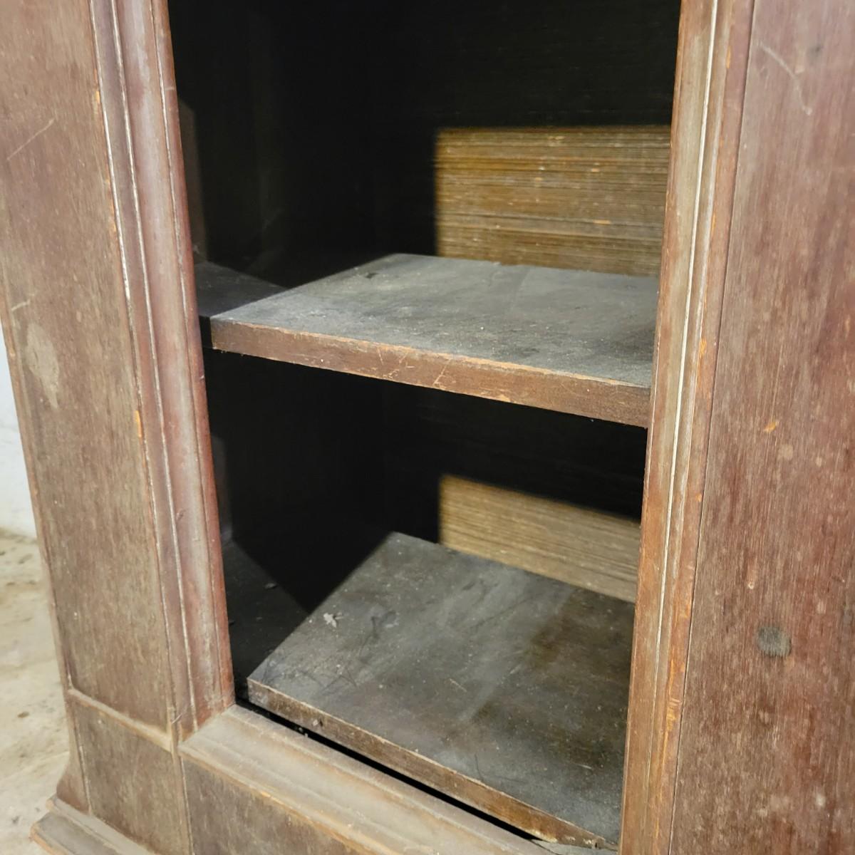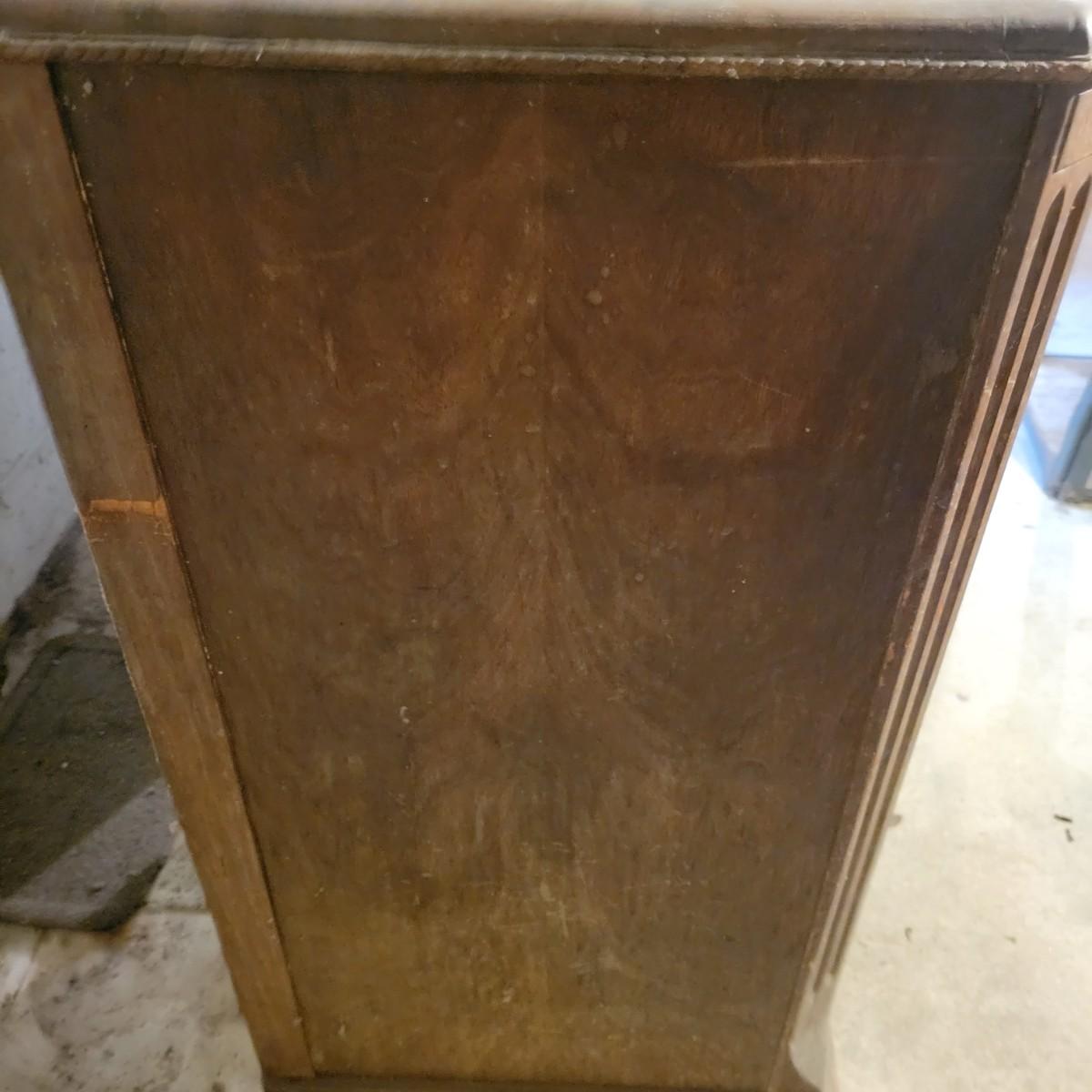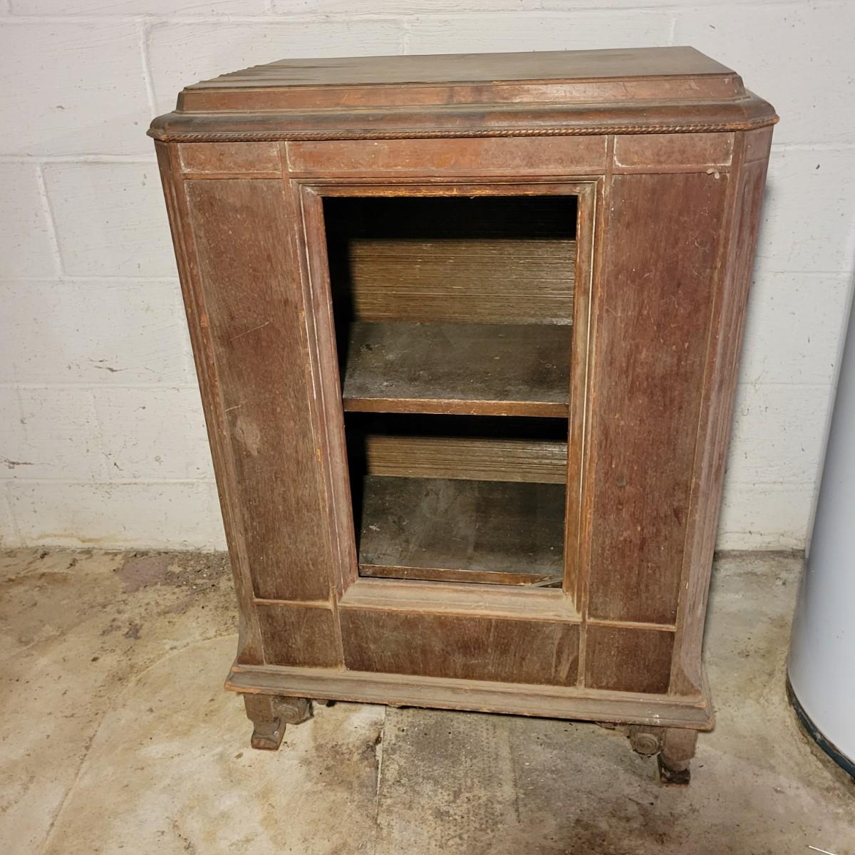 A vintage wood radio cabinet that is in fair condition with some bubbling of its veneer on the surface and some staining. This is a unique cabinet that still has its original switch on its side, decorative scrolled detail and two shelves. This piece could easily be refinished for a unique cabinet. Measures approximately 26" x 16.5 " x 37.5". Local pickup only