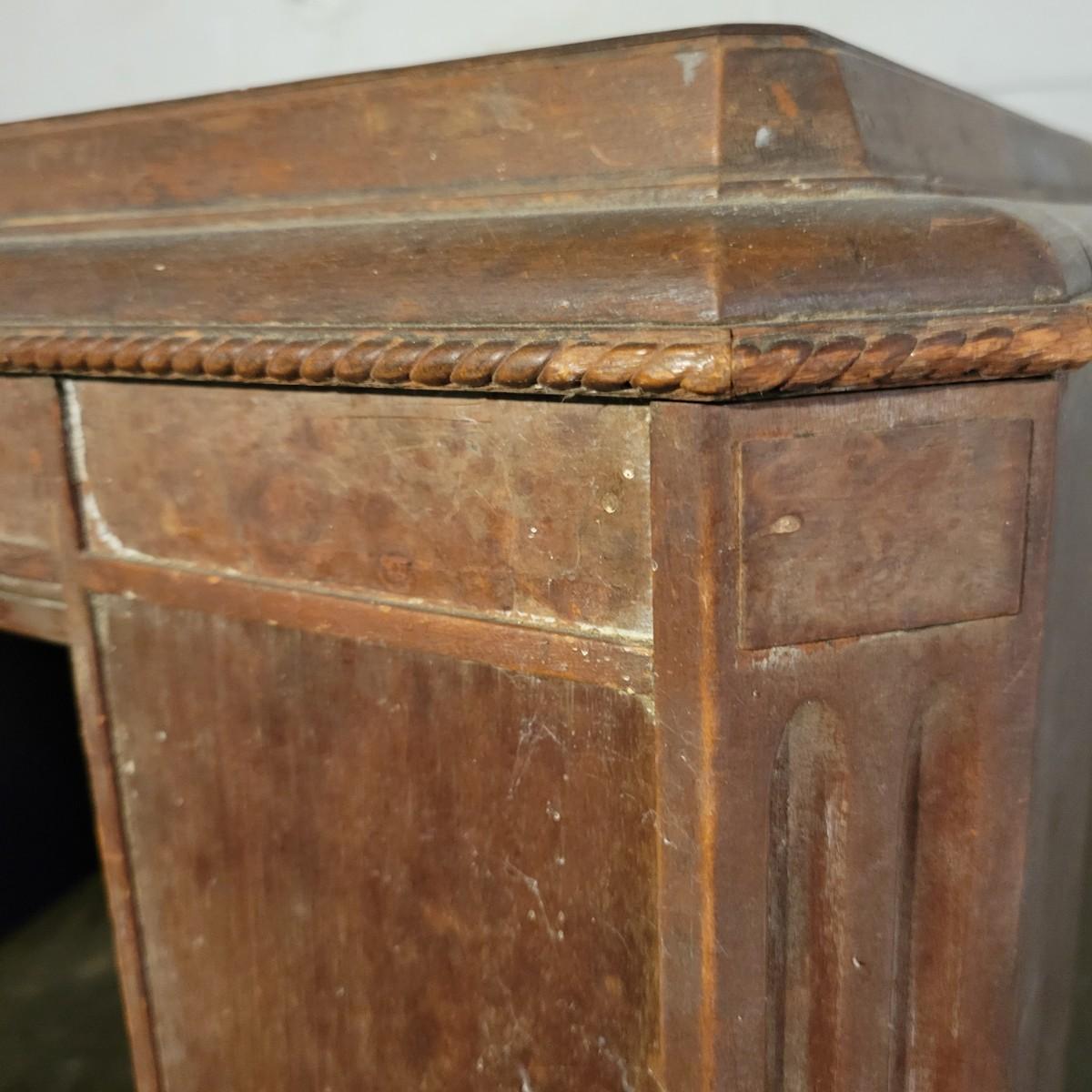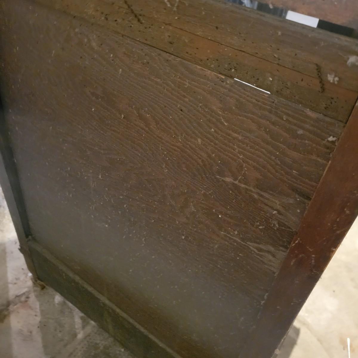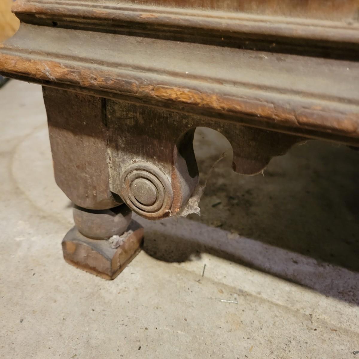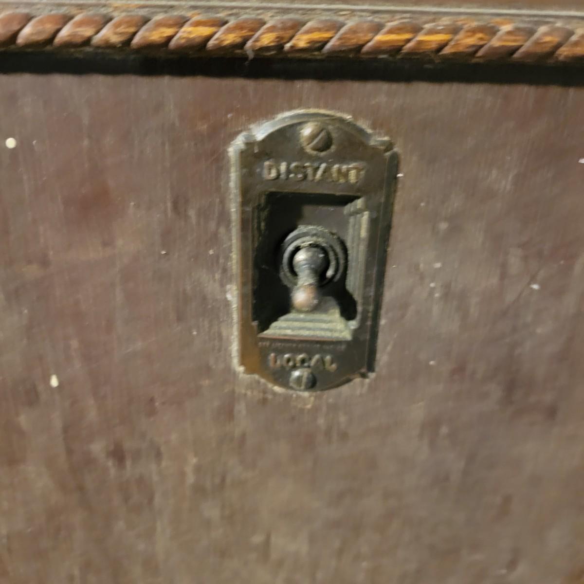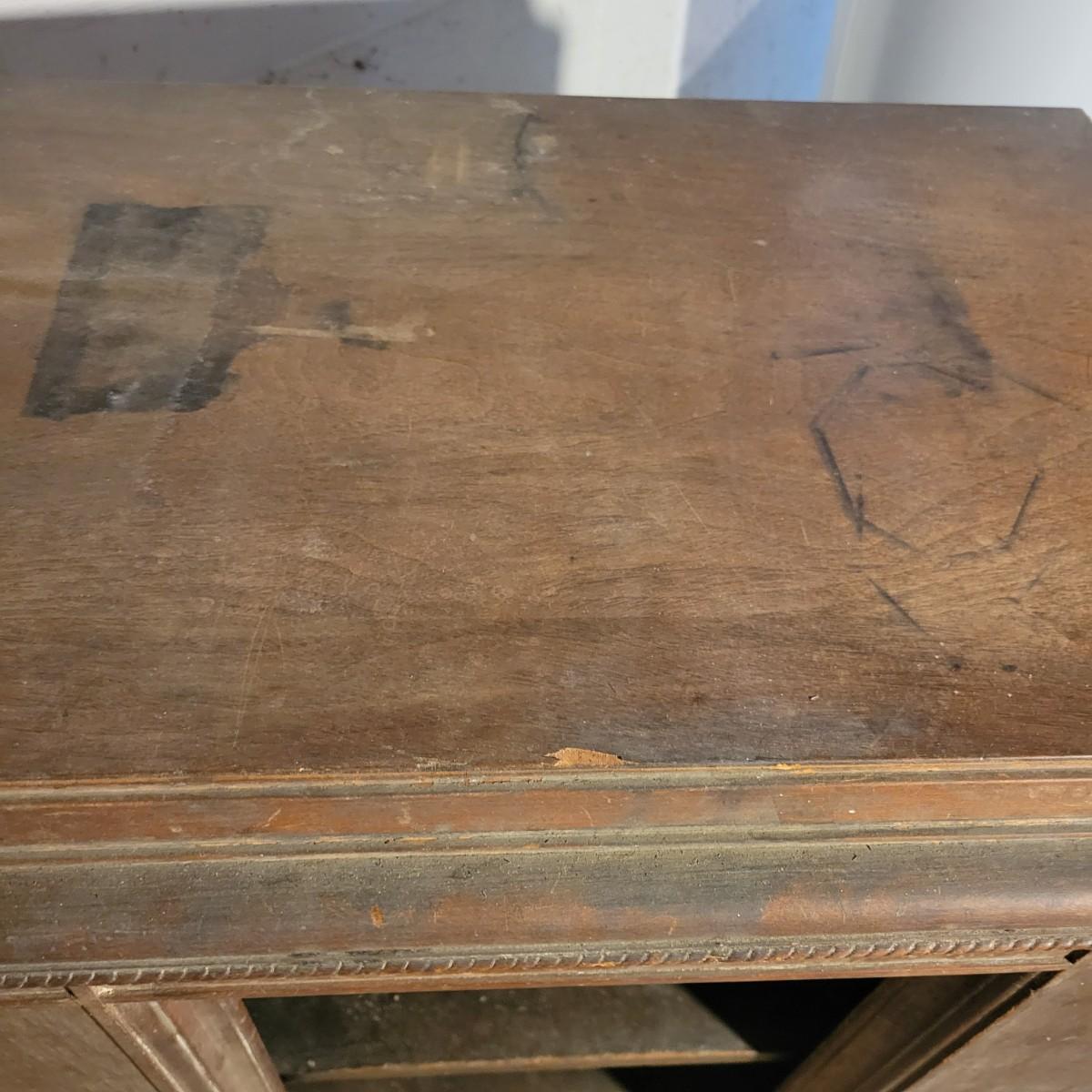 A vintage wood radio cabinet that is in fair condition with some bubbling of its veneer on the surface and some staining. This is a unique cabinet that still has its original switch on its side, decorative scrolled detail and two shelves. This piece could easily be refinished for a unique cabinet. Measures approximately 26" x 16.5 " x 37.5". Local pickup only