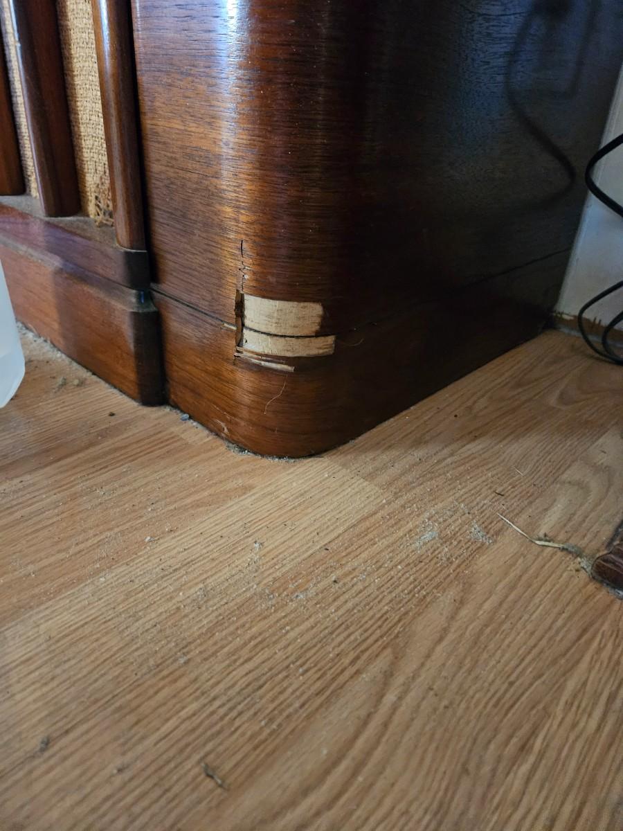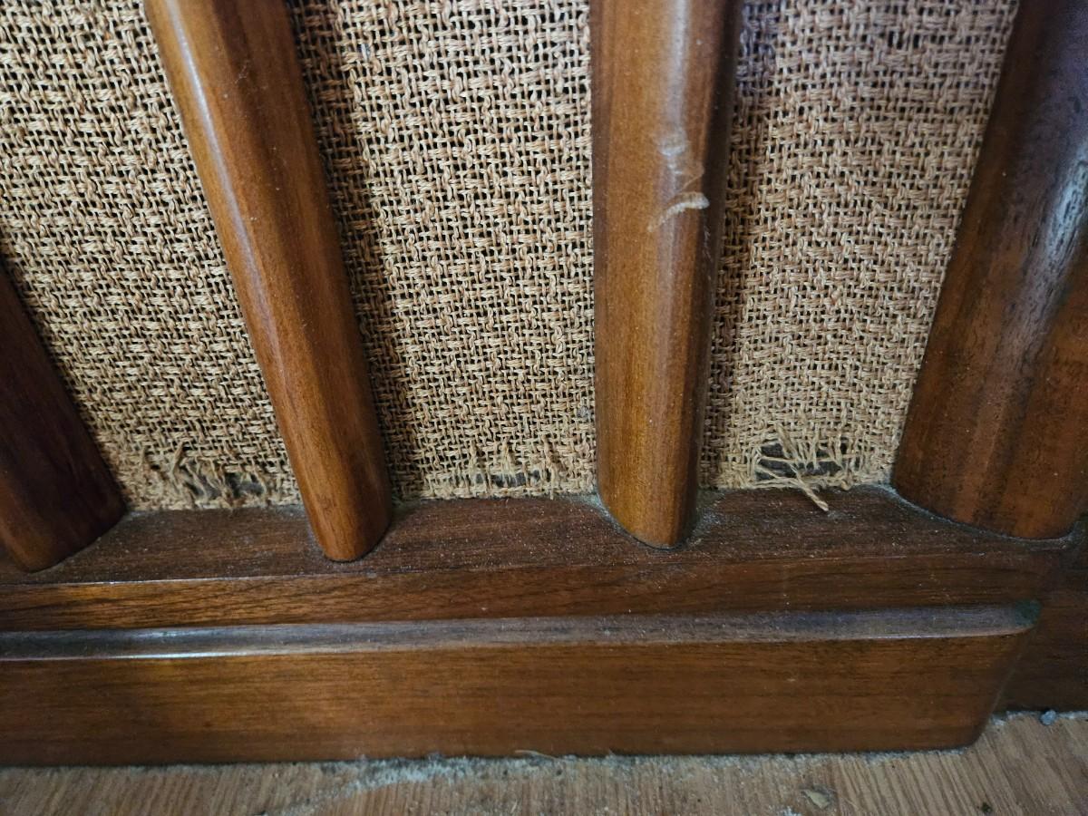 Some damage to wood edge show in pic. Small unravel of speaker cover at the bottom shown in pic