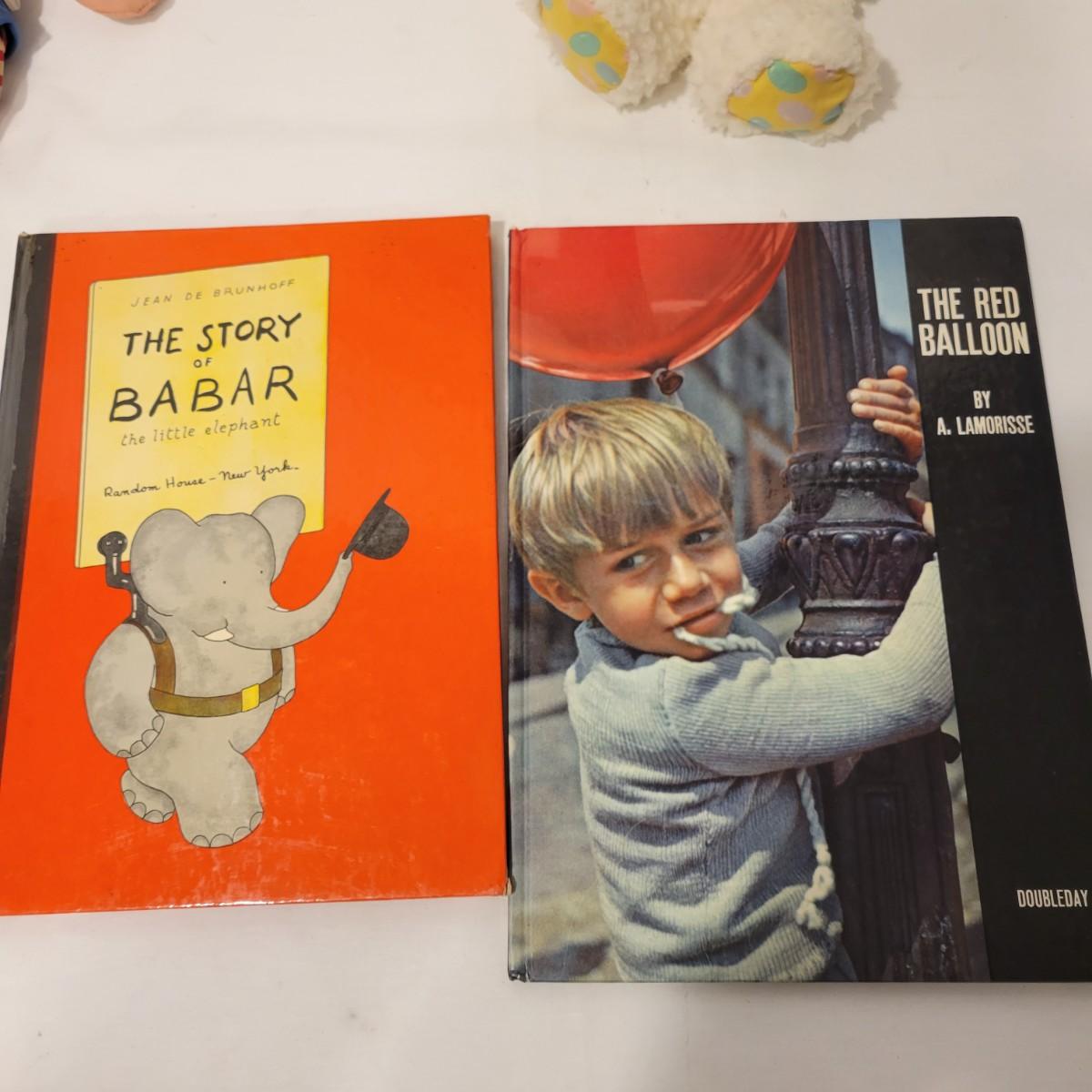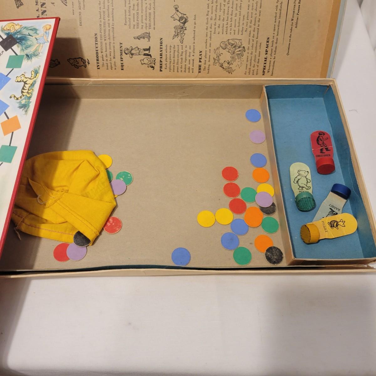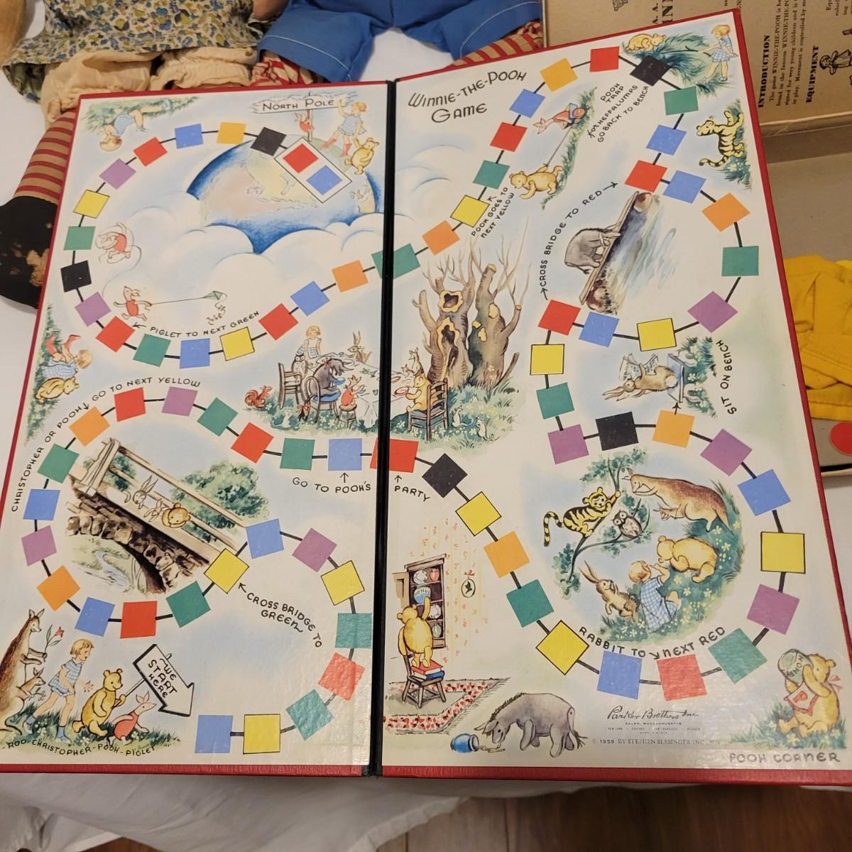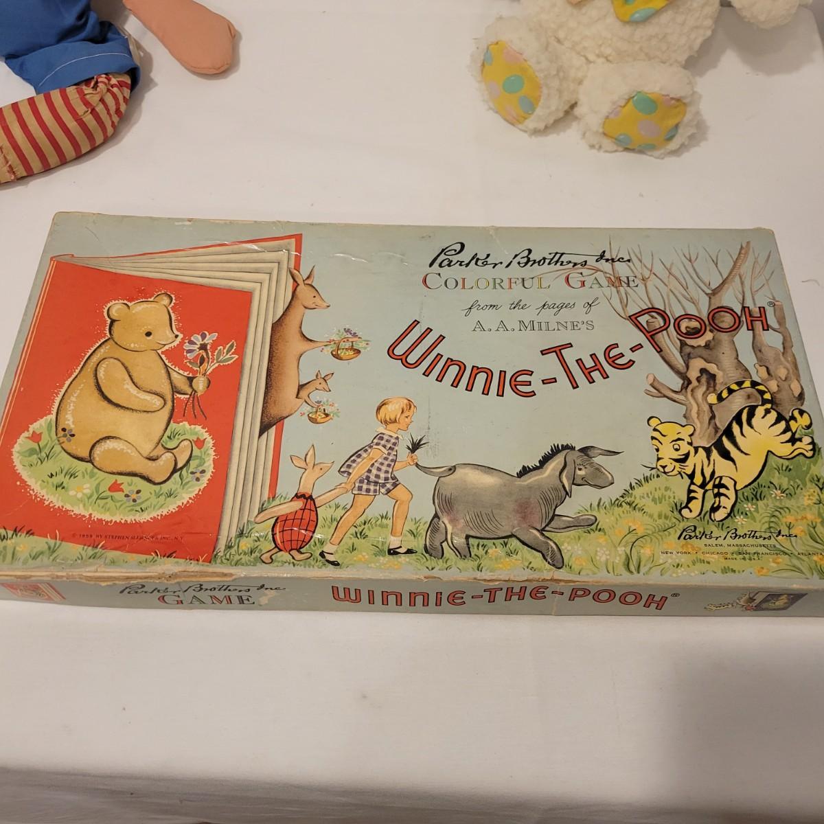 A pair of vintage Raggedy Anne dolls that do have various amounts of wear and damage. This lot also includes four children's books, a Winnie the Pooh game and a plush bunny. Shipping available