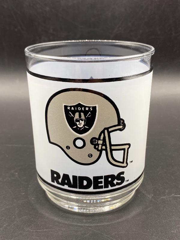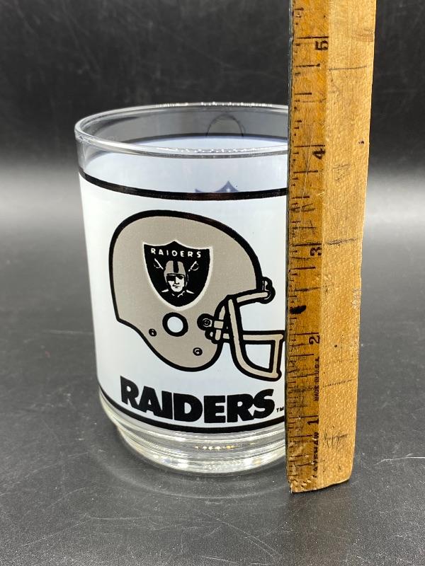 Vintage Raiders rocks drink glass. Frosted glass with logo helmet and Raiders name. Does not say Los Angeles on it, but it is more then likely Los Angeles era vintage. Excellent condition. 4" tall.