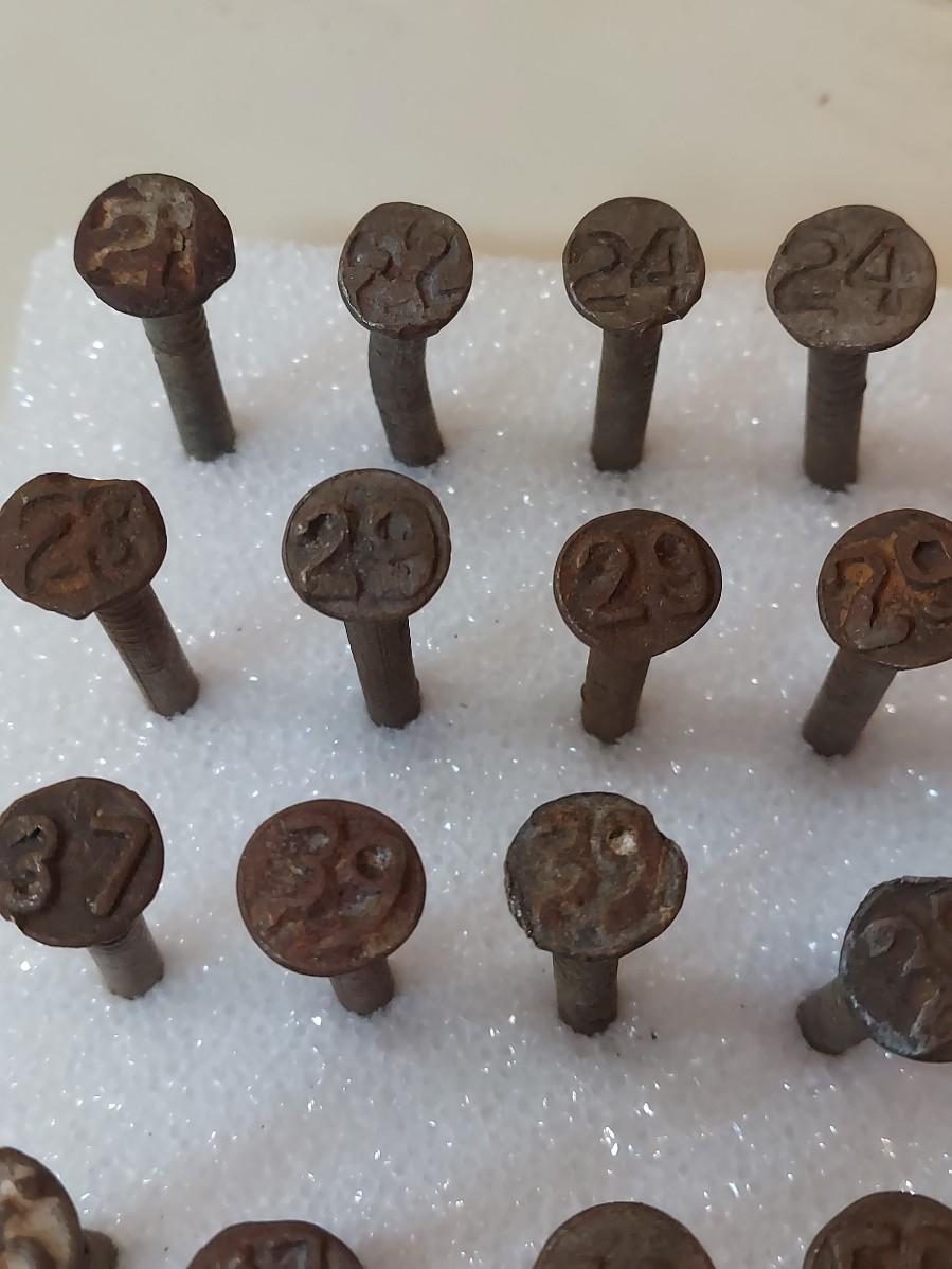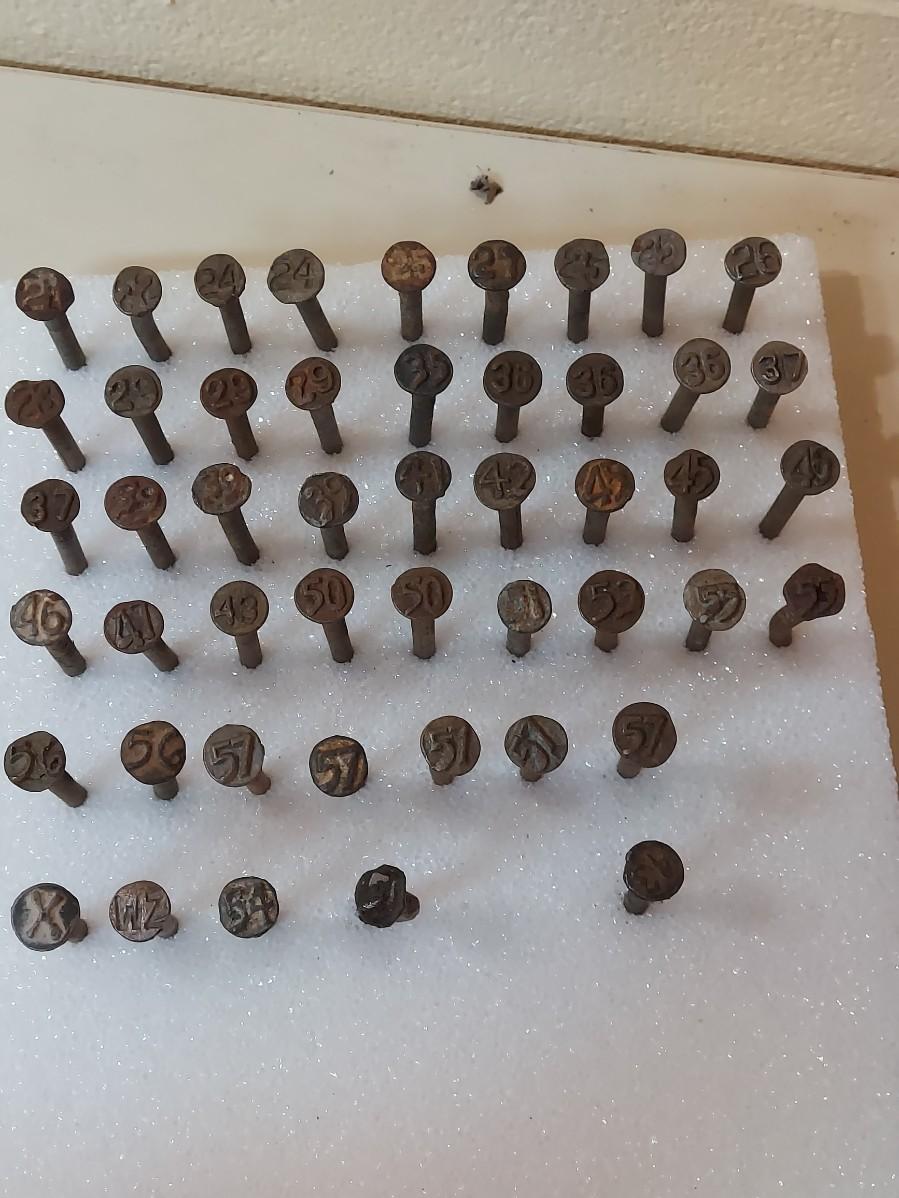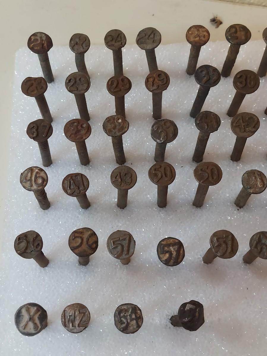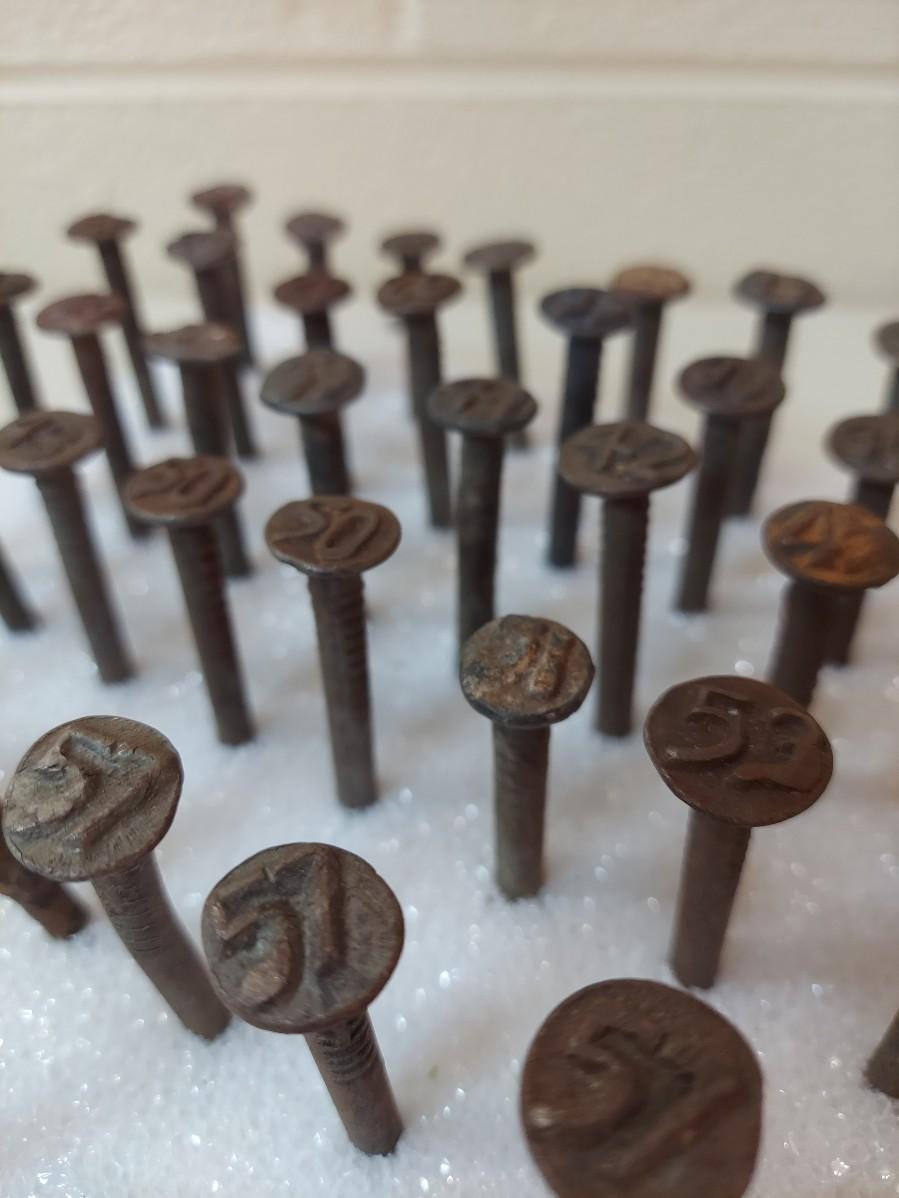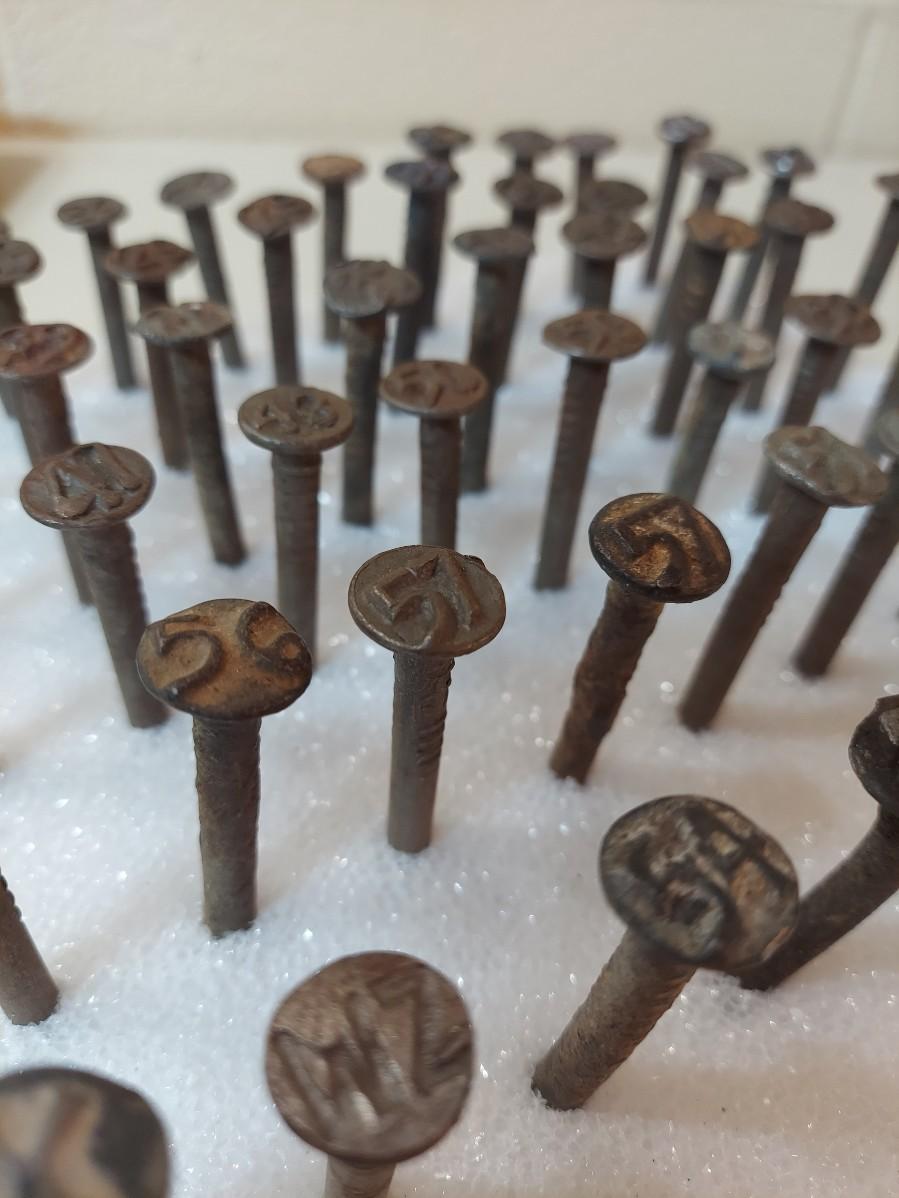 Nearly 100 date nails from unknown rail lines. Nails are shown in blocks of foam. The green foam block measures approximately 12"SQ. Each nail is roughly 2.5” long. Please see photos for details. Shipping available