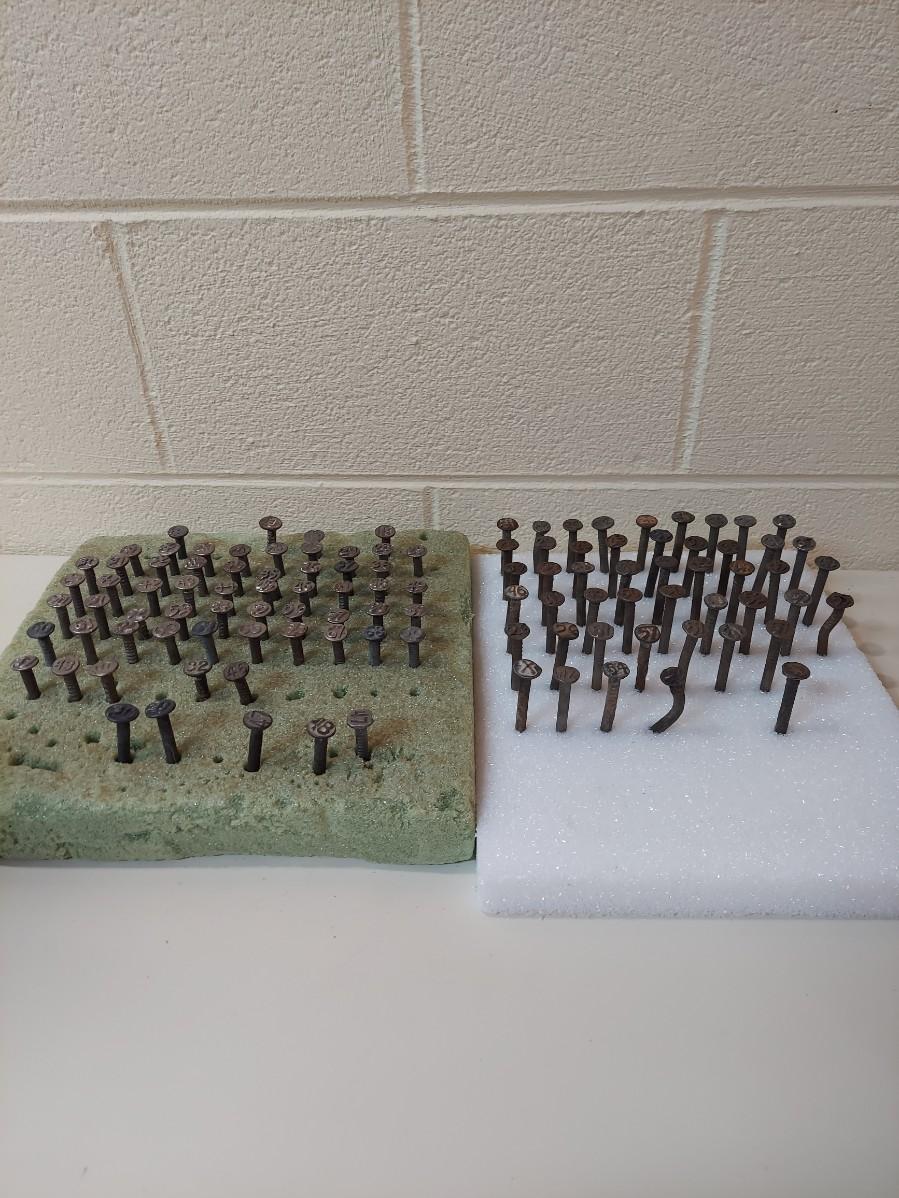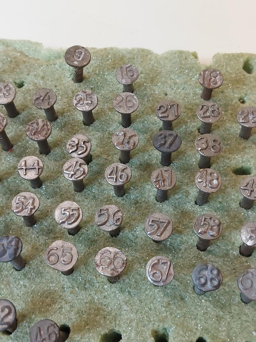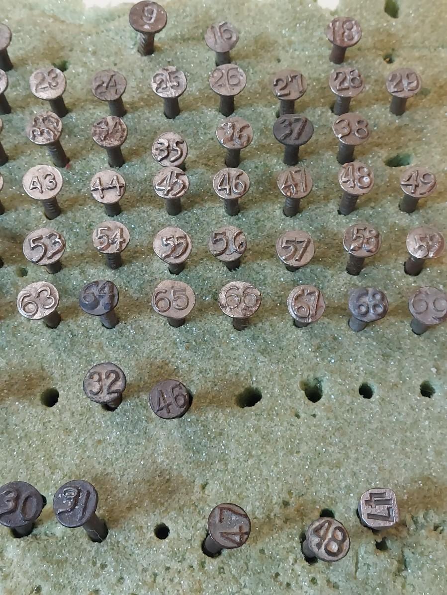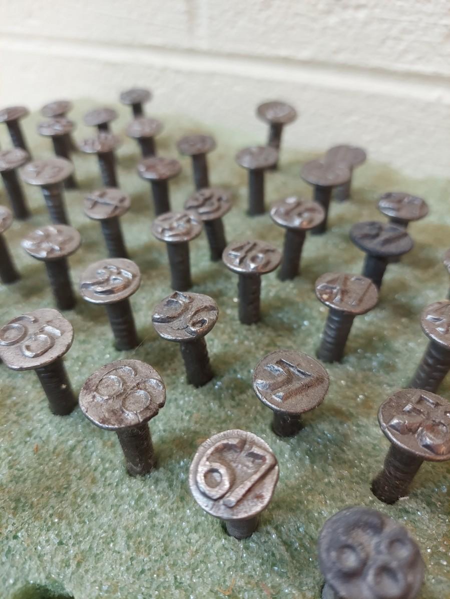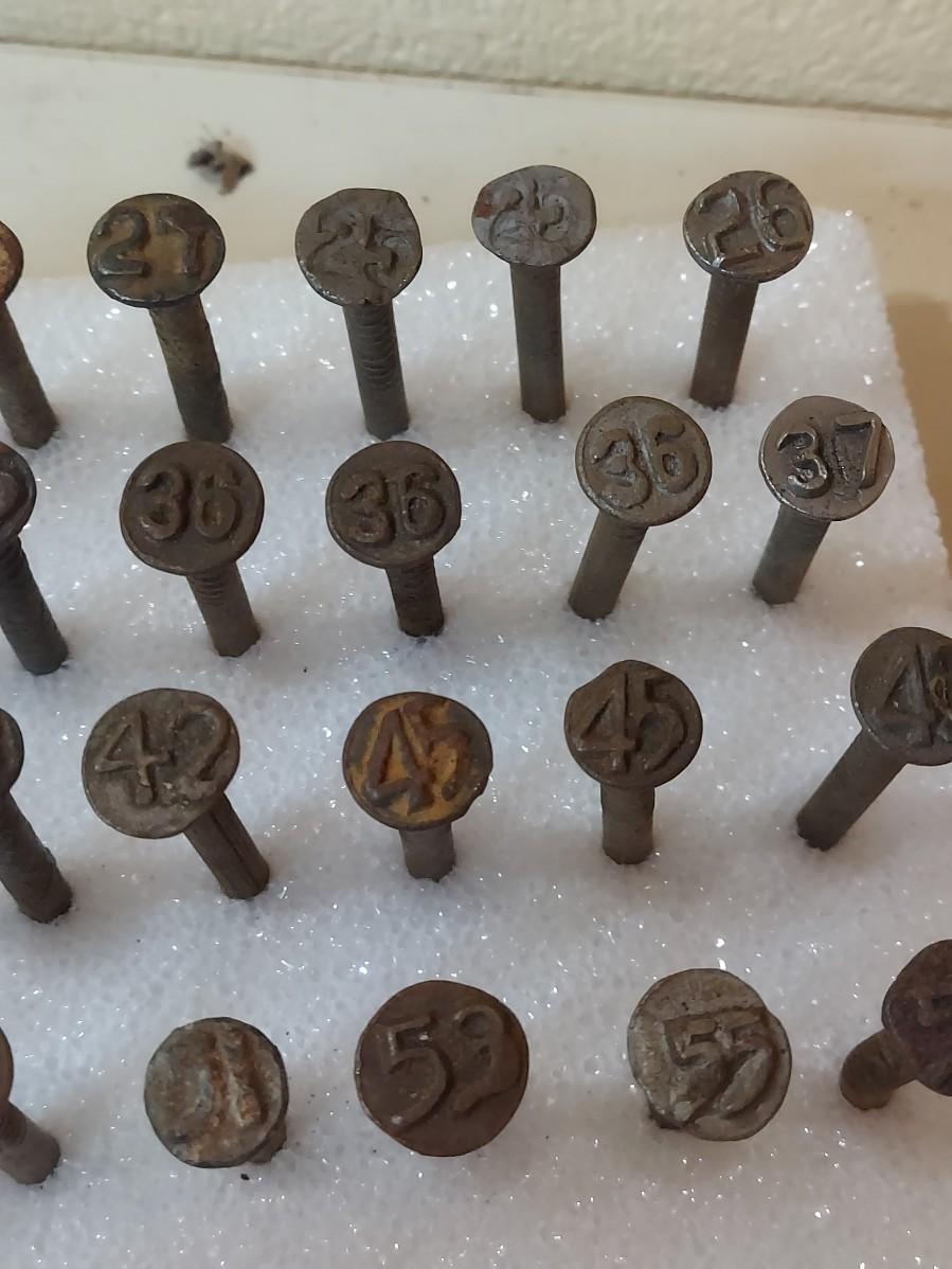 Nearly 100 date nails from unknown rail lines. Nails are shown in blocks of foam. The green foam block measures approximately 12"SQ. Each nail is roughly 2.5” long. Please see photos for details. Shipping available