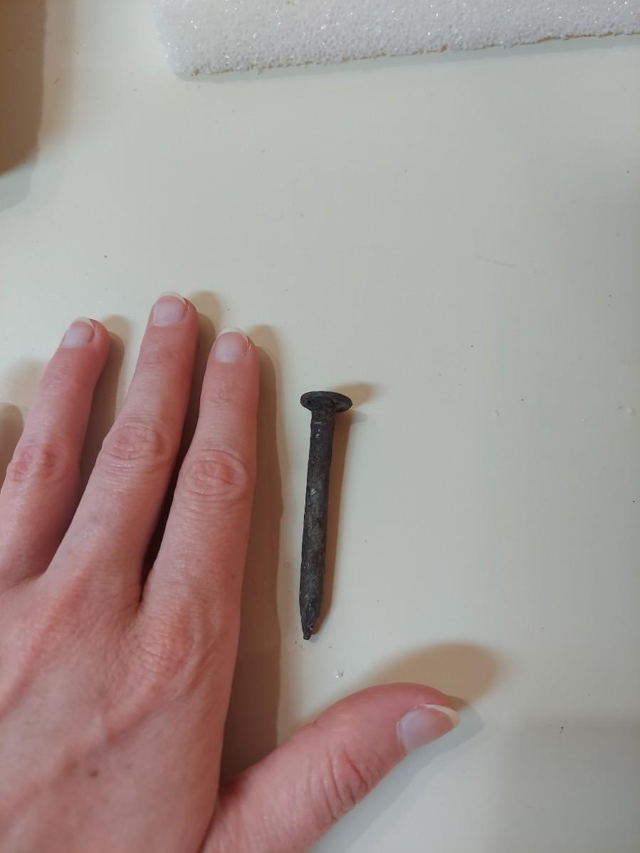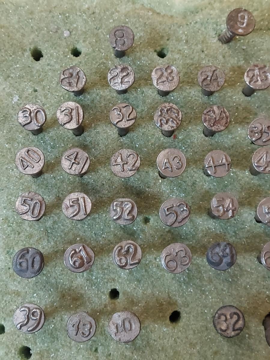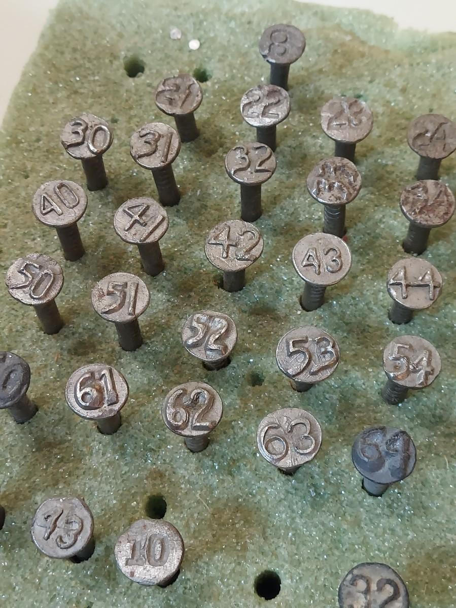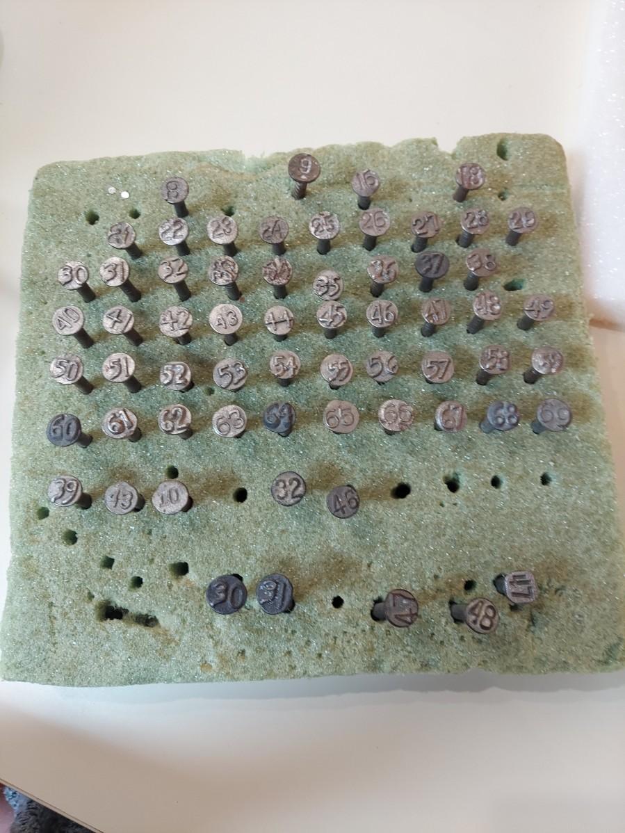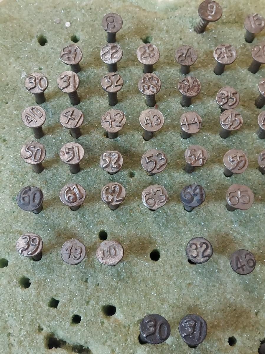 Nearly 100 date nails from unknown rail lines. Nails are shown in blocks of foam. The green foam block measures approximately 12"SQ. Each nail is roughly 2.5” long. Please see photos for details. Shipping available