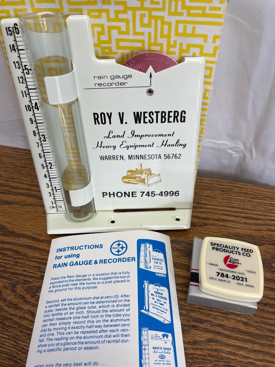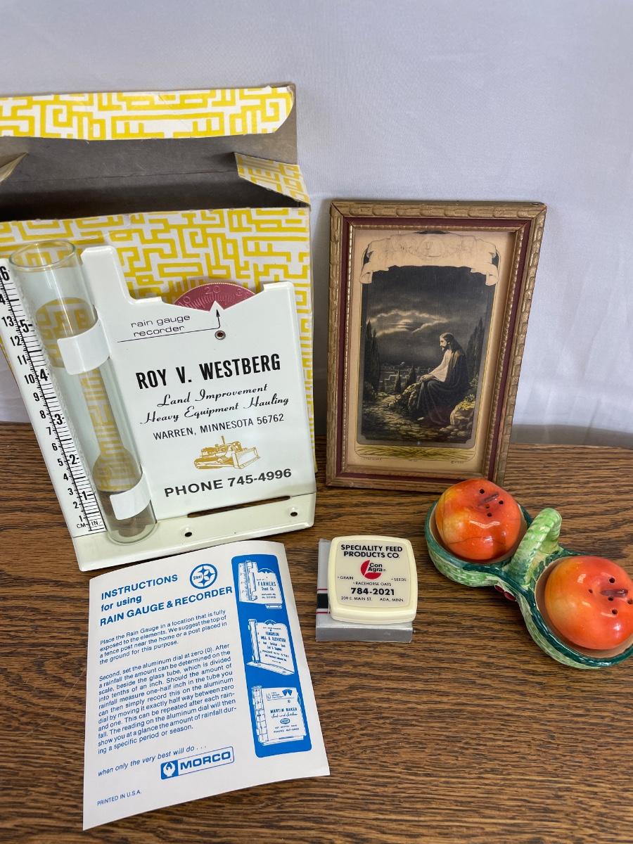 Vintage rain gauge, S&P, Jesus, & measuring tape