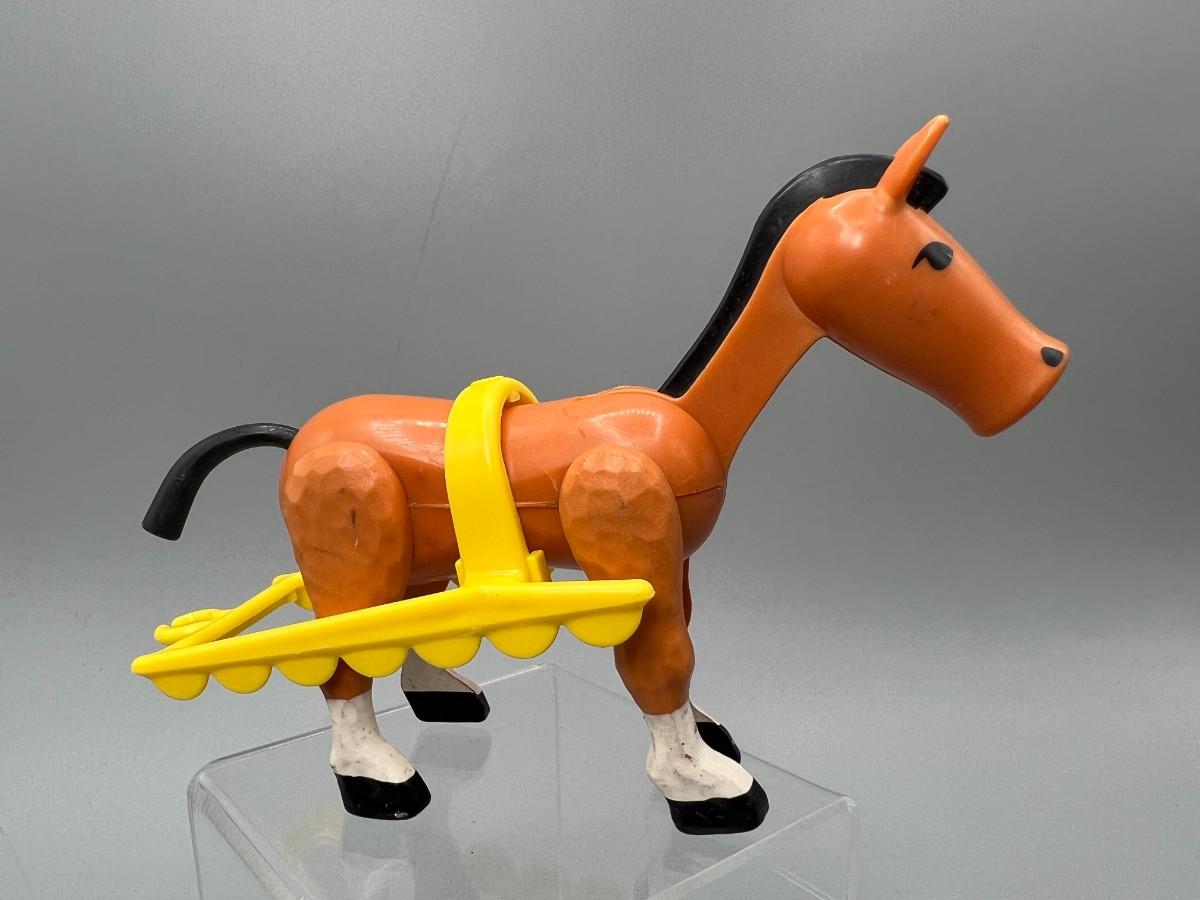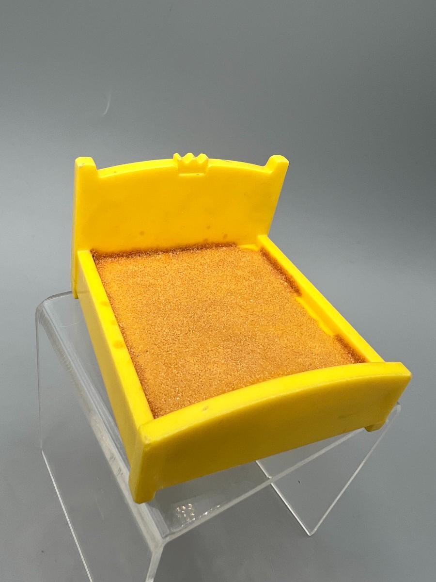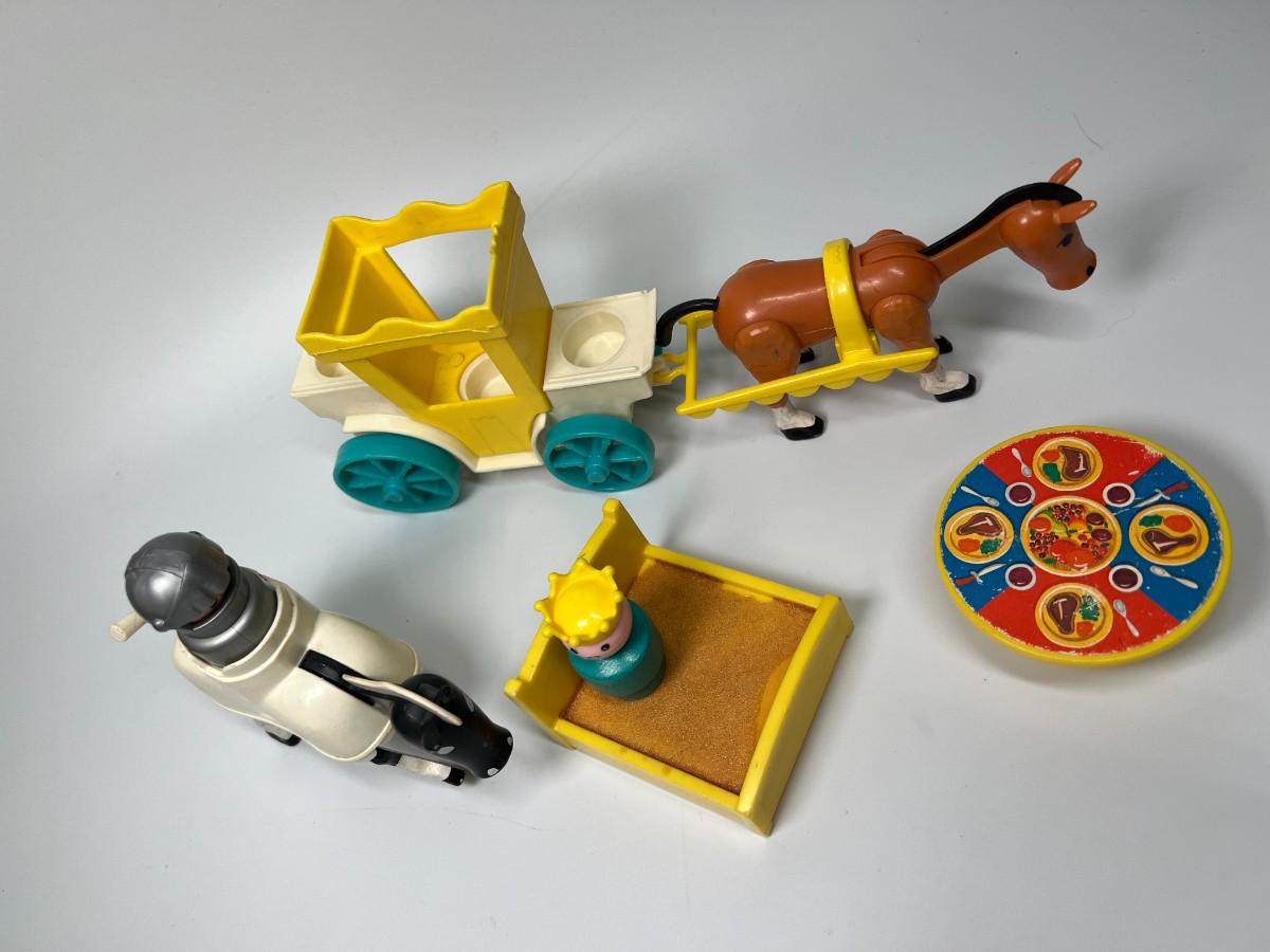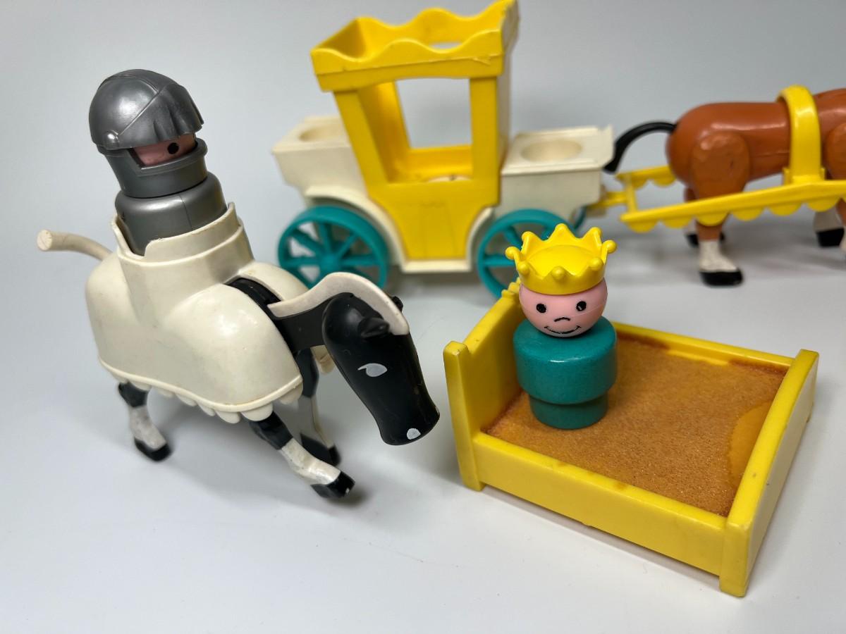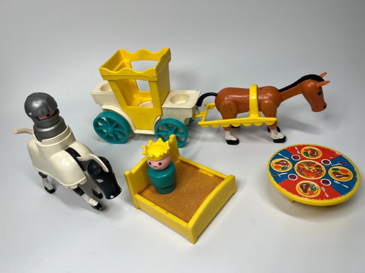 Rare vintage Fisher Price Little People playset #993 Play Family Castle. This playset is incomplete. In good vintage condition, some wear from previous play. Family Castle play set includes castle, royal carriage with horse, yellow double bed (foam aged), round yellow dining table with food sticker intact, black horse wearing white saddle, Prince with crown, and knight in armor. Missing multiple pieces, including king, queen, and dragon.