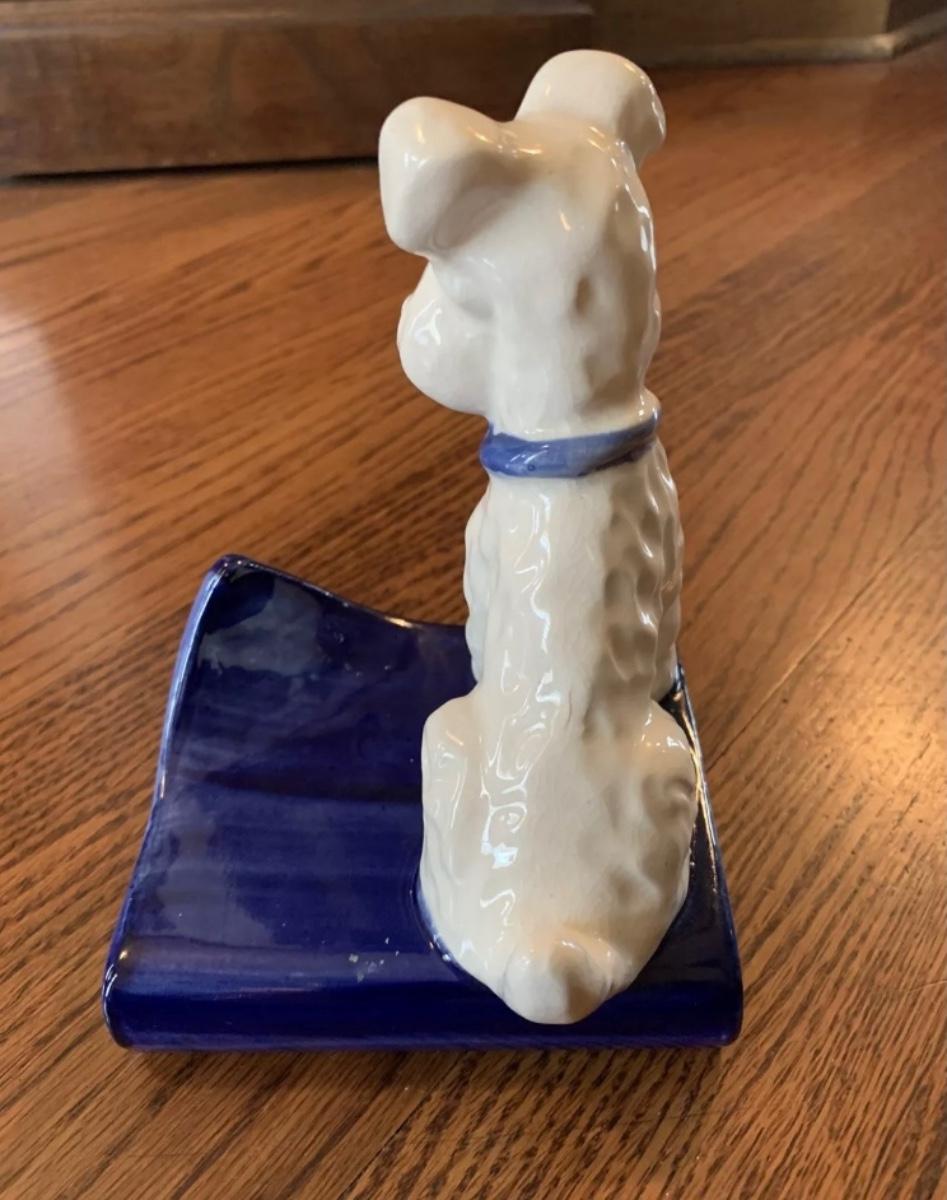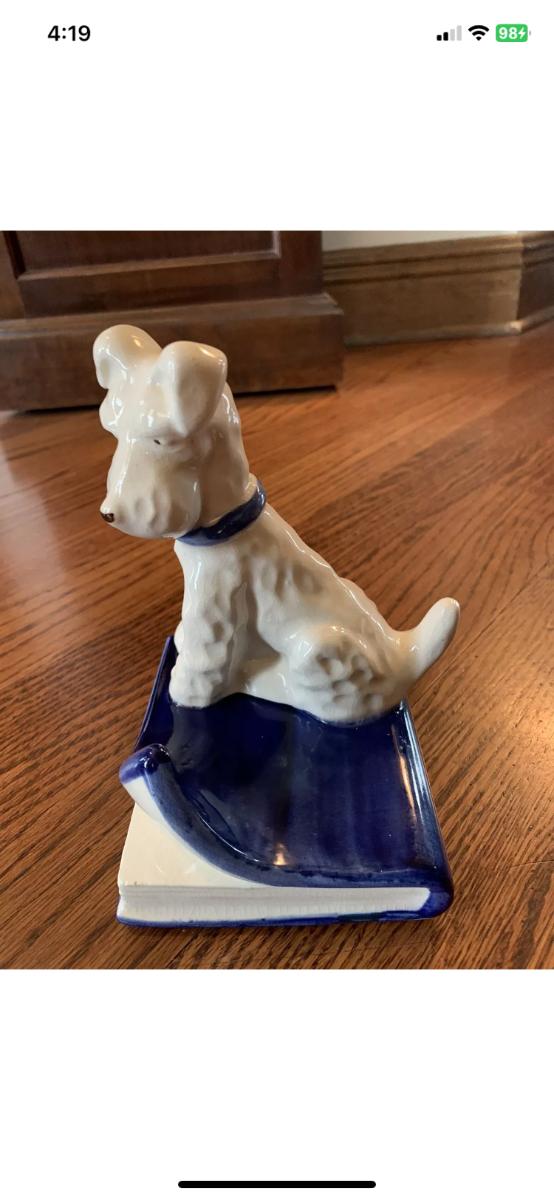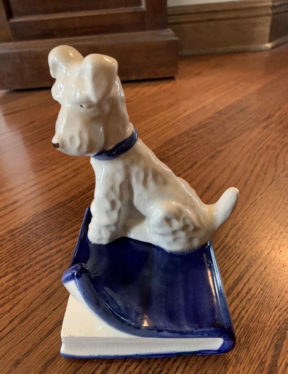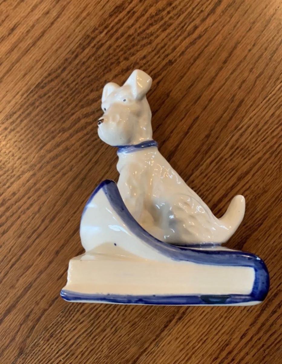 Vintage rare 1920s–30s HP porcelain Scottish terrier atop Cobalt Blue book