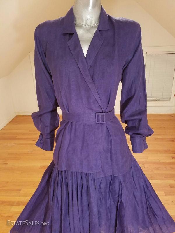 Stunning vintage Soho Luxury company Morgane le Fay linen slate dress that is made to look like an ensemble but is actually one piece wrap high low skirt with its own belt.
