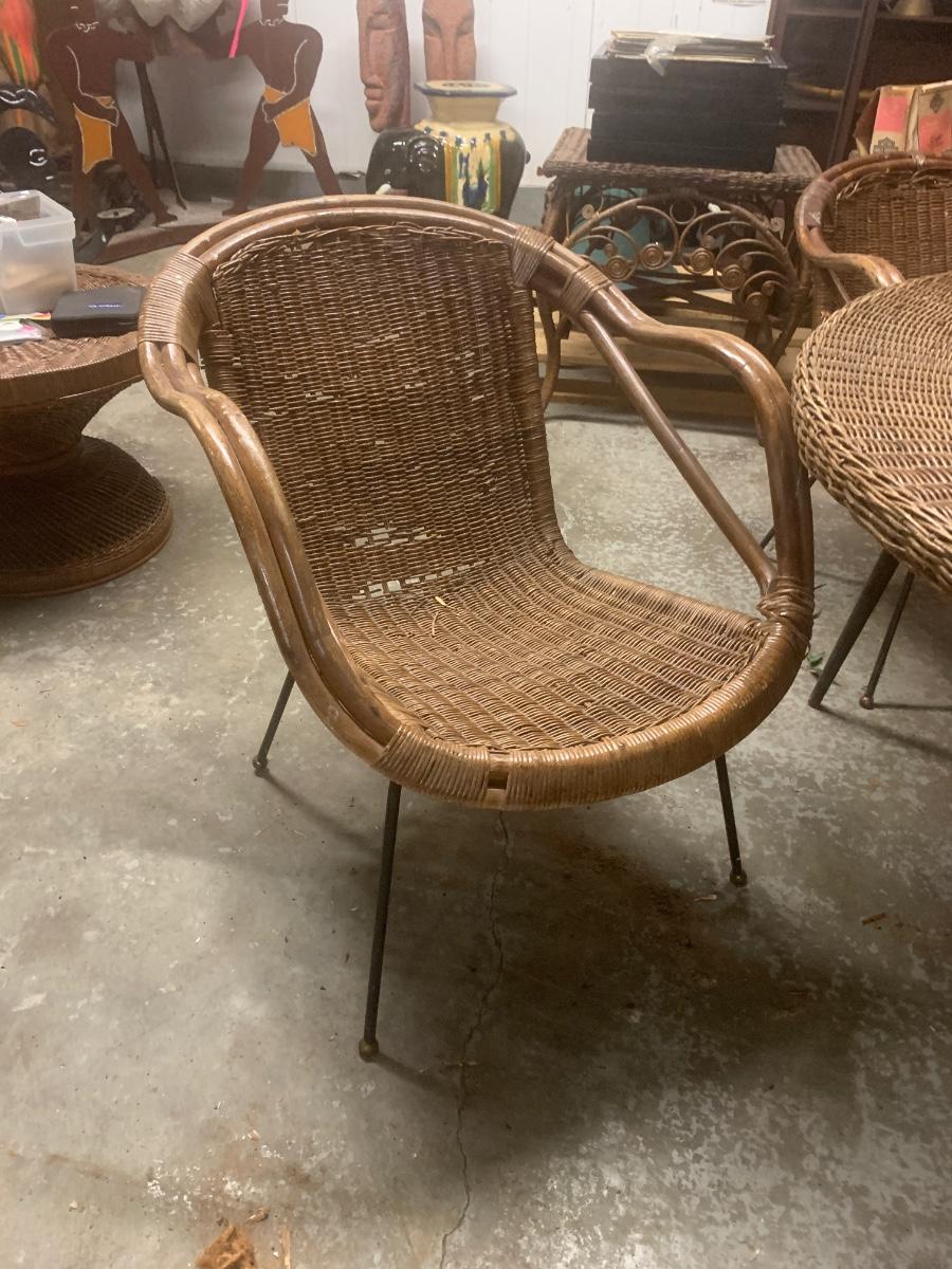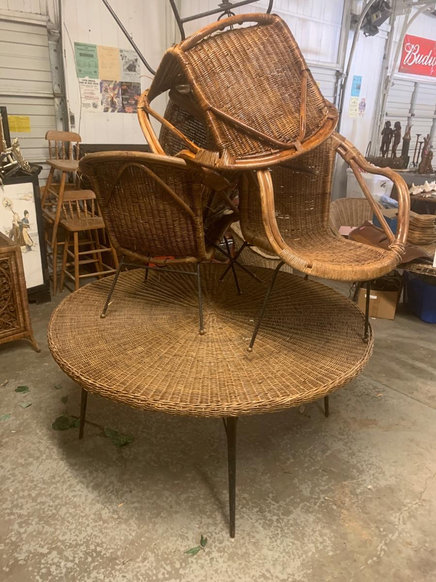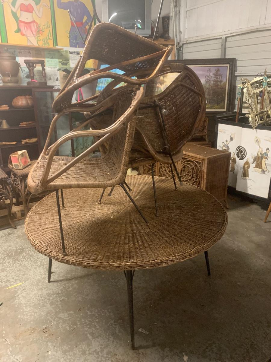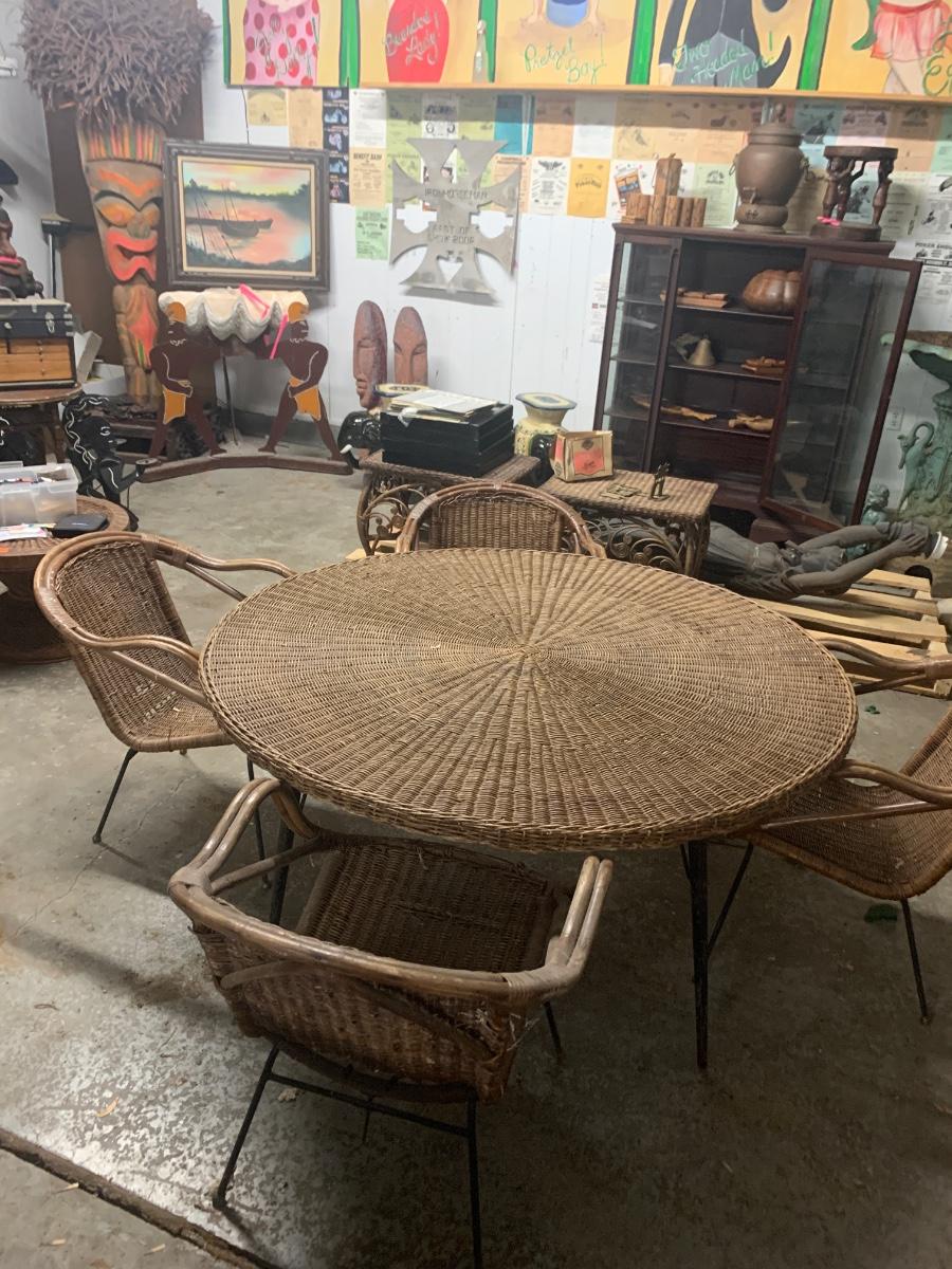 The table and chairs were used at the tiki house on the property. They are in good vintage condition. There is some wicker on the chairs that need repair.