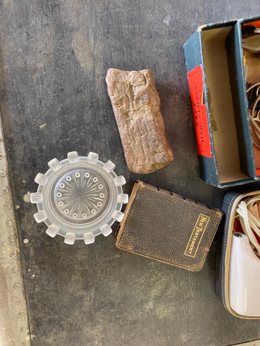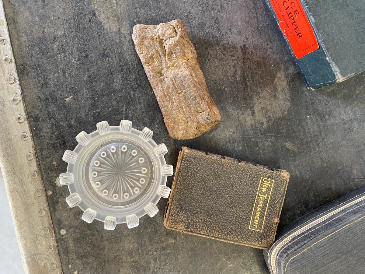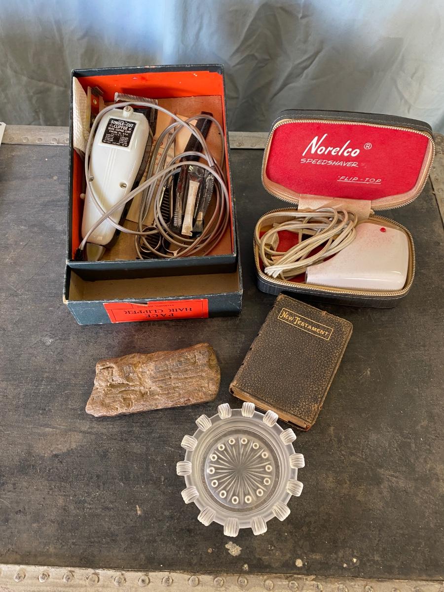 VINTAGE RAZORS, A PIECE OF PETRIFIED WOOD, AN ASH TRAY AND A POCKET BIBLE