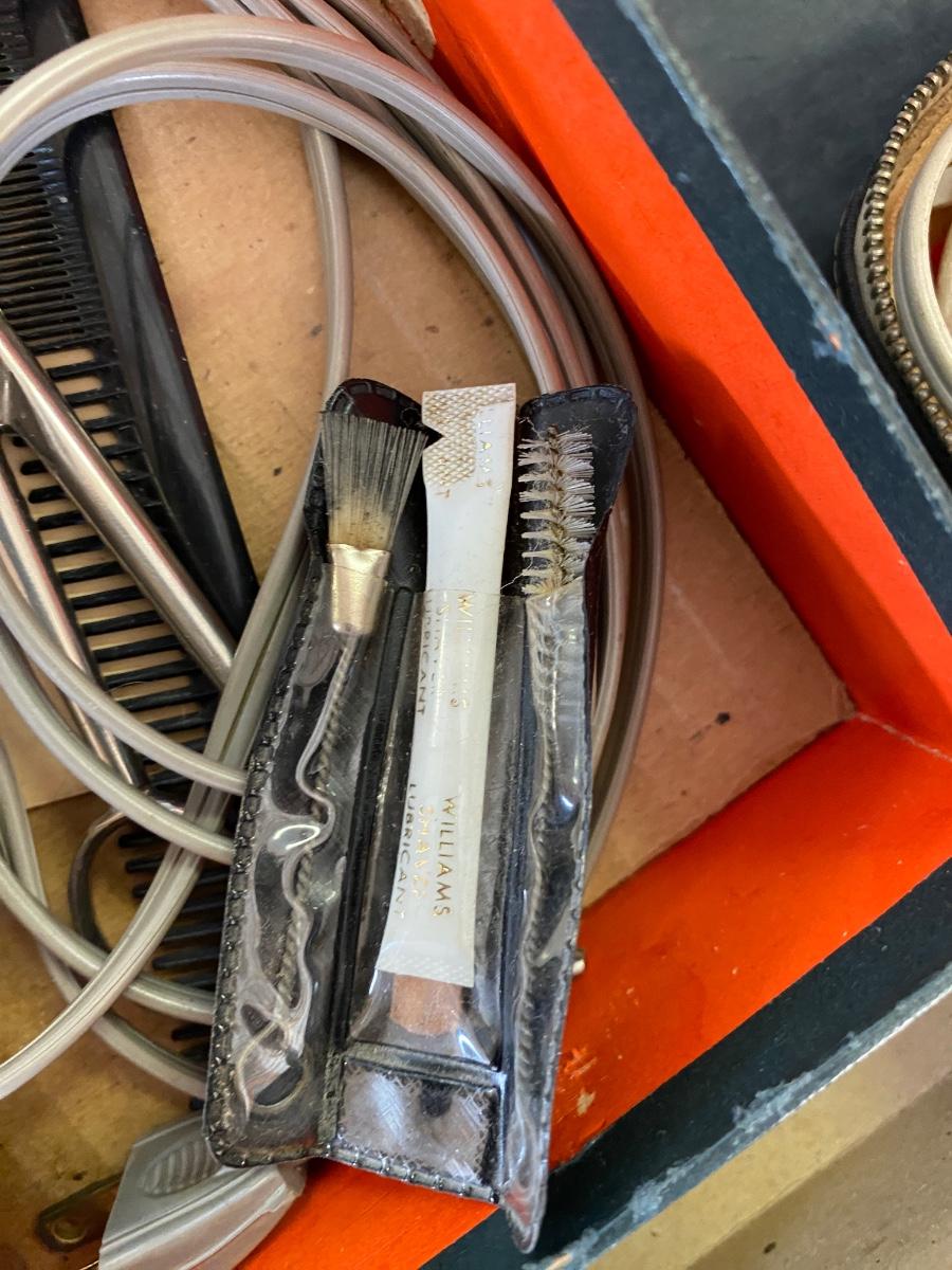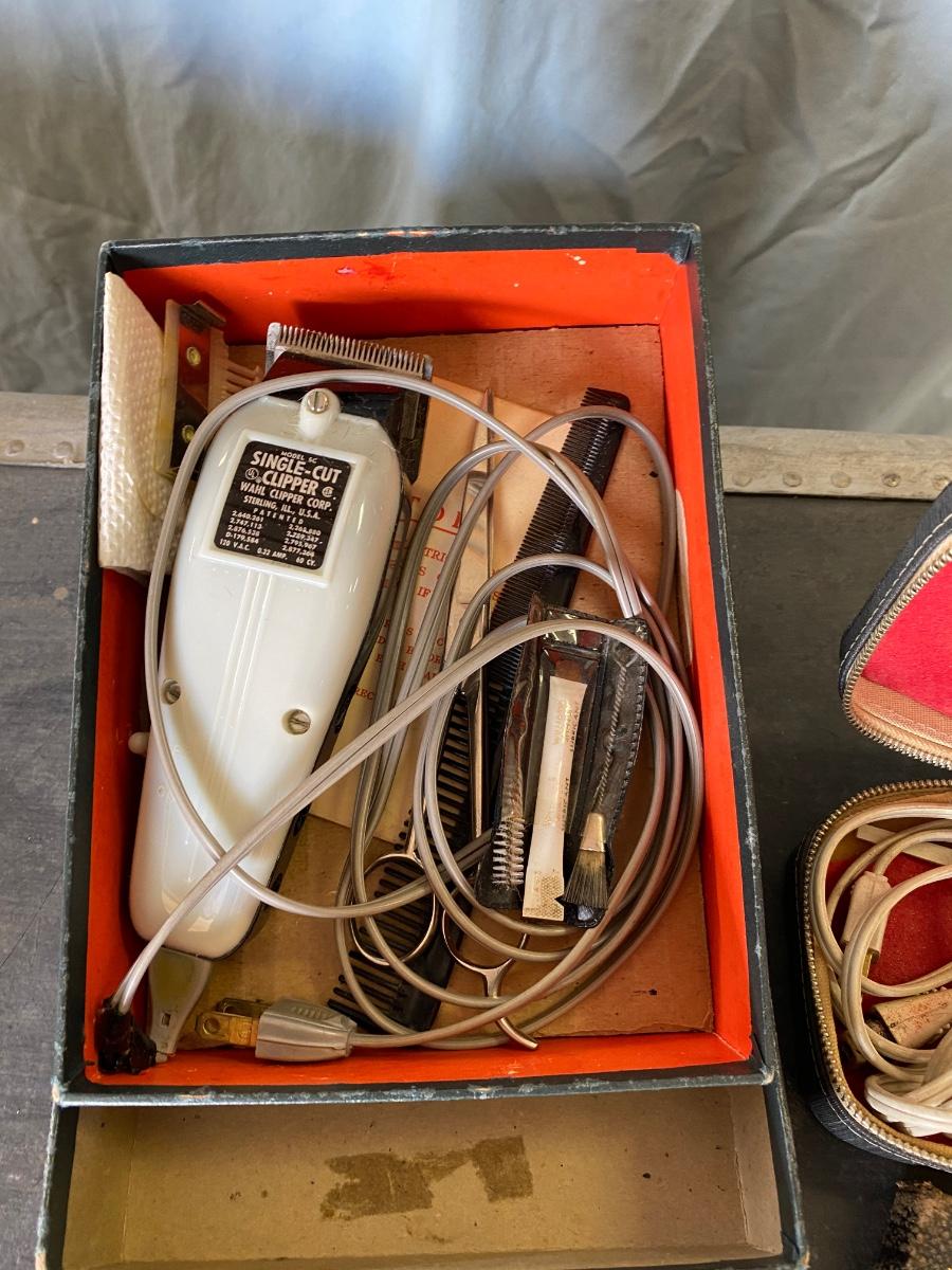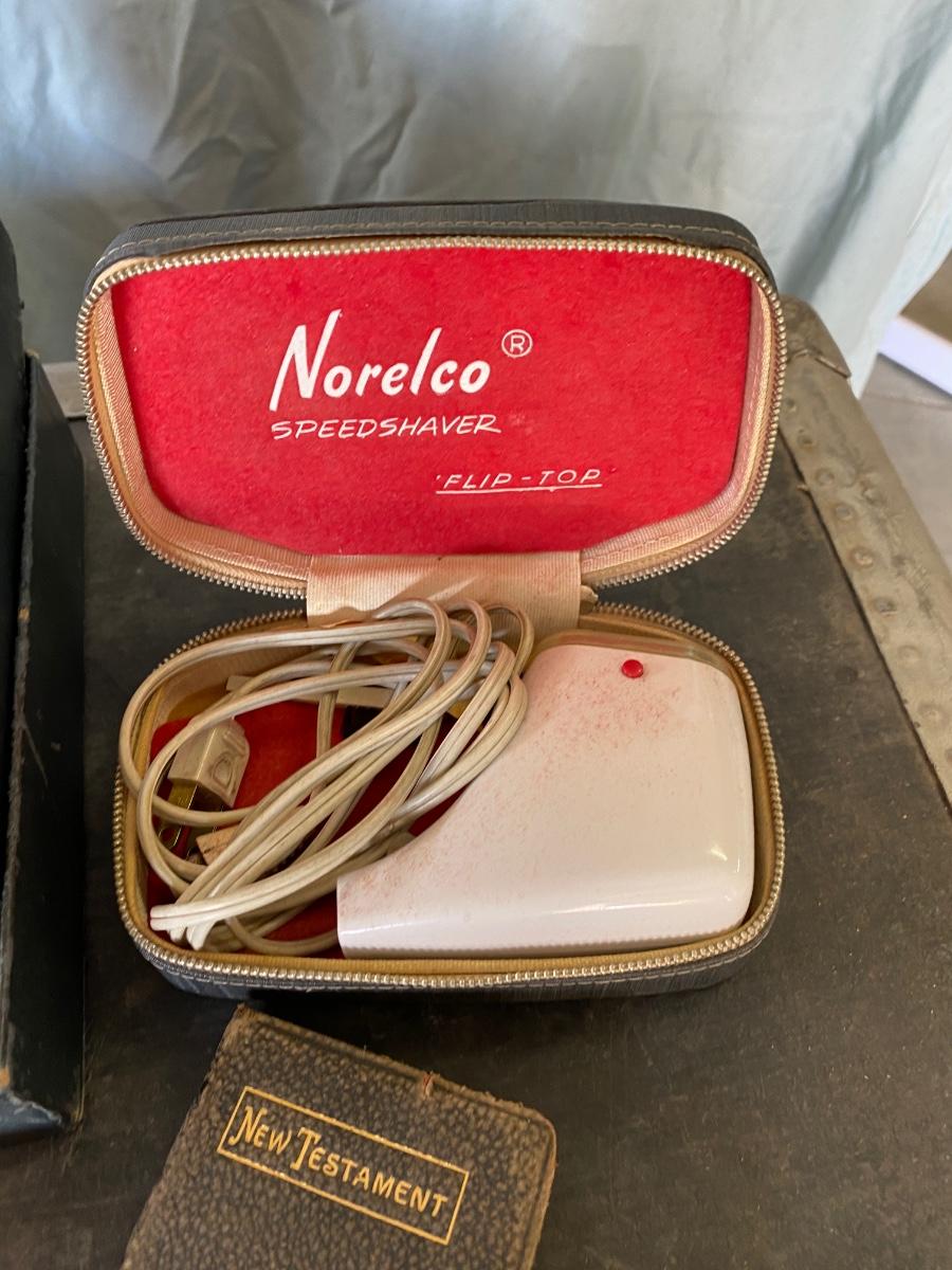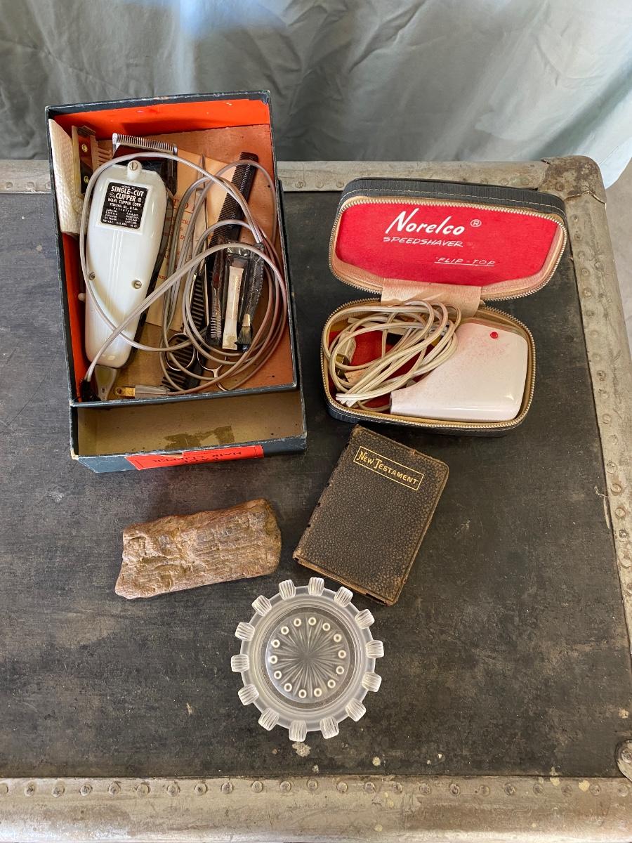 VINTAGE RAZORS, A PIECE OF PETRIFIED WOOD, AN ASH TRAY AND A POCKET BIBLE