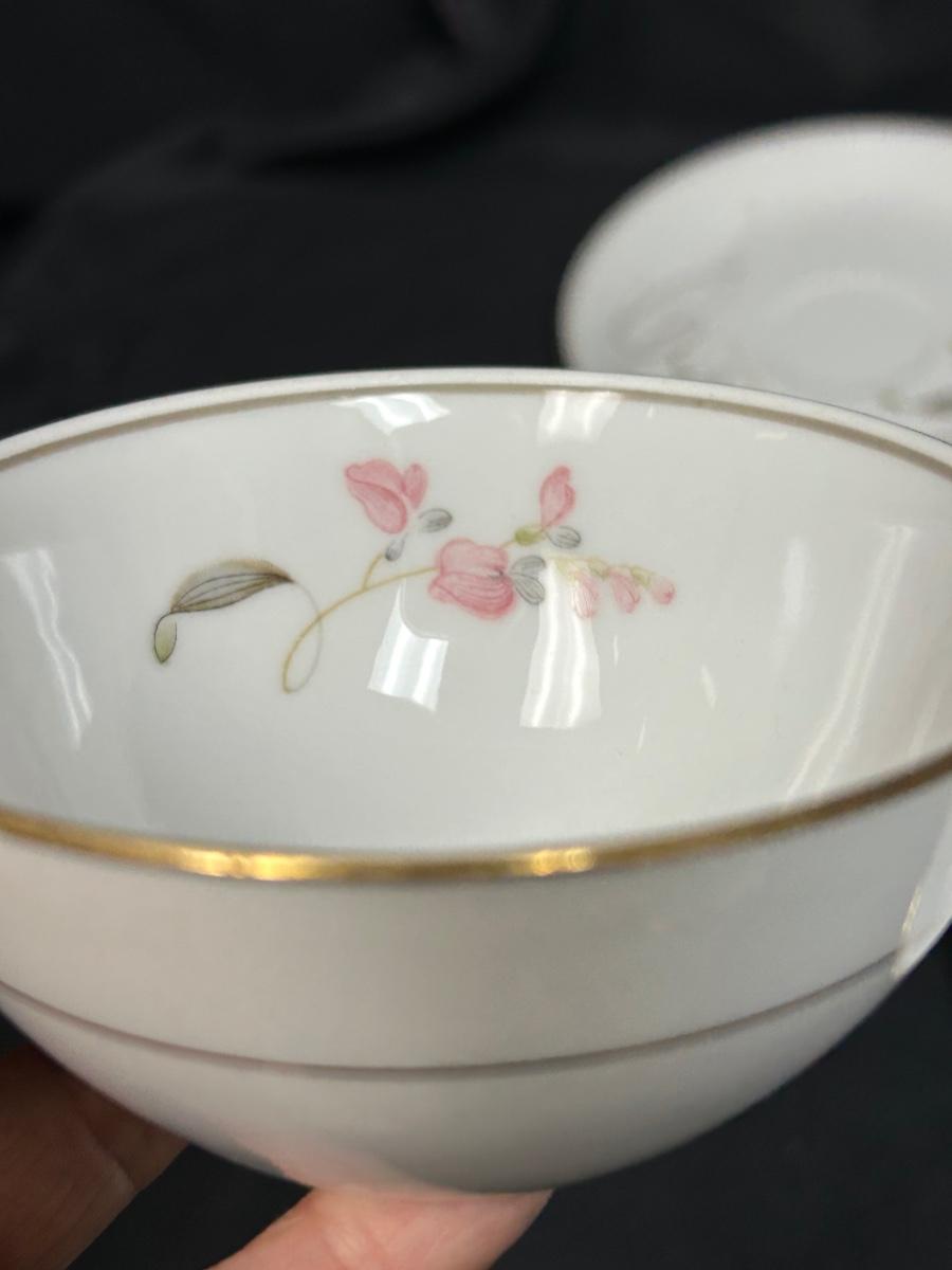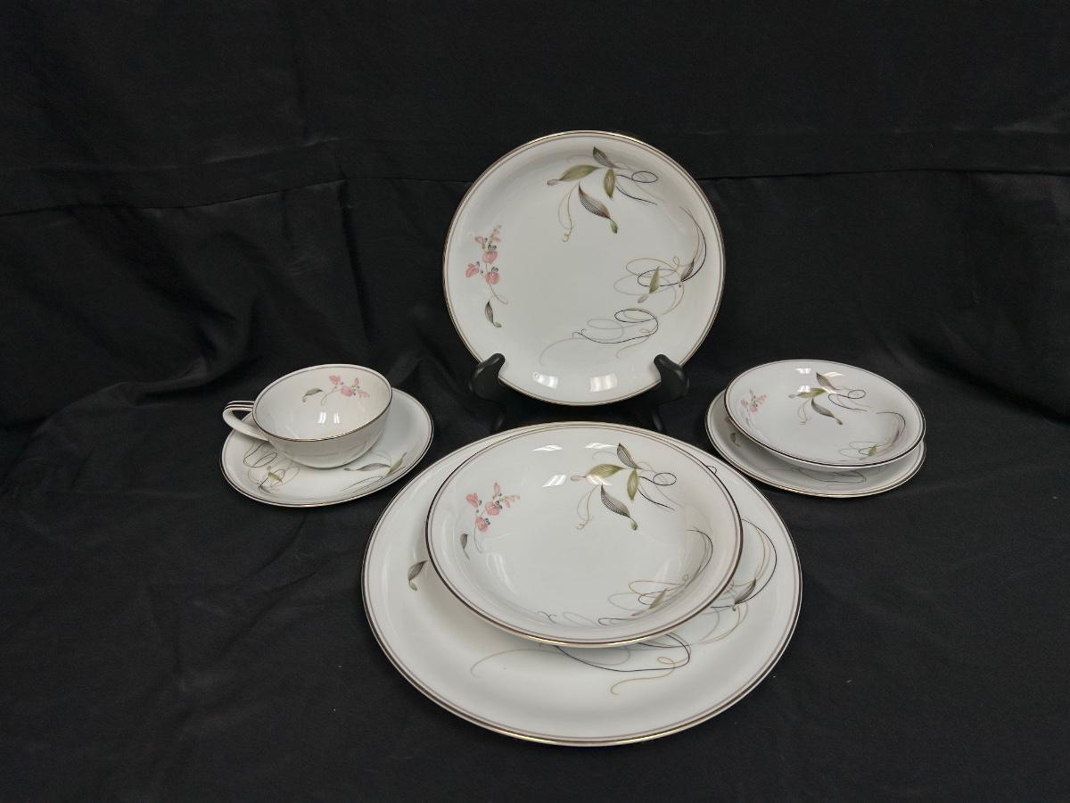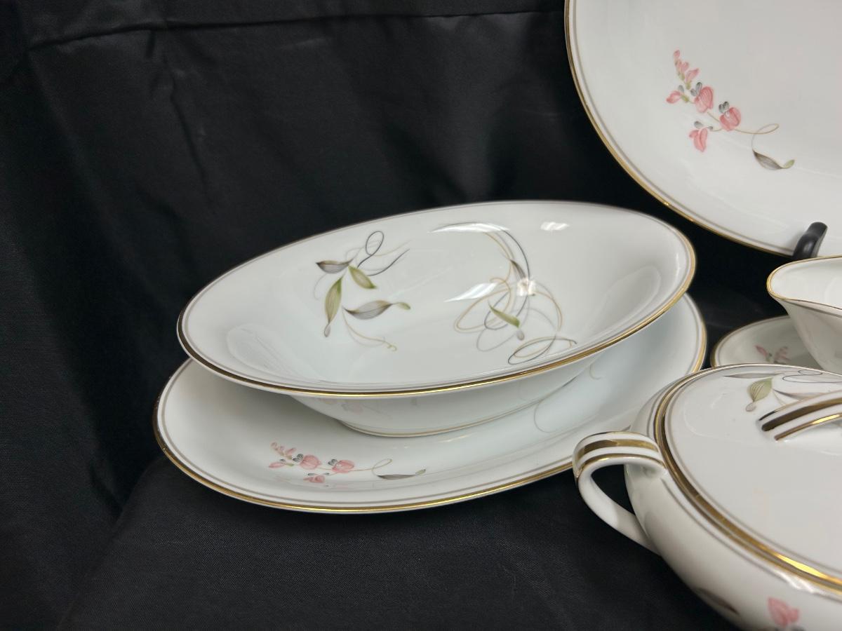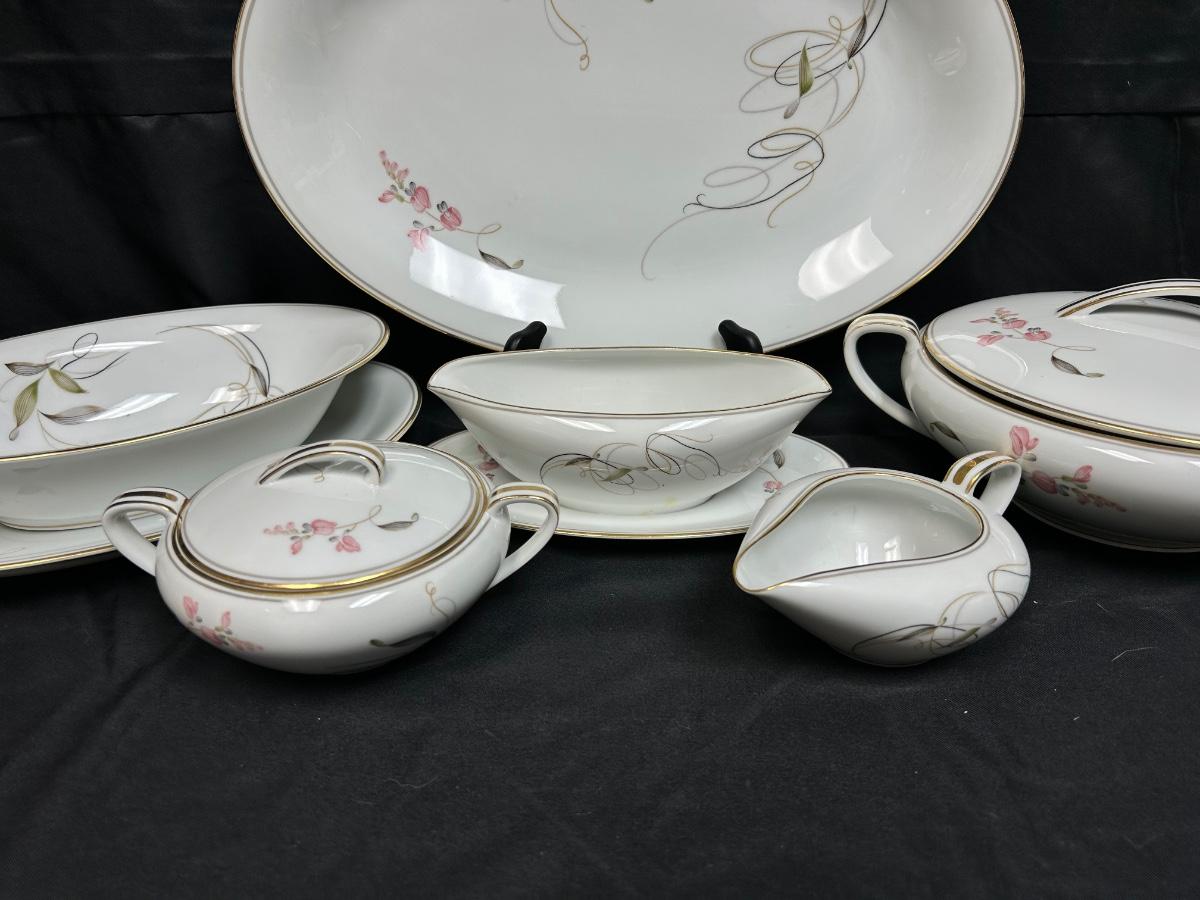 Vintage RC Royal China Noritake Japan Service for 12 China Set with Serving Pieces Pink Flower Black Swirl. 7-piece place setting includes dinner plate, salad plate, soup bowl, berry bowl, bread plate, cup, and saucer. Complete service for 12. Comes with serving pieces; lidded casserole, large platter, small platter, serving bowl, gravy/sauce boat with attached drip plate, creamer, and lidded sugar bowl. One dinner plate has a chip on the underside edge, may be flea bite chips but the one plate was the only noticeable chip.