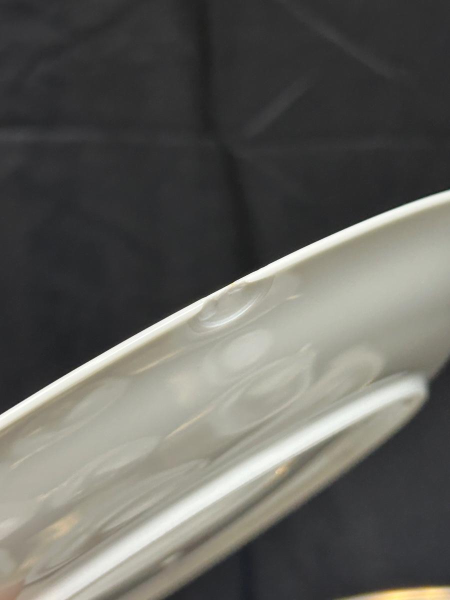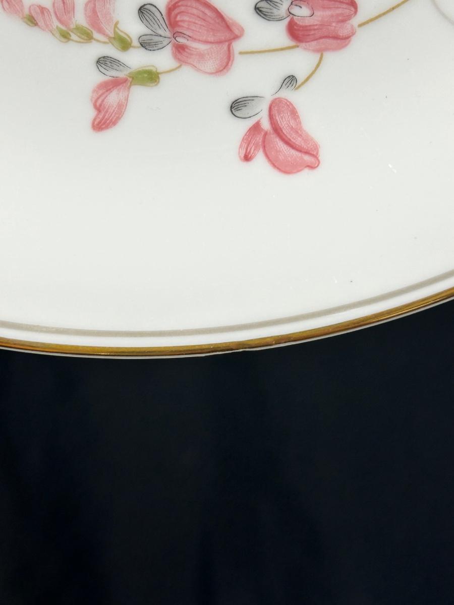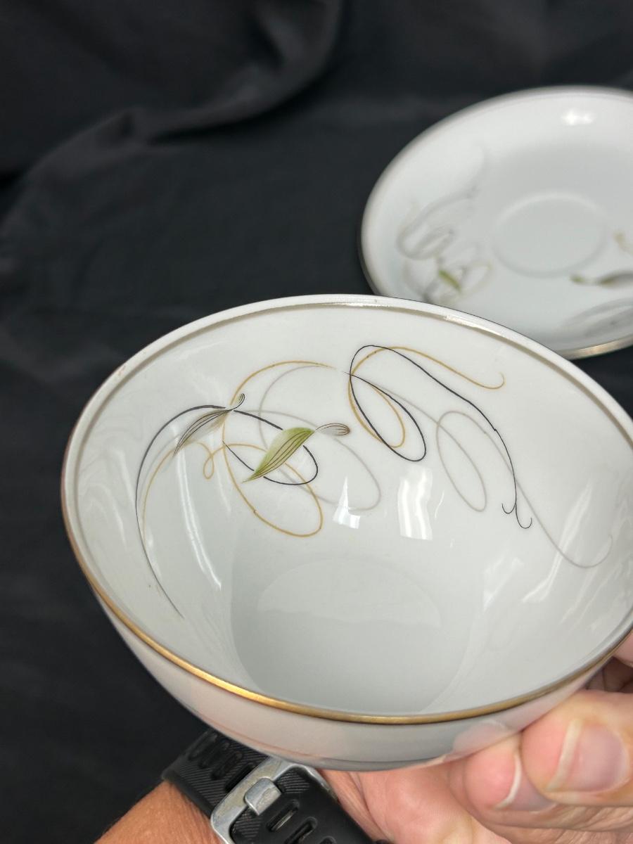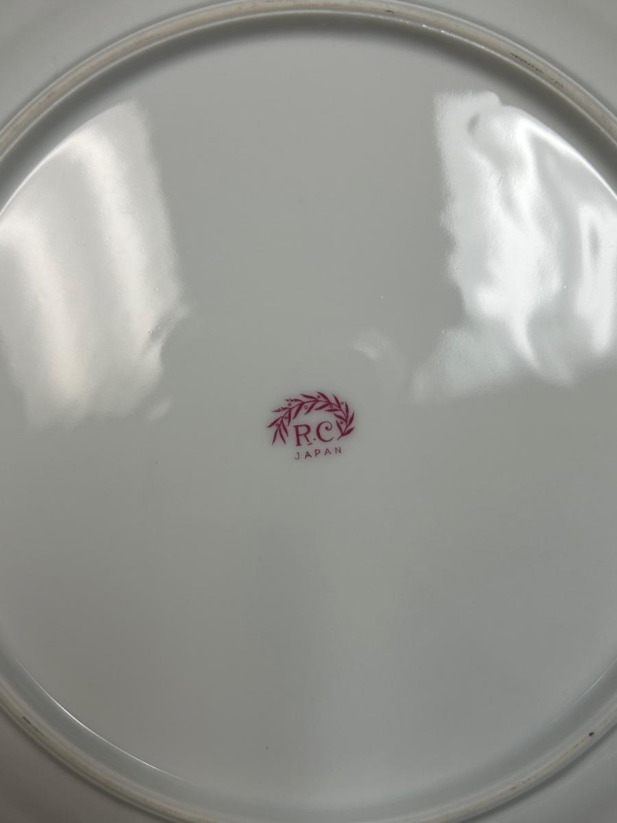 Vintage RC Royal China Noritake Japan Service for 12 China Set with Serving Pieces Pink Flower Black Swirl. 7-piece place setting includes dinner plate, salad plate, soup bowl, berry bowl, bread plate, cup, and saucer. Complete service for 12. Comes with serving pieces; lidded casserole, large platter, small platter, serving bowl, gravy/sauce boat with attached drip plate, creamer, and lidded sugar bowl. One dinner plate has a chip on the underside edge, may be flea bite chips but the one plate was the only noticeable chip.