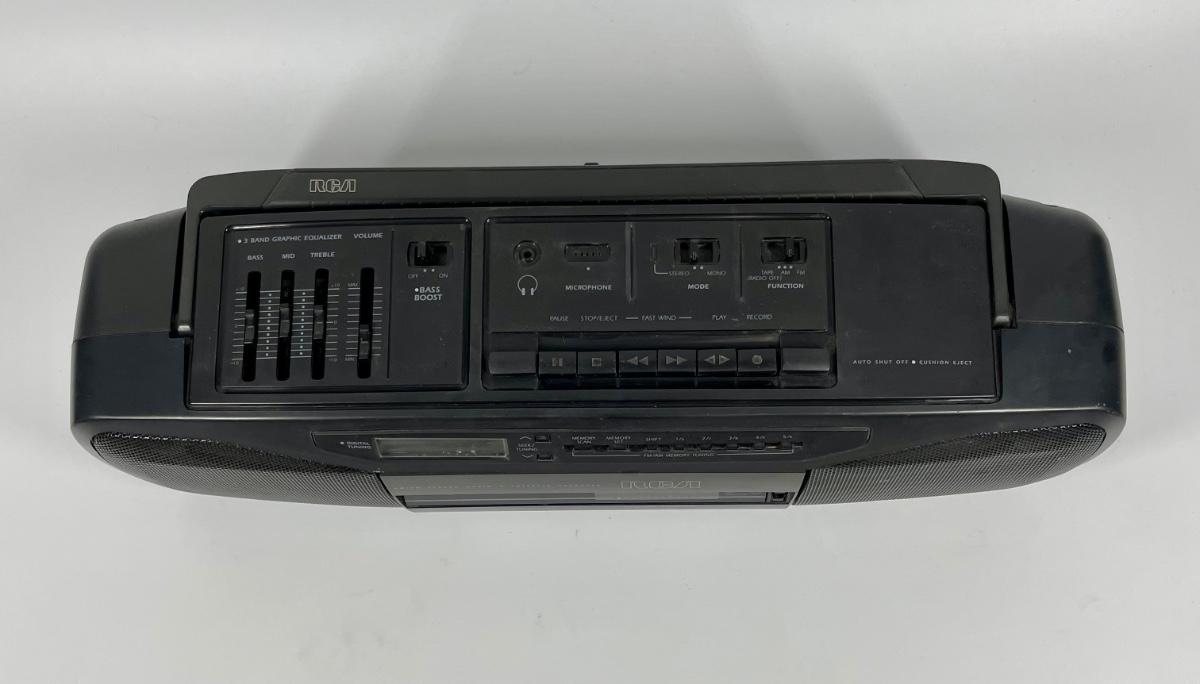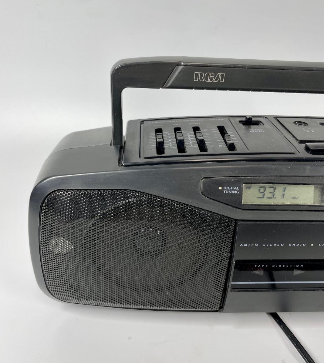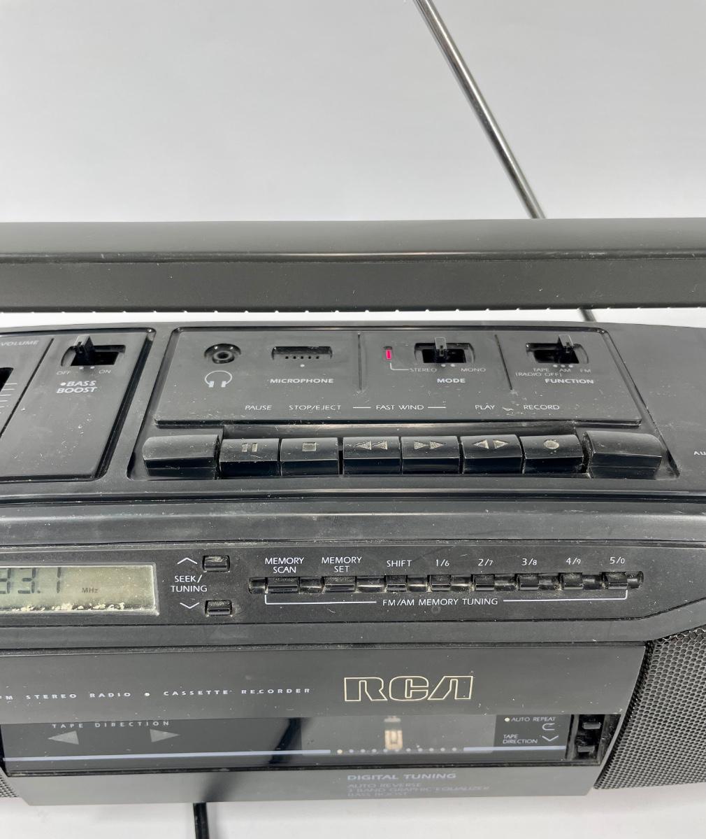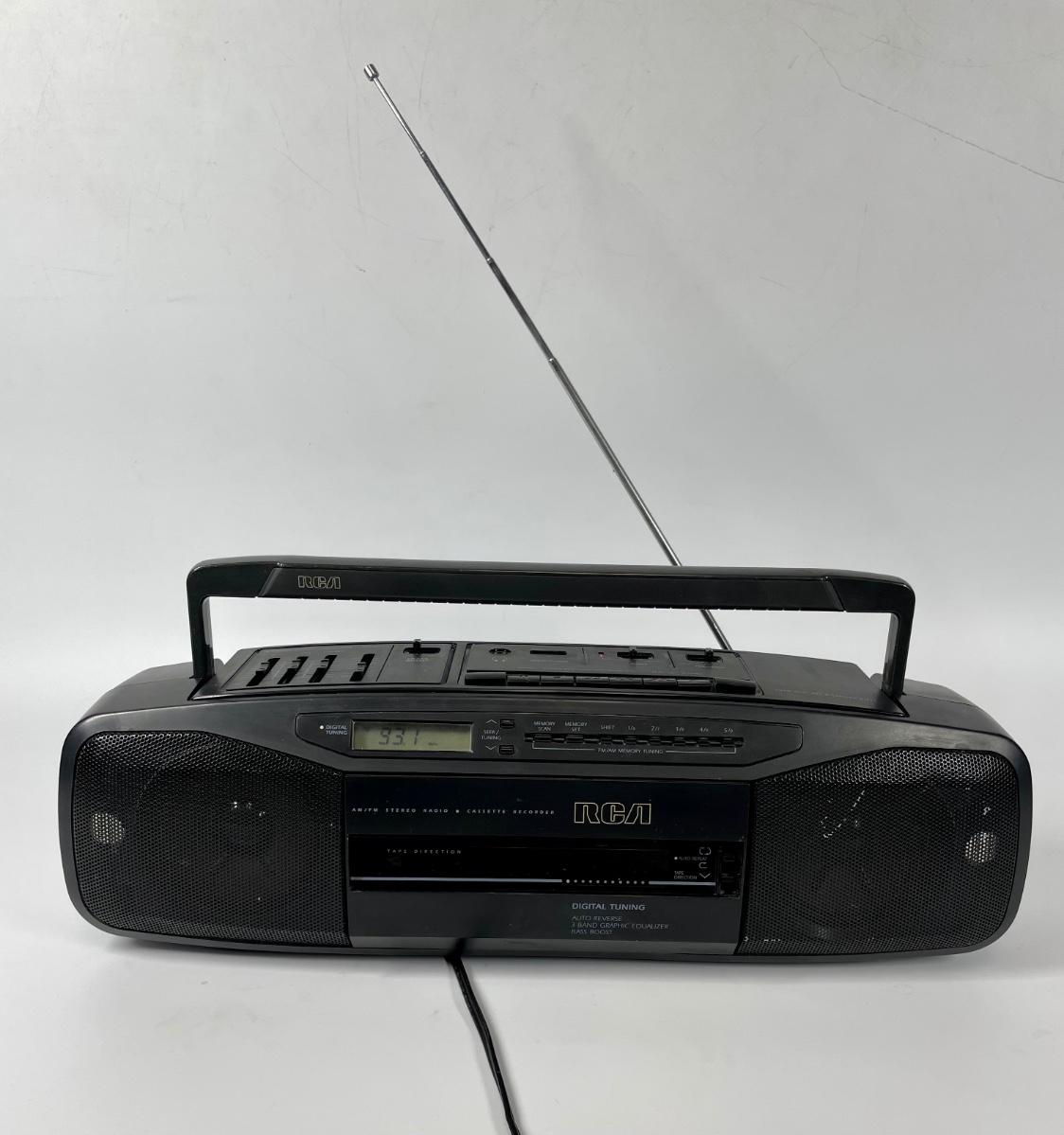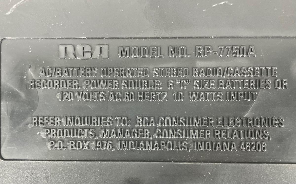 VIntage RCA model RP-7750A AM/FM radio and cassette player and boom box. All function tested and work as expected except for tape player - we did not have a cassette tape. FF and REW both spin as expected when tape deck buttons are pushed. Radio has good, clear sound. Antenna is straight, undamaged and extends easily.