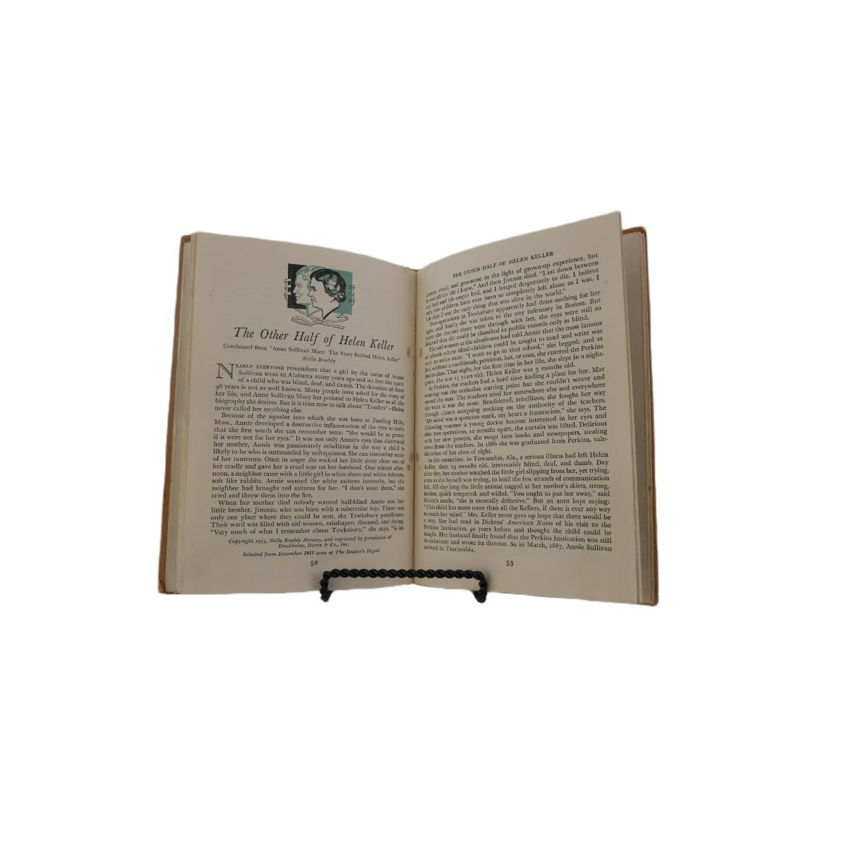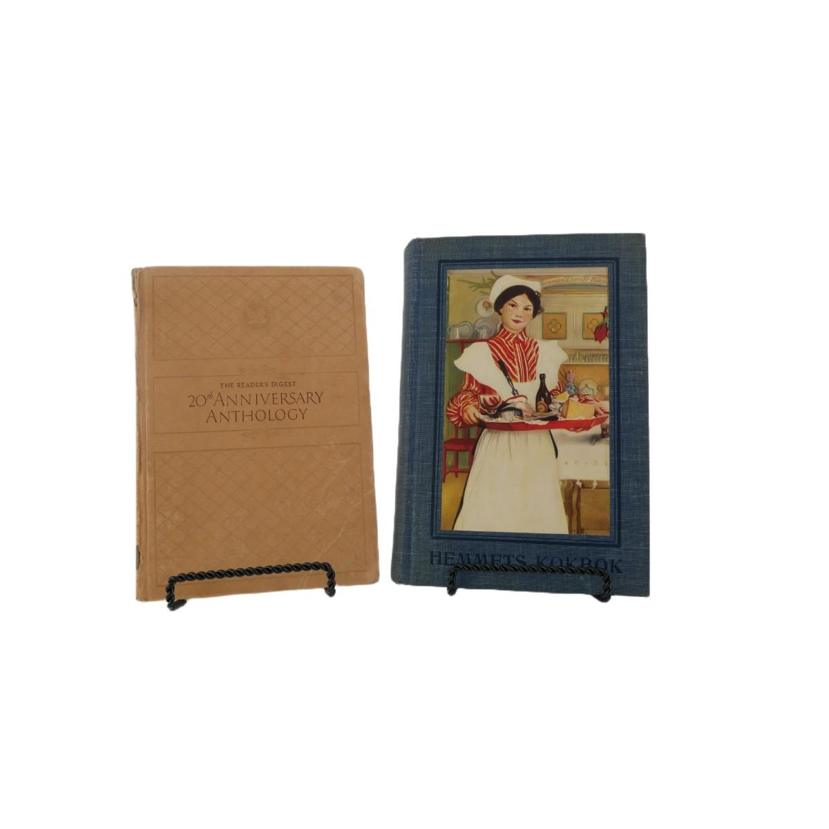 The Reader's Digest 20th Anniversary Anthology copyright, 1941 First Edition. Binding has some issues, but overall good condition for its age. Measures 5.5" x 8". Hemmets Kokbok copyright, 1937. A fully Swedish cookbook. In wonderful condition! Measures 6" x 8.5". Lot weighs 2 lbs. (M4)