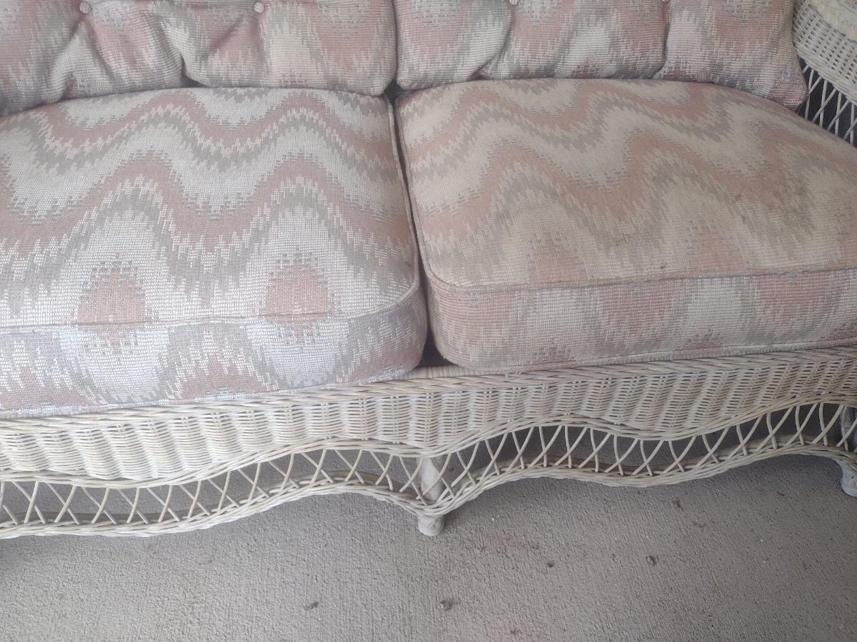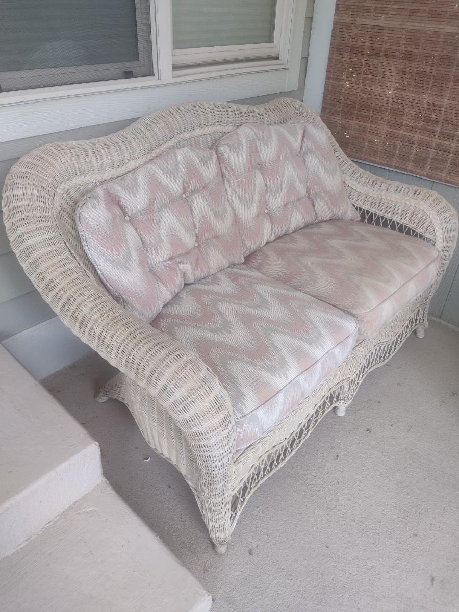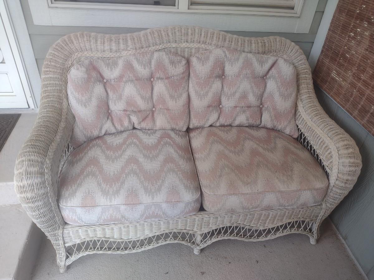 Vintage Real Wicker Loveseat with Cushions. Expect some wear and broken reeds as shown.