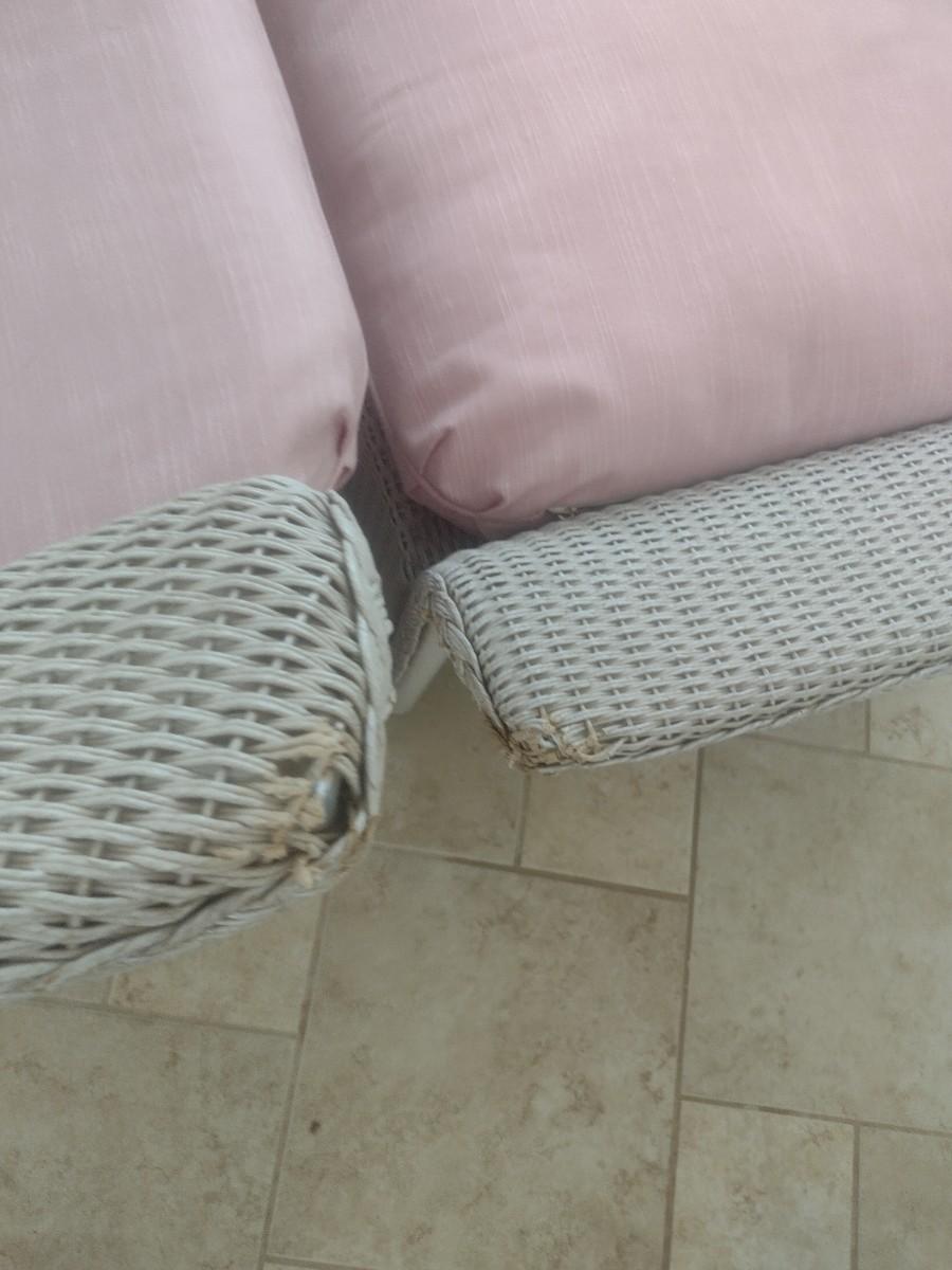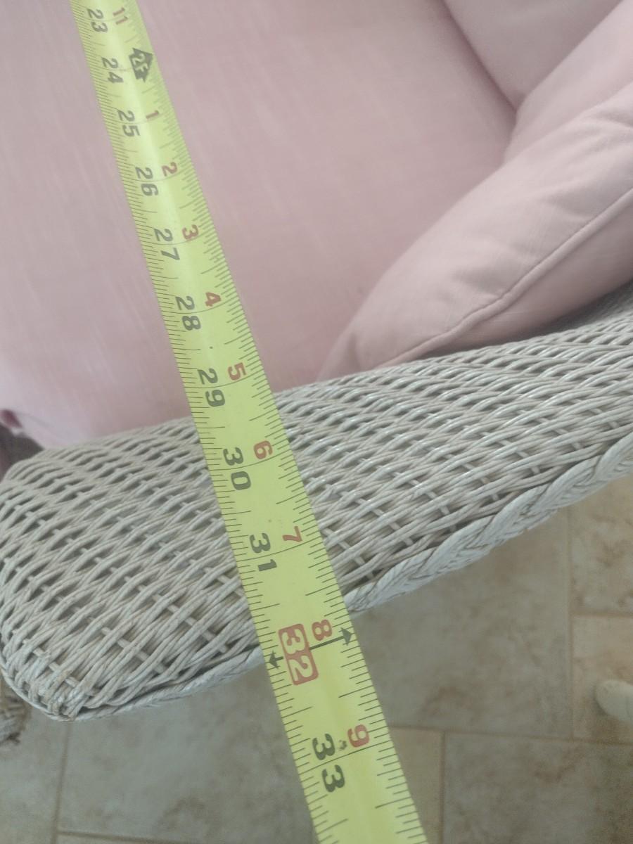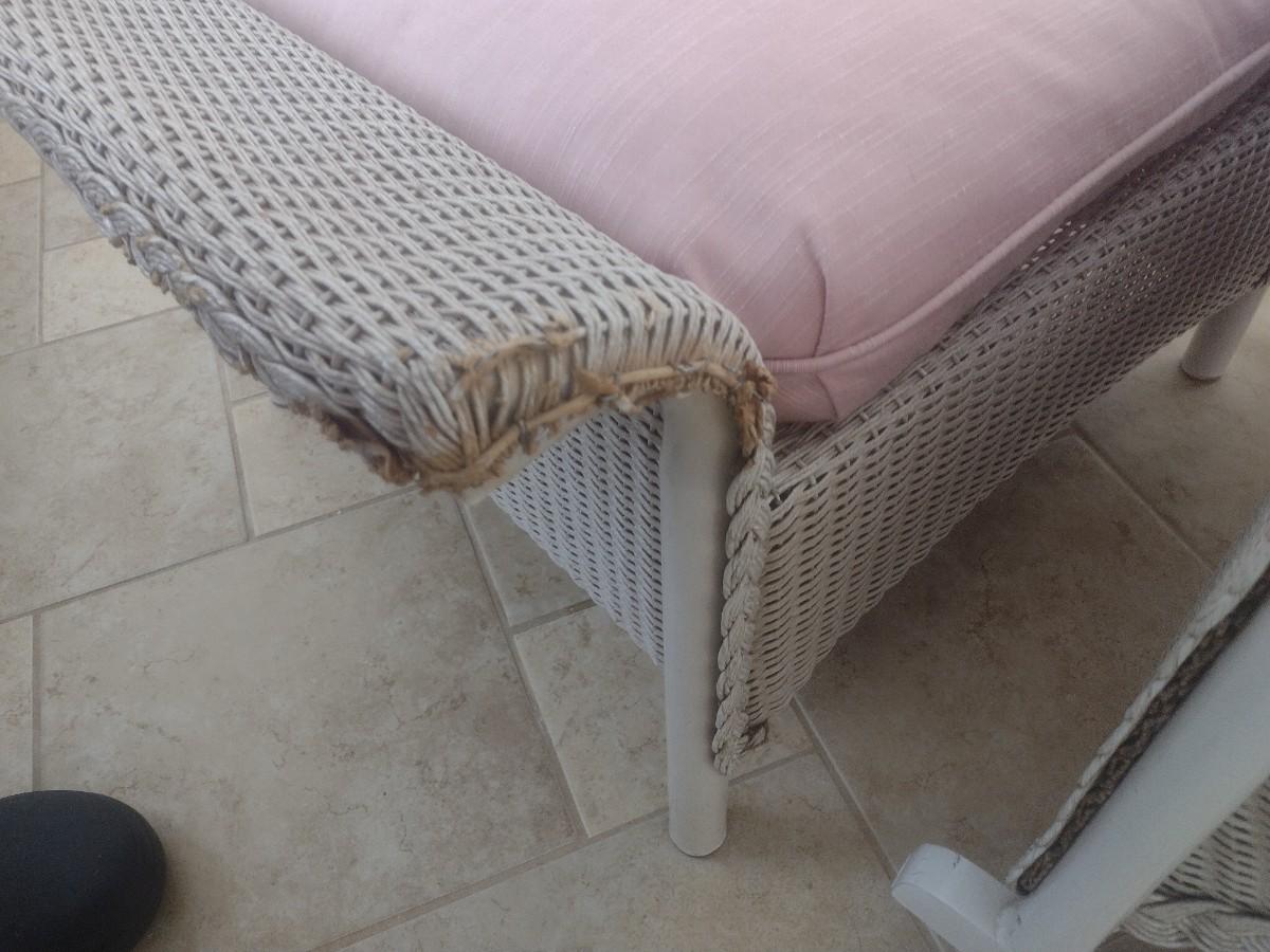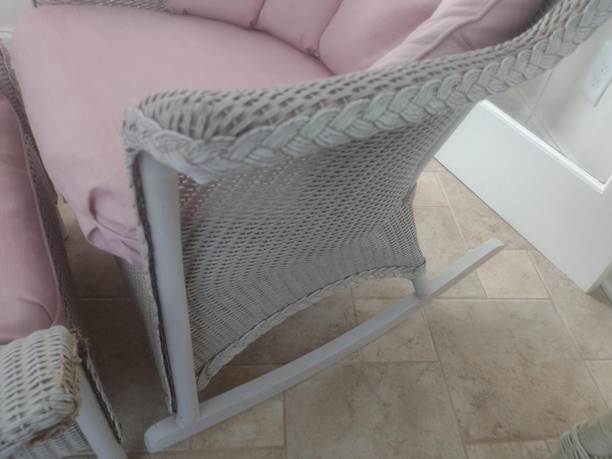 Vintage Real Wicker Rocking Chair with Matching Ottoman with Cushions. Expect some wear and broken pieces of reed. See pictures for sampling of possible issues.