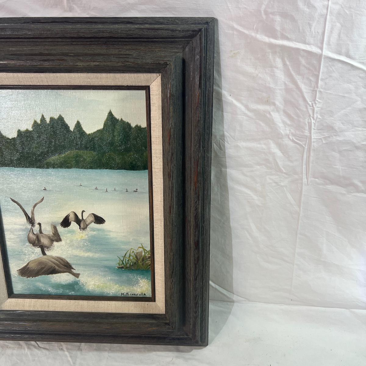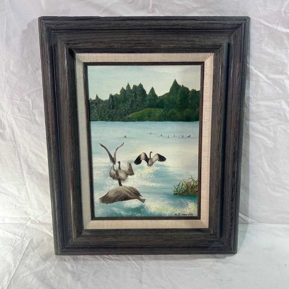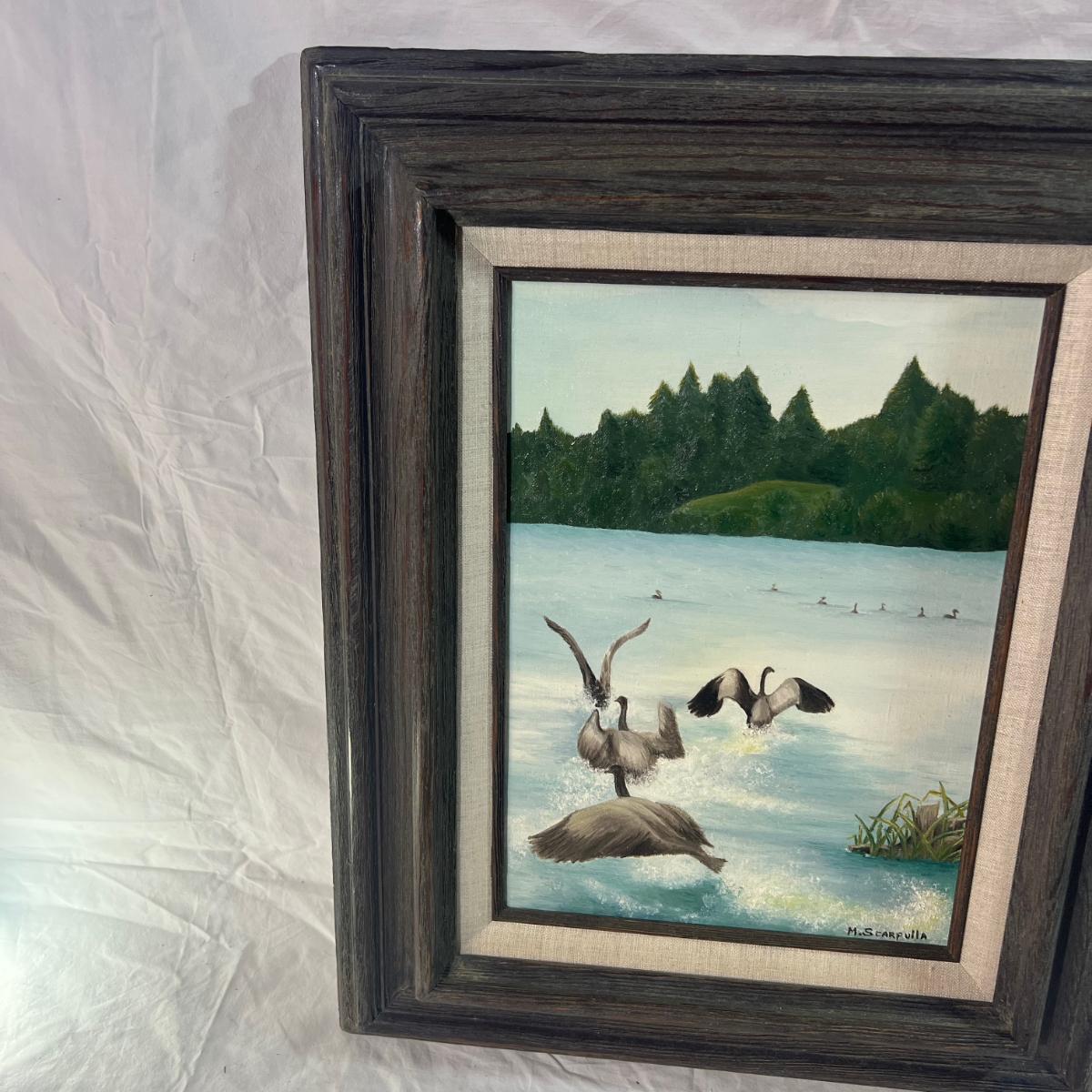 Real Wood grey Frame with oil painting of Canadian Geese on a pond. Artist signed M. Scarpulla. Dimension are 17 1/4" x 21 1/4"