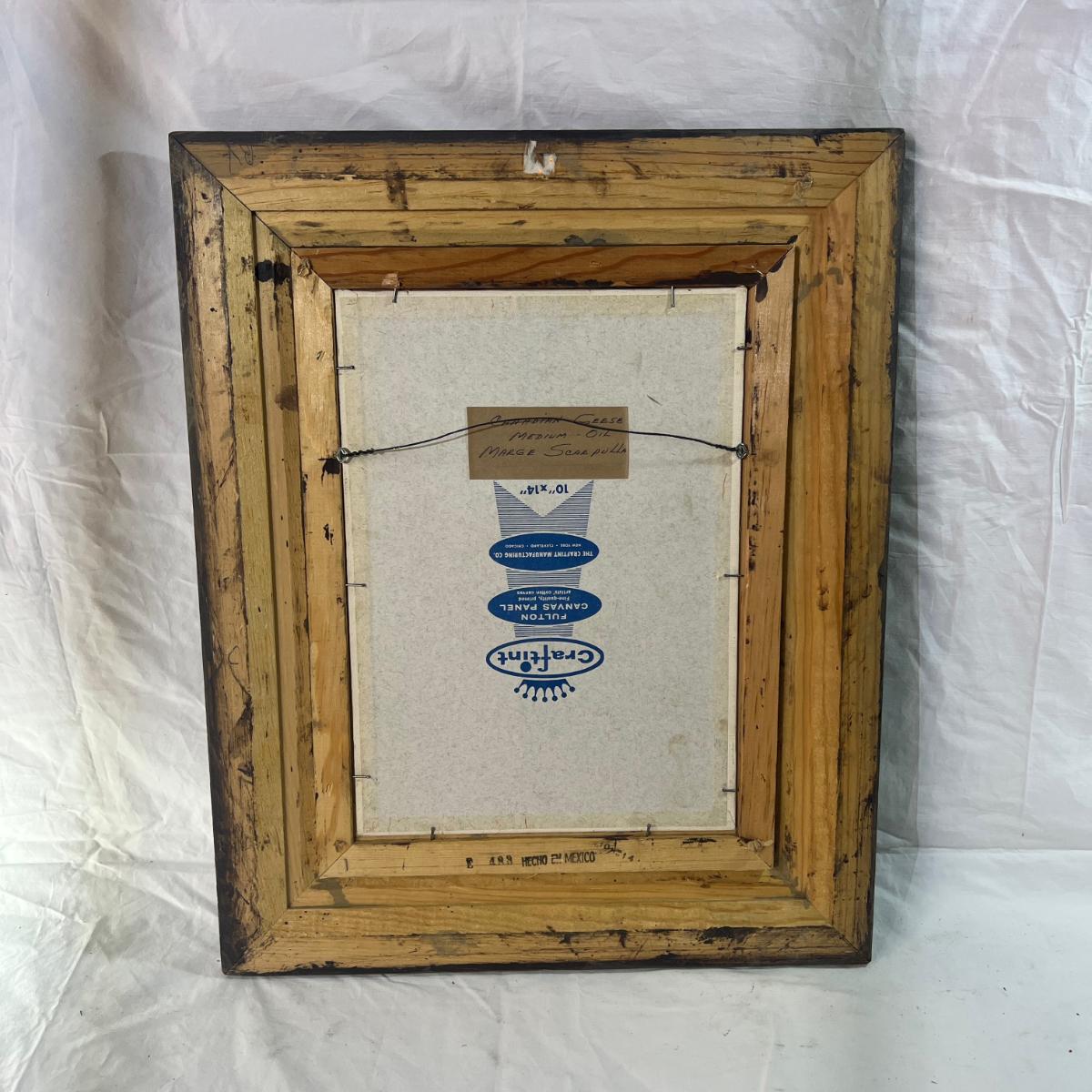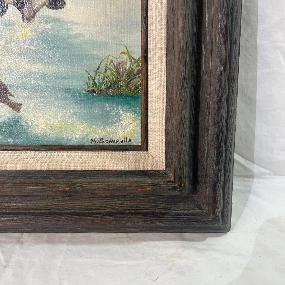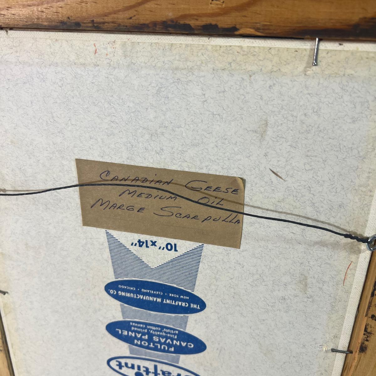 Real Wood grey Frame with oil painting of Canadian Geese on a pond. Artist signed M. Scarpulla. Dimension are 17 1/4" x 21 1/4"