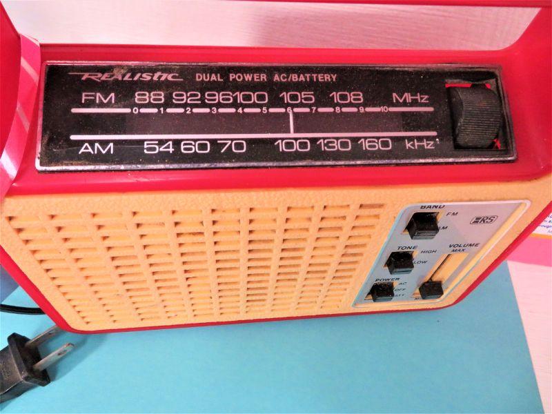 Vintage Realistic RED AM/FM Transistor Dual Power AC / Battery Radio. AM works / FM has static. Antenna moves up & down. Battery compartment holds power wire. In Good Condition for its age.