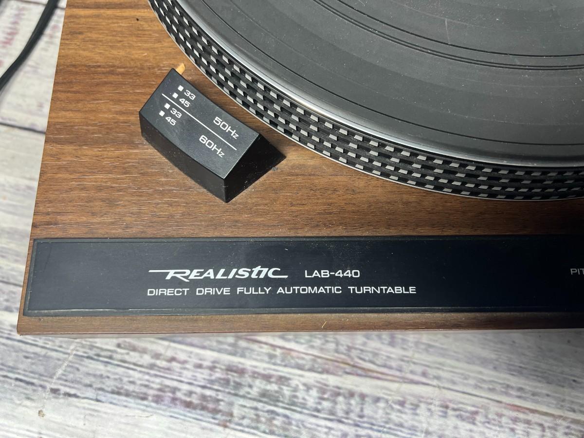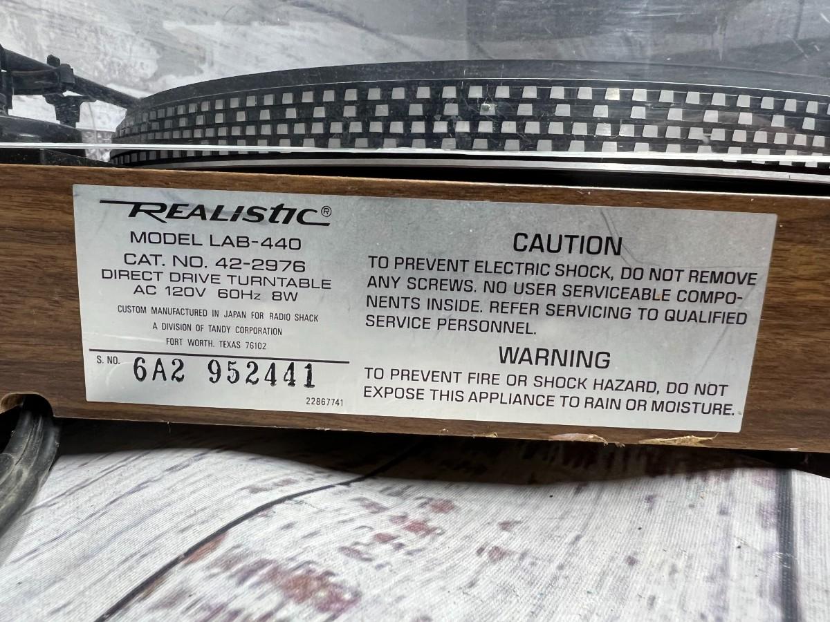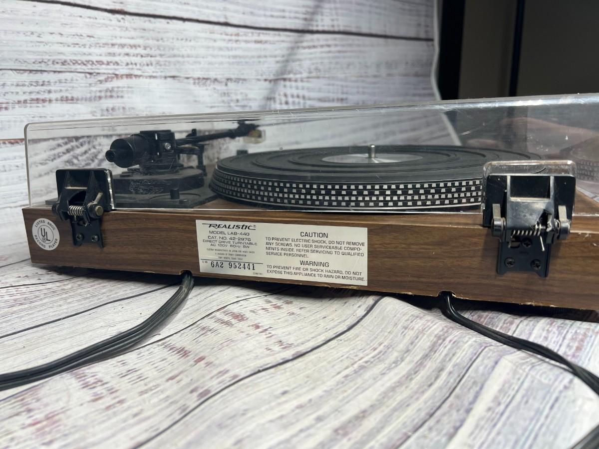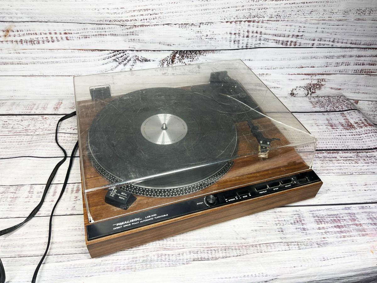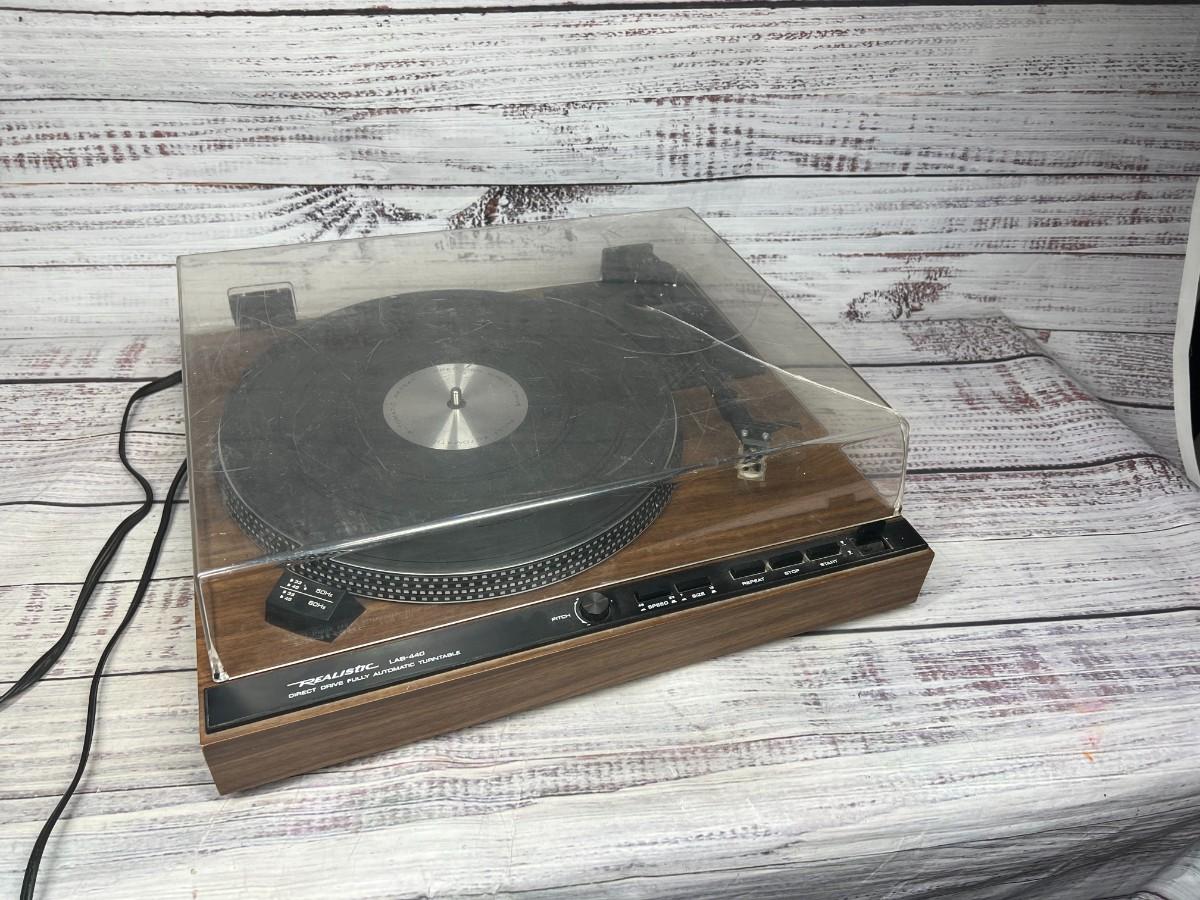 Vintage Realistic Turntable Record Player LAB - 440, the plastic clear clover is cracked and does not stand up when lifted. The record player powers on when plugged in and the turn table rotates, has not been tested with a record or a speaker. Check pictures for more details and for sizing.