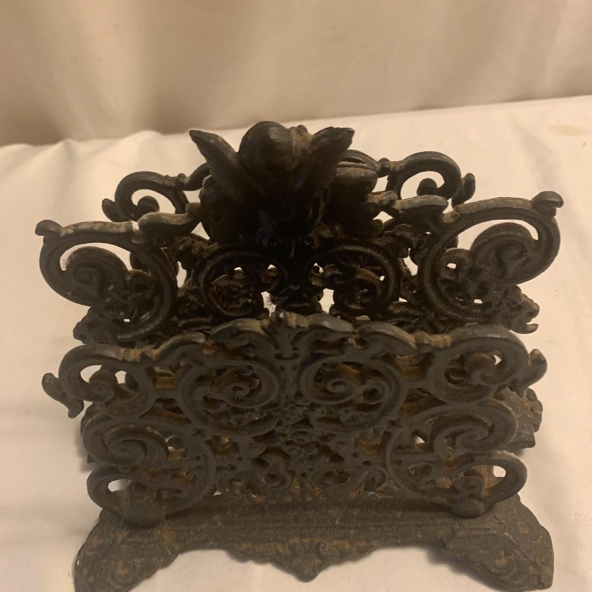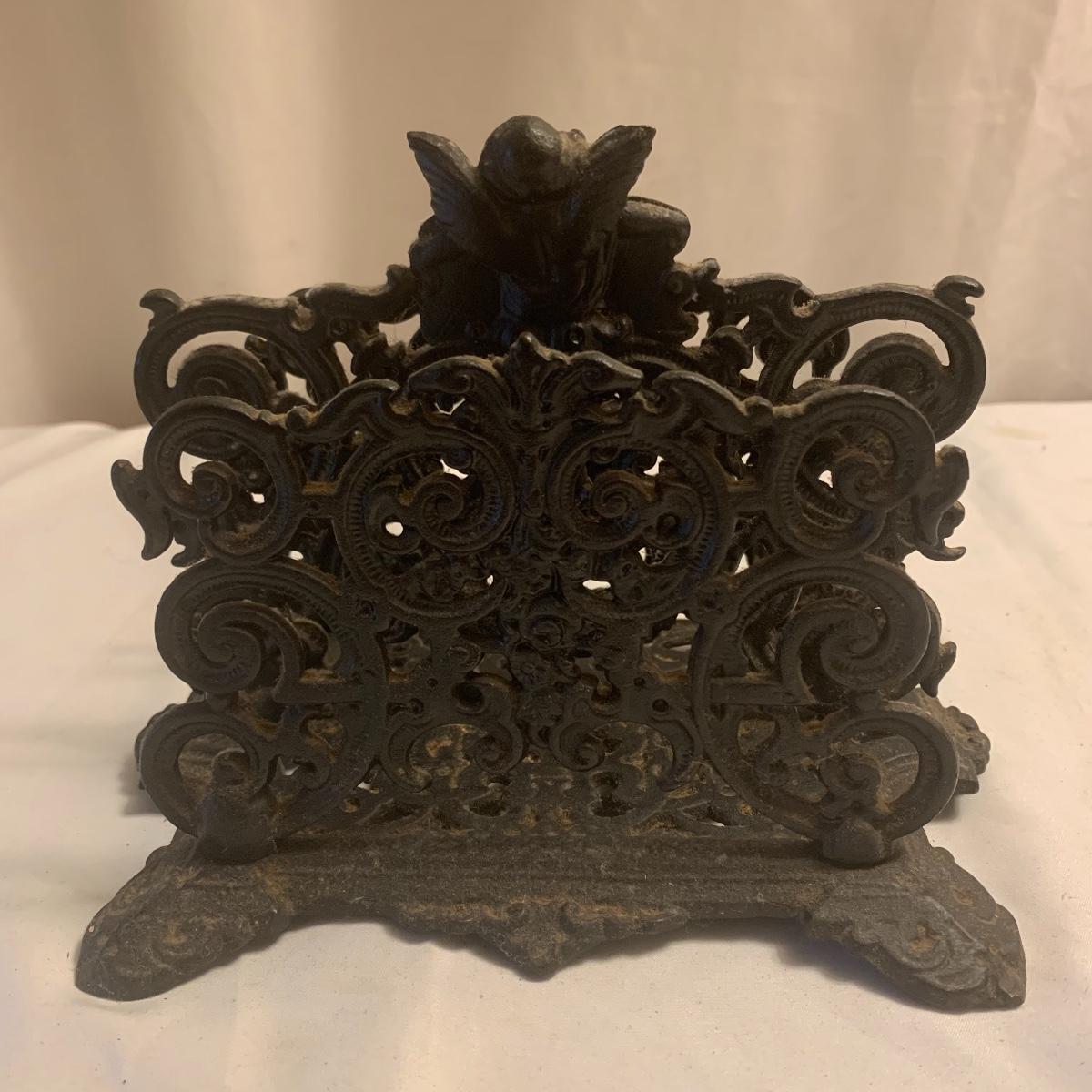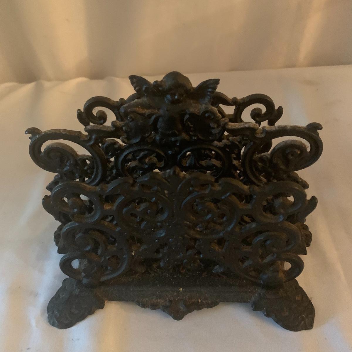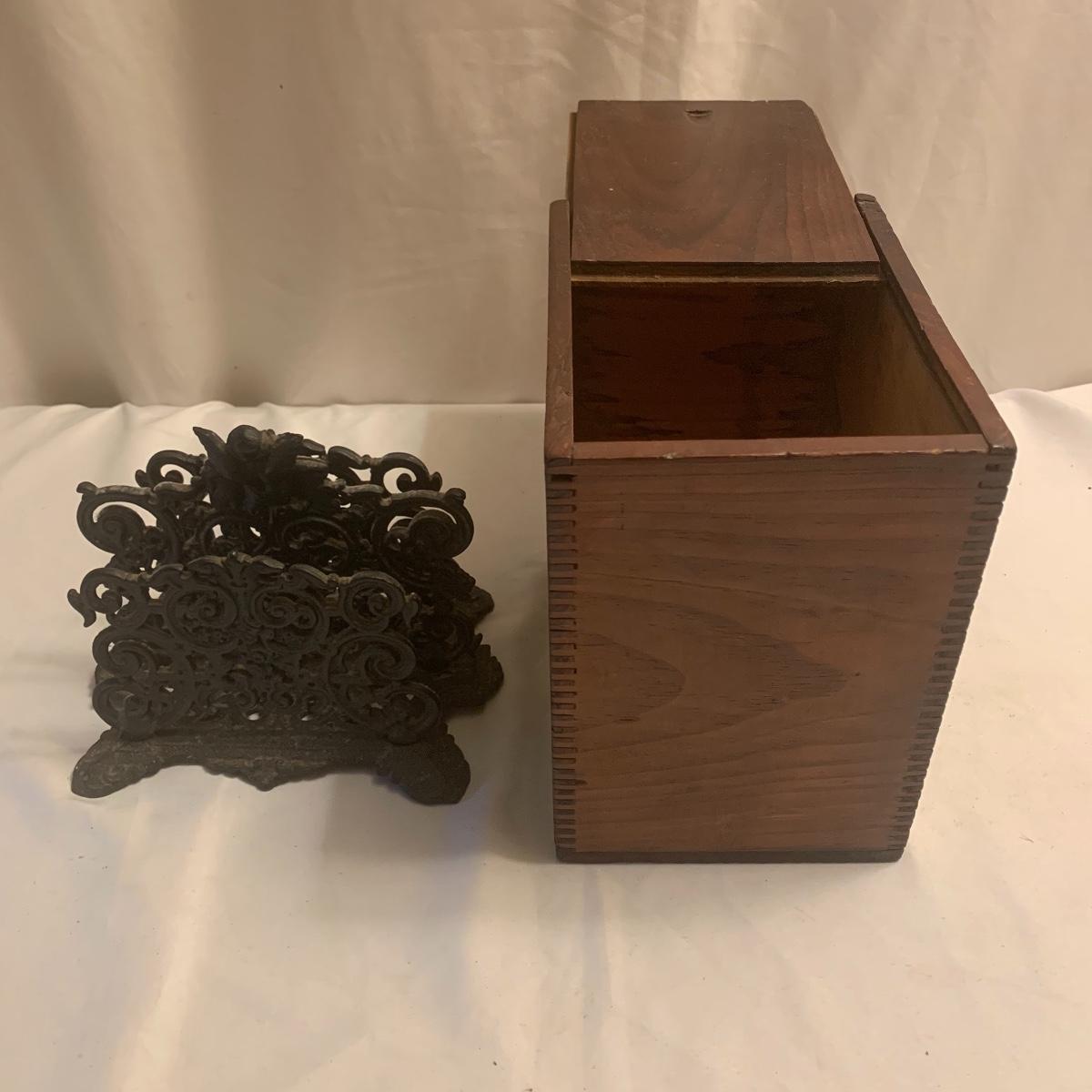 Vintage wooden recipe box measuring 8” wide X 5” deep X 8” tall in good condition. Also included is this iron napkin holder featuring a cherub and intricate designs. Both are in good condition.